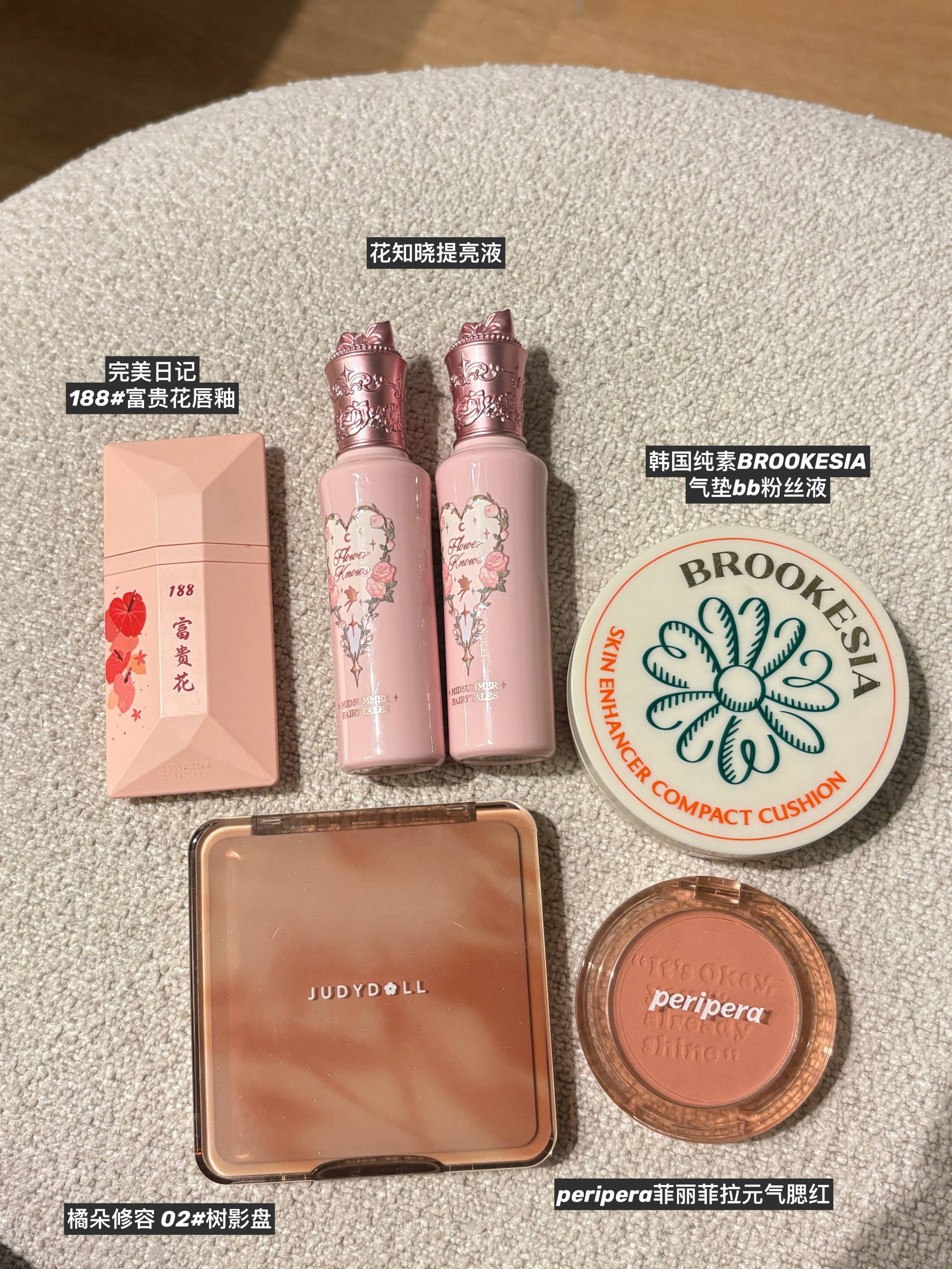 完美日记188#富贵花唇釉,粉调红棕自带贵气buff;花知晓提亮液顶着王冠出场,上脸是清透碎钻光✨ 韩国纯素气垫bb轻薄到像没化妆,橘朵树影盘修容自然得像妈生骨相,还有peripera腮红,嫩得像掐了把水蜜桃~ 这堆上脸直接是“伪素颜美女”剧本,早八人十分钟就能焊死妆面!