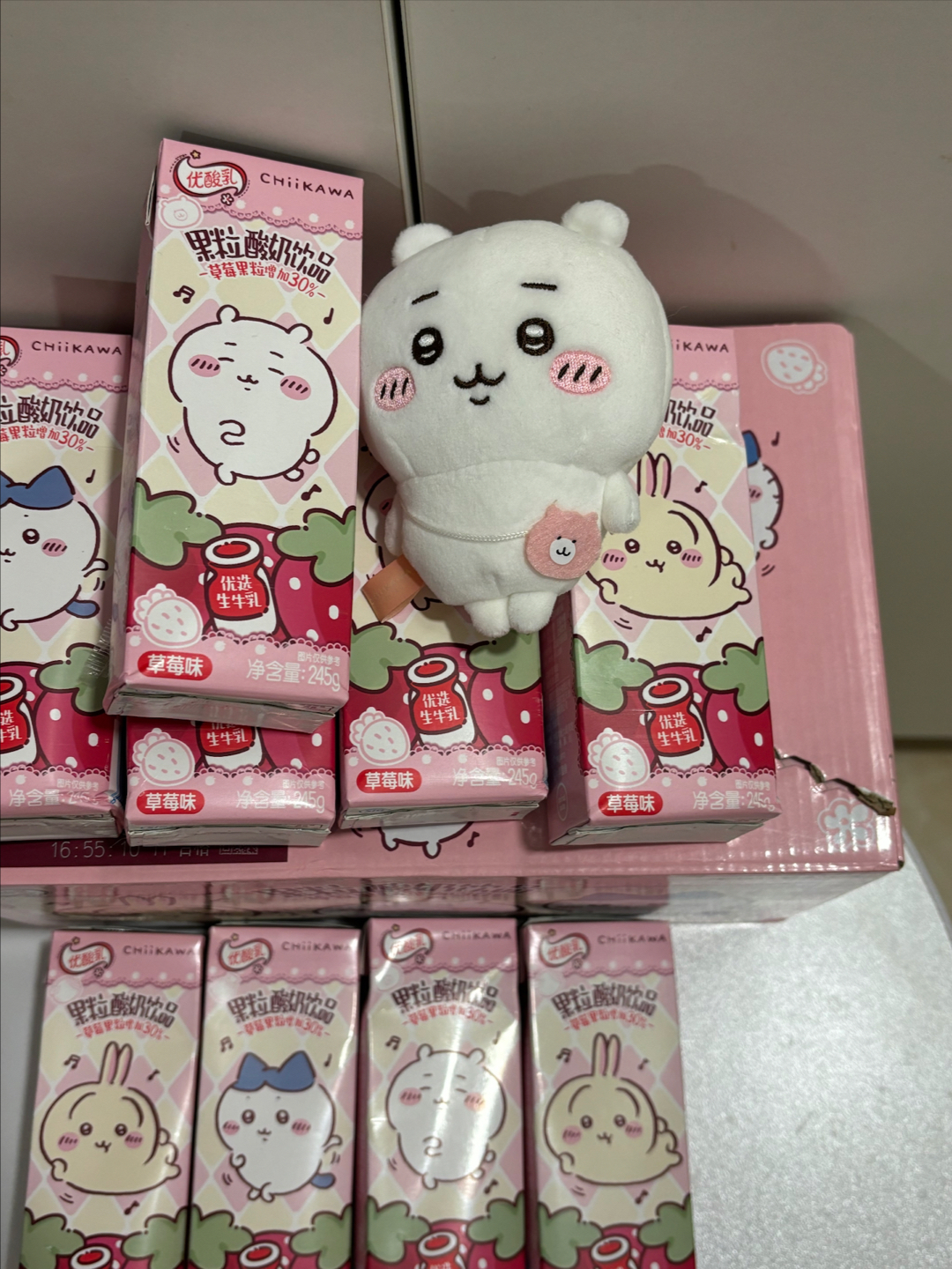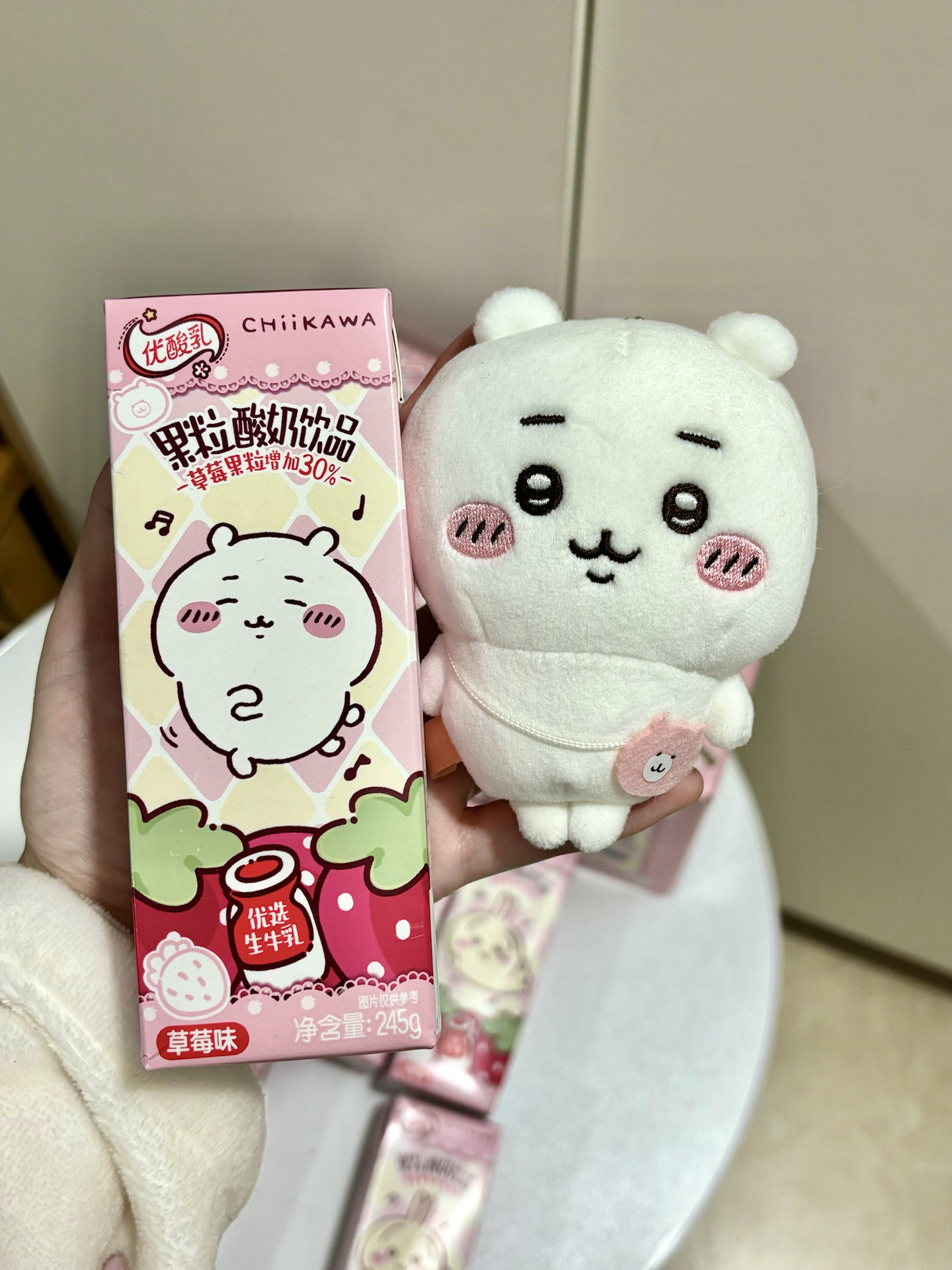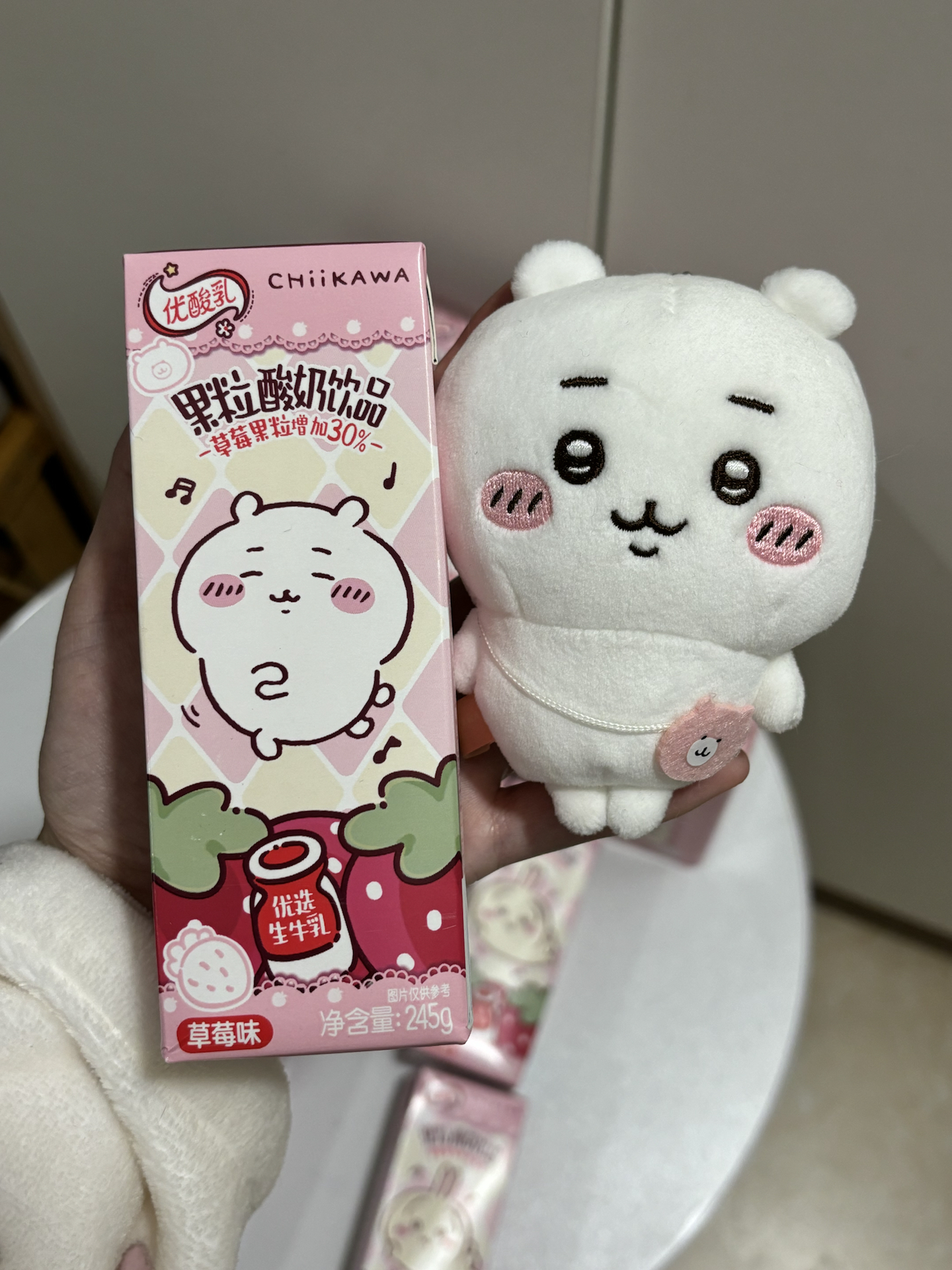 我最近入了伊利和chiikawa联名的优酸乳草莓味🥛,包装粉粉的,和毛绒挂件放一起超有氛围感!每盒245g,草莓果粒还加了30%,喝起来果粒感很足~不过保质期180天,得注意尽快喝完~拿来当礼物送喜欢可爱风的朋友,感觉对方会很开心🥳!