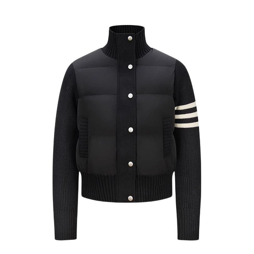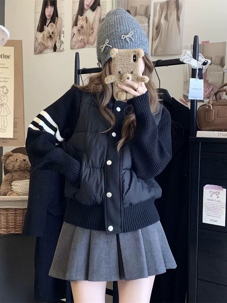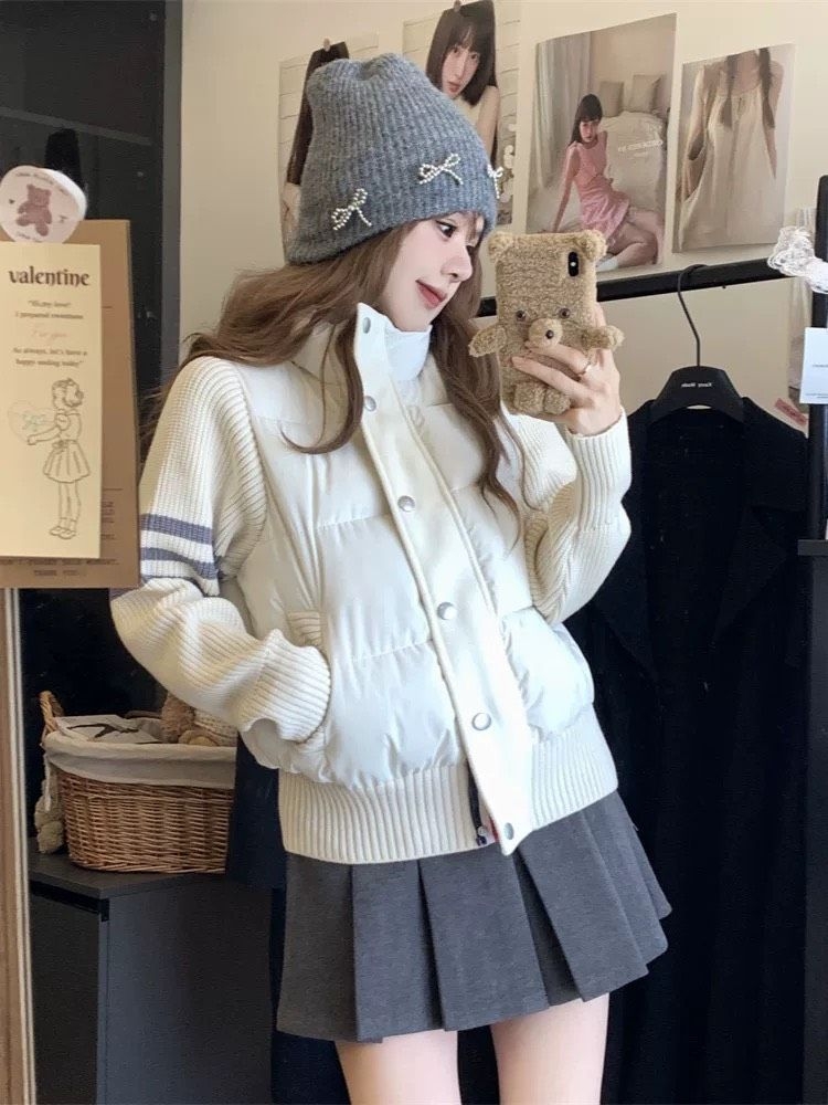 这波冬日甜妹穿搭我先冲了!针织拼接羽绒外套太会了——软乎乎的针织袖+蓬松羽绒身,保暖又不臃肿,米白/黑色都戳中少女心~配灰百褶裙+蝴蝶结针织帽,甜嗲感直接拉满!随手搭个小熊手机壳,冬日氛围感直接焊在身上!