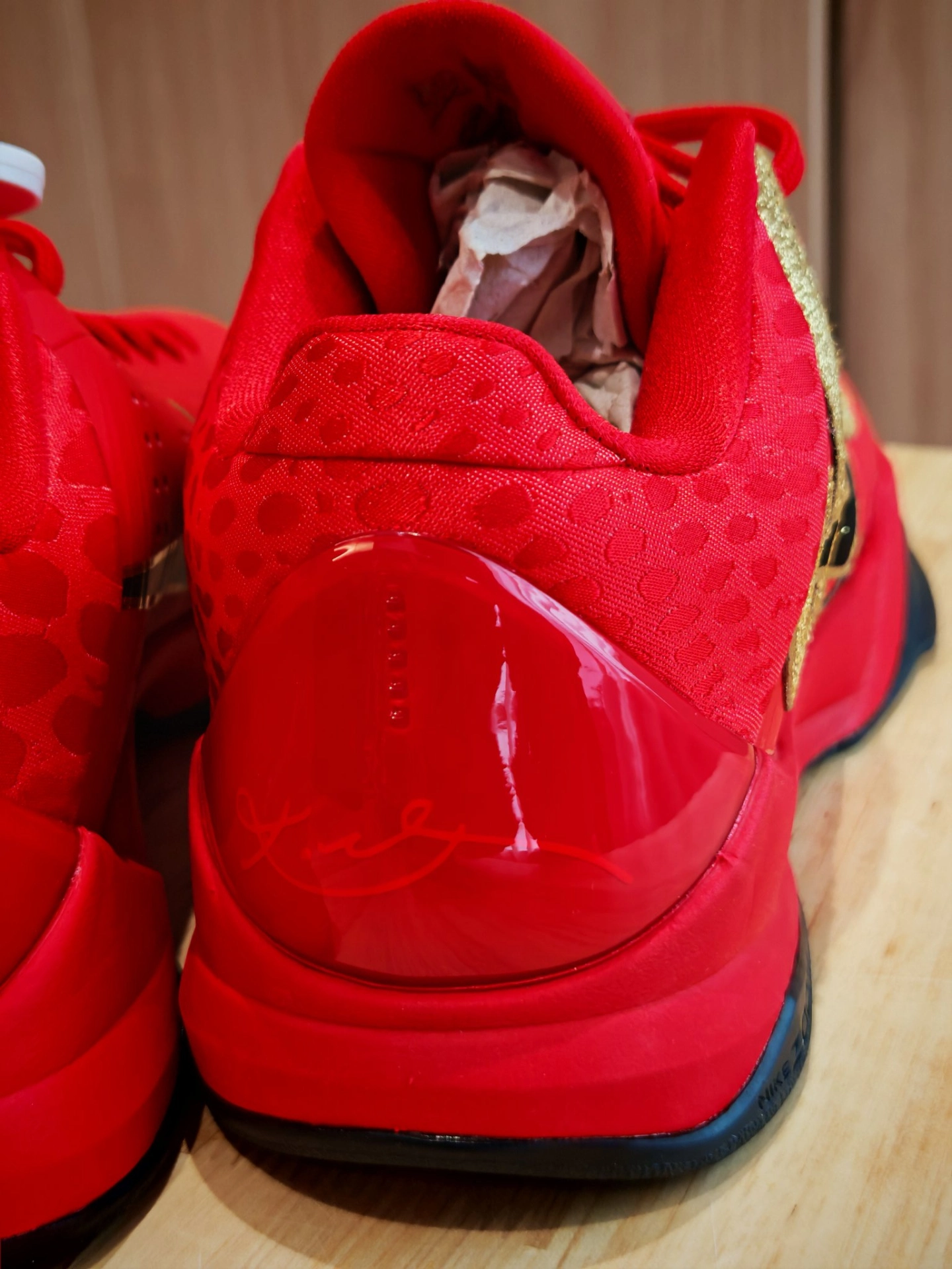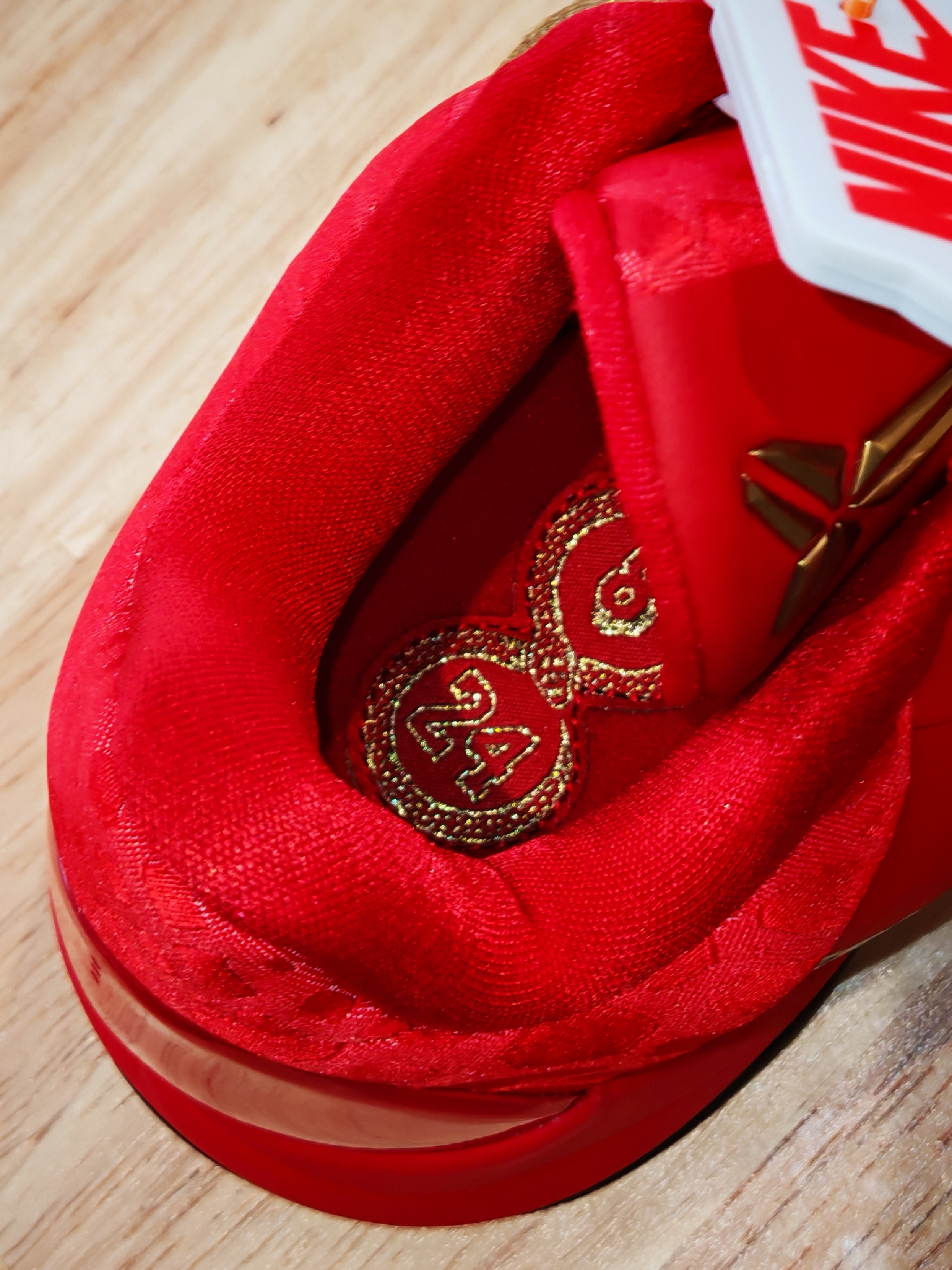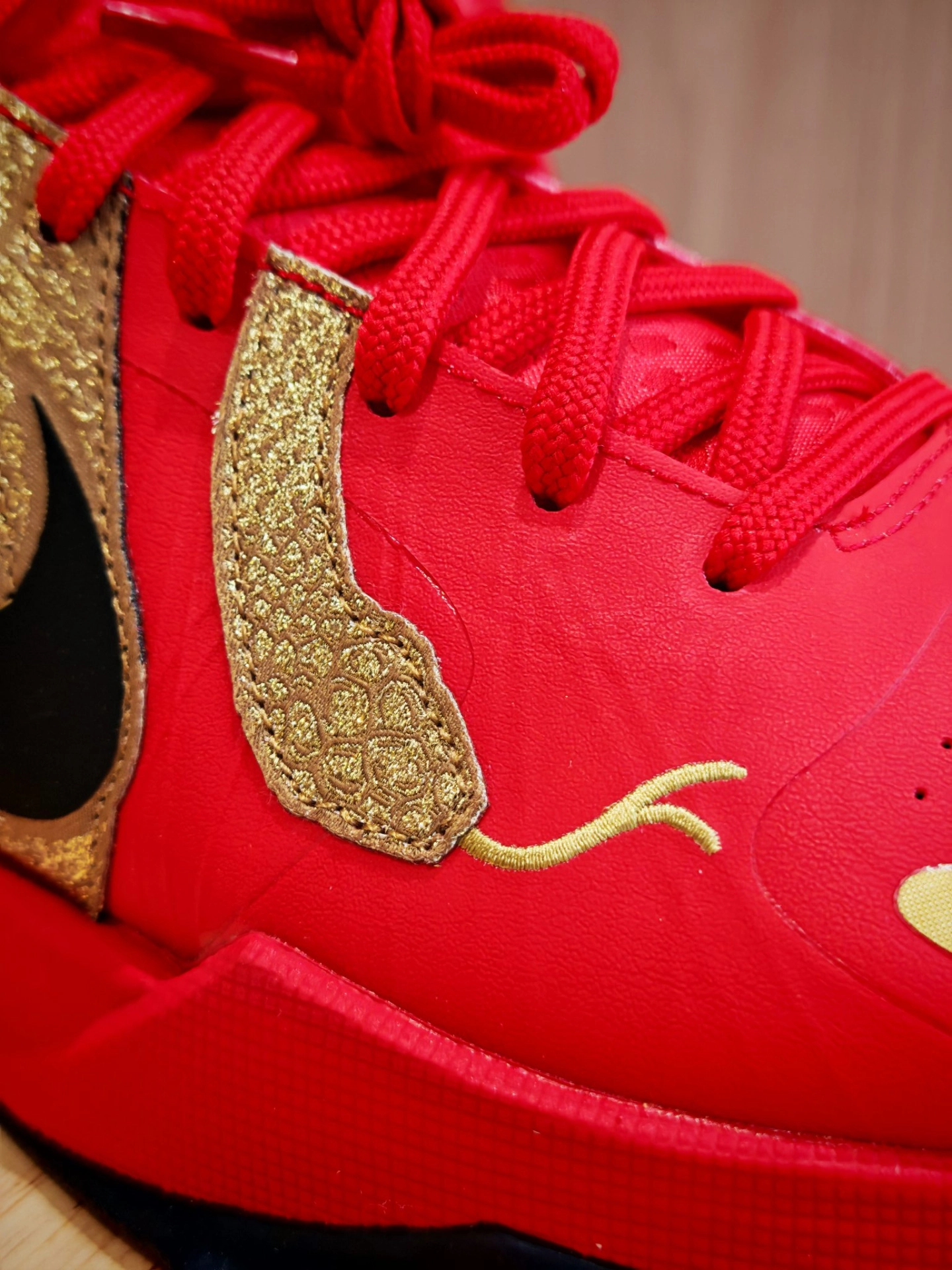 这双科比5“红蛇”拿到手的感觉,比想象中要好。金蛇缠绕,红绸加身,它好像一件艺术藏品。 实物比图片还好看,那个红色很正,不是那种艳红,是有点深度的大学红。鞋身上金色的蛇纹是立体的,摸上去有质感,不是普通印花。鞋垫上印着8和24,后跟还有“曼巴之年”几个小字,细节确实到位。 脚感没得说,前掌那个Zoom Turbo反馈直接,启动不拖沓。低帮设计对脚踝灵活的人很友好,包裹感刚好,不压脚背。说实话,...