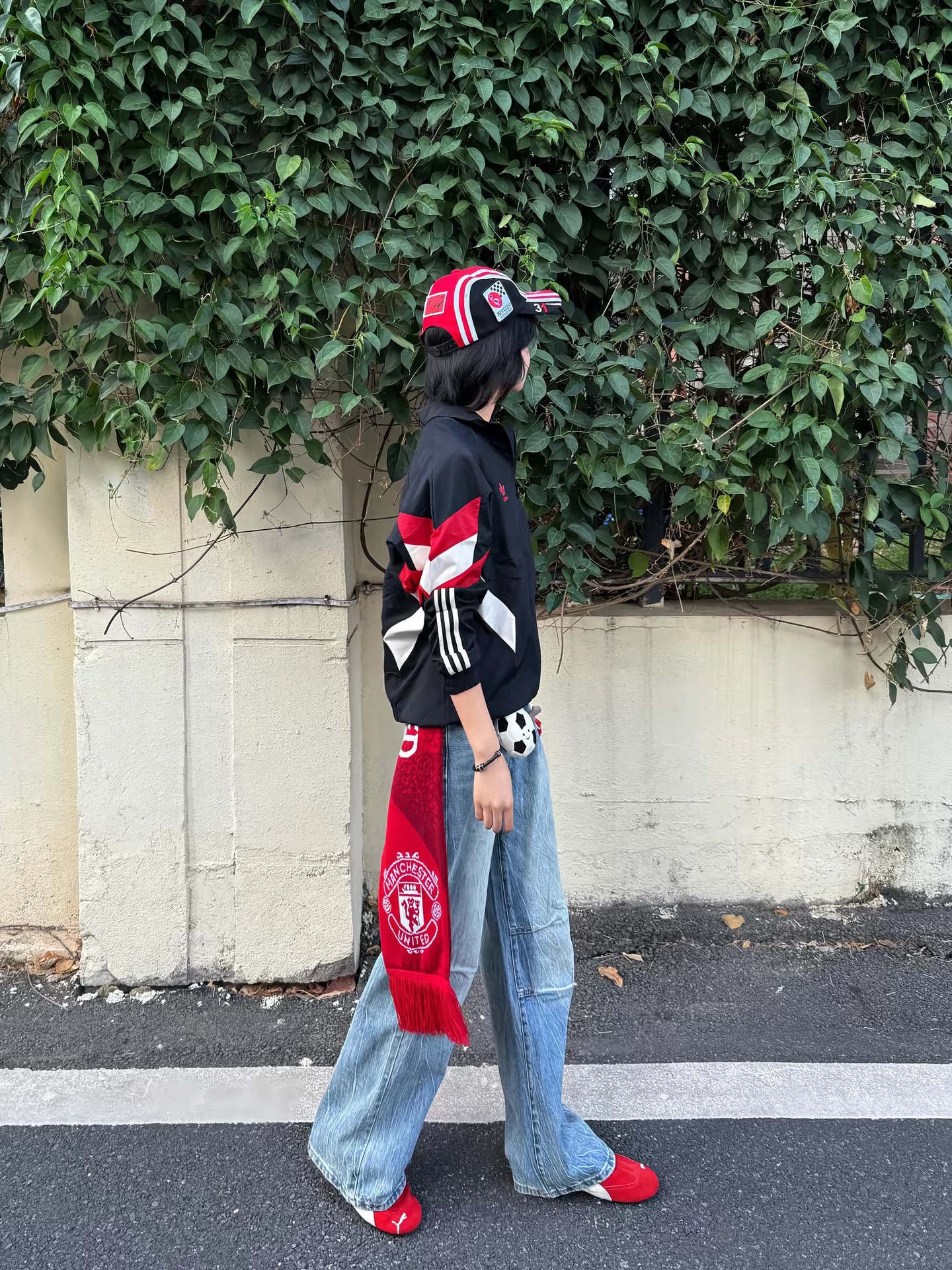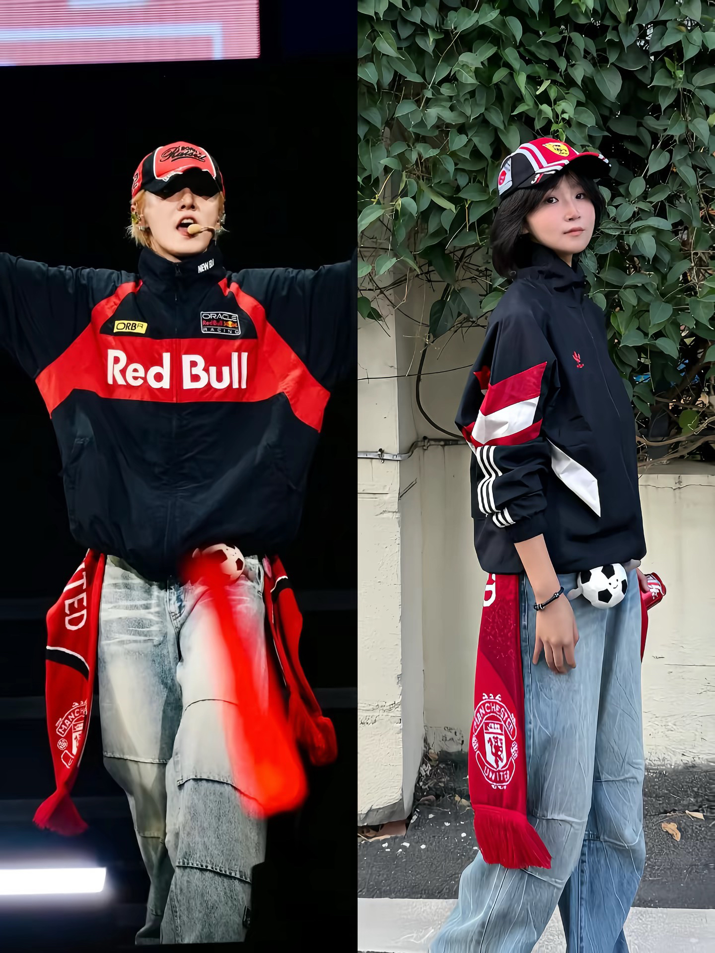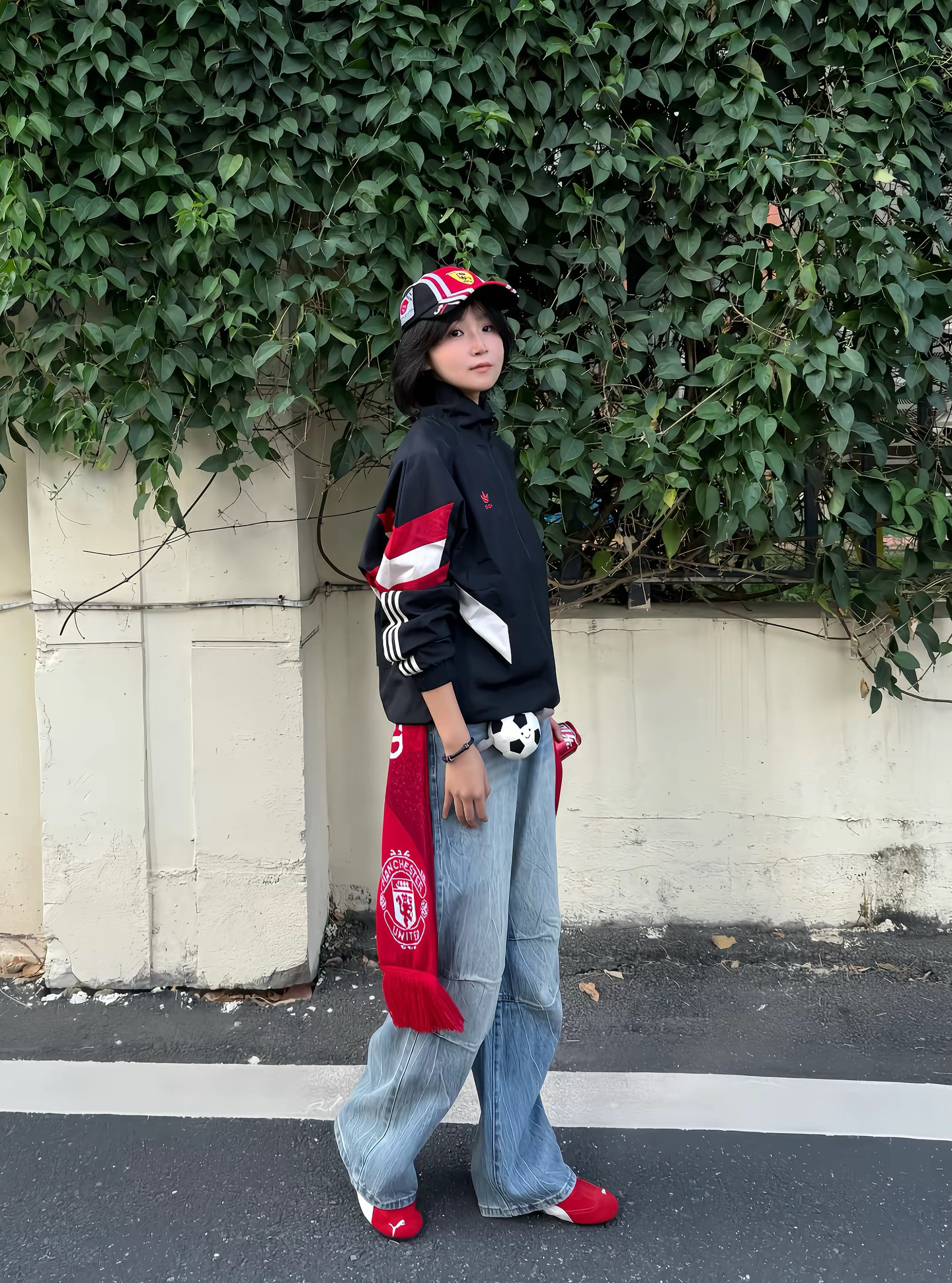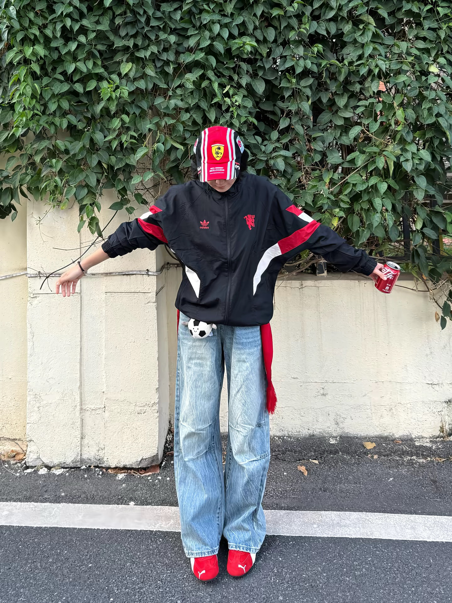 一直觉得球队围巾很难搭 直到看到鹿哥这套 我完全悟了 没有同款 完全没关系 去年买的曼联外套+牛仔裤 搭配Jellycat足球小挂件 红色系的棒球帽+板鞋超美式 分分钟鹿氏穿搭✌️