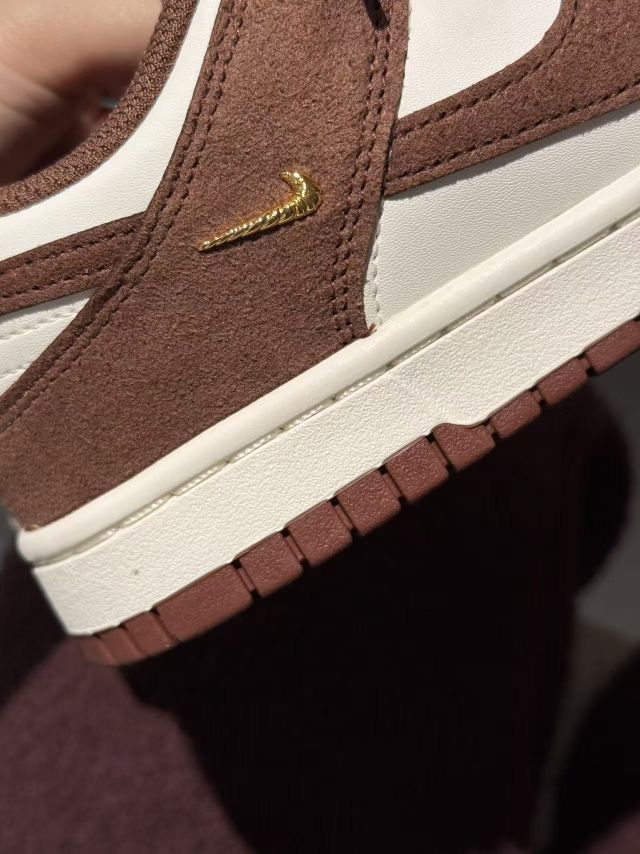 dunk新配色来了细节控狂喜: 鞋头是奶白荔枝纹皮(好打理!),鞋身是棕咖麂皮,拼接得巨有质感❤️ 勾子是同色系深浅撞色,鞋底的棕边和整体呼应,连鞋带都是同色的,细节太统一了 脚感是Dunk常规的舒适,麂皮部分摸起来软乎乎的,秋冬穿也不冷🥶 搭配思路直接抄:深棕直筒牛仔裤+白T恤,日常通勤随便穿都好看✨