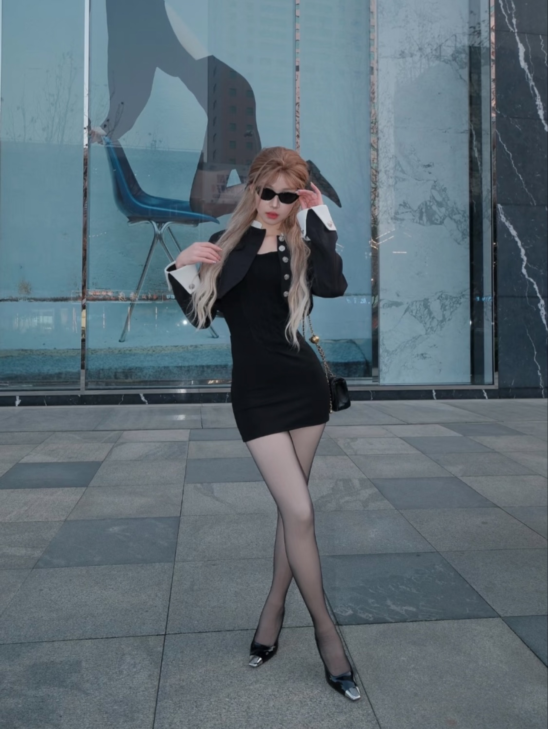 🕶️黑色猫眼墨镜一戴,气场两米八!再挎上黑色链条小包,细节感拉满,和整体穿搭风格完美呼应,精致又不失格调~