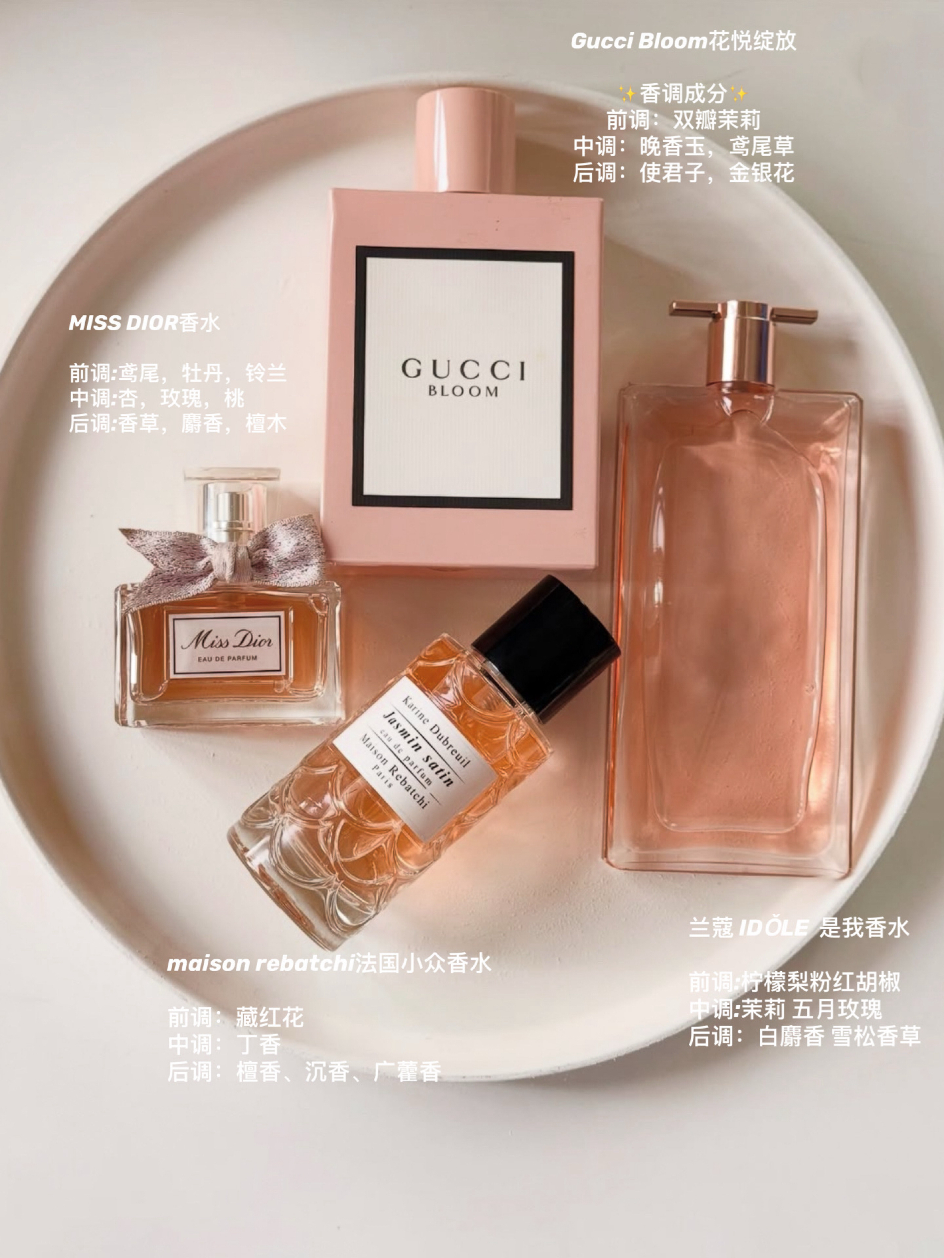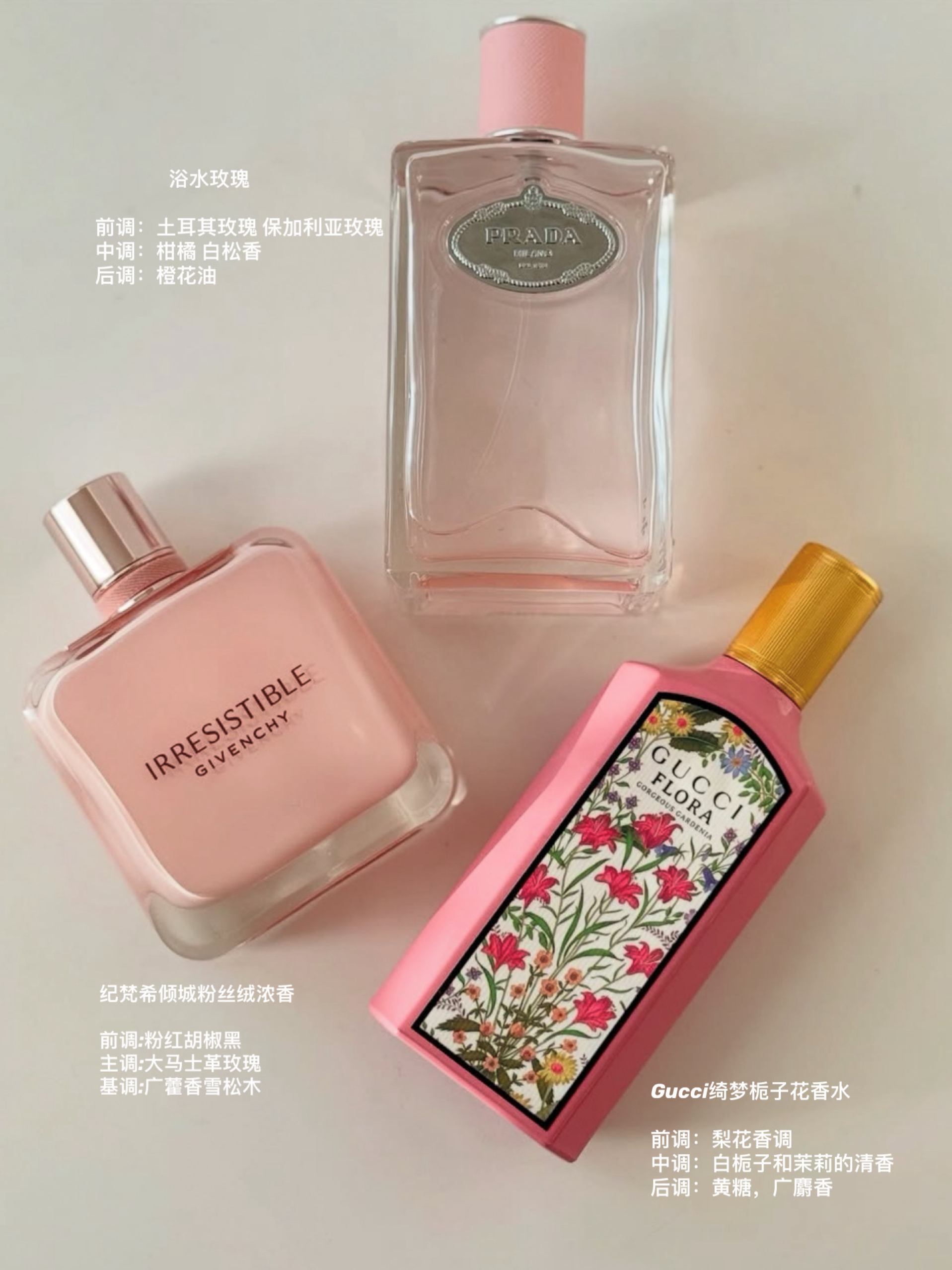 Prada浴水玫瑰是刚揉碎的鲜玫瑰香,纪梵希倾城粉丝绒甜得高级不腻,Gucci绮梦栀子像把白栀子揣在兜里;Gucci Bloom是温柔的晚香玉,兰蔻IDOLE甜中带飒,Maison小众香藏红花调冷艳又特别;Moschino小熊瓶颜值能当摆件,喷上是软乎乎的花果香;香奈儿巴黎里维埃拉像咬了口橘子汽水,清爽到能腌入味。