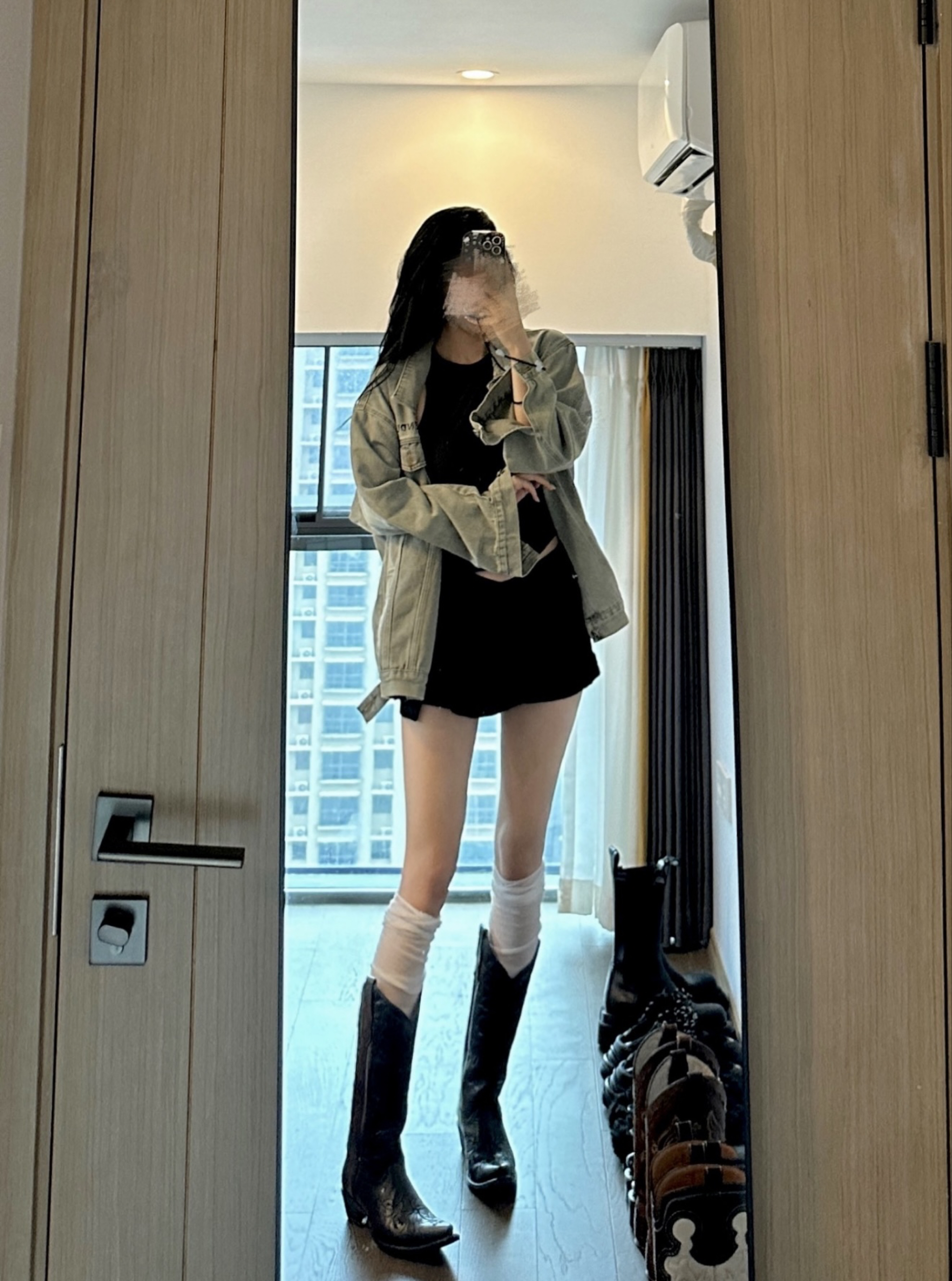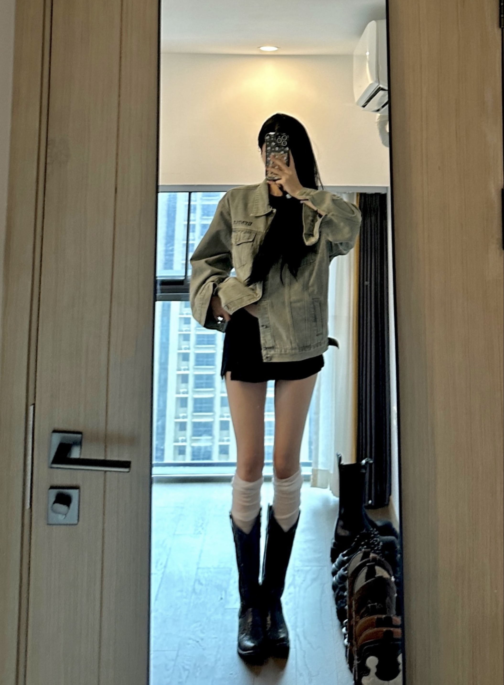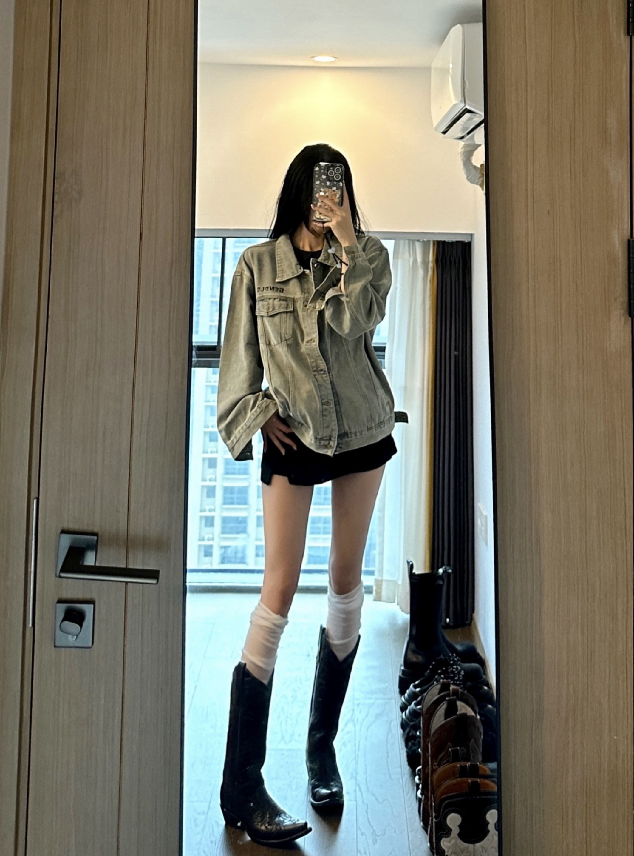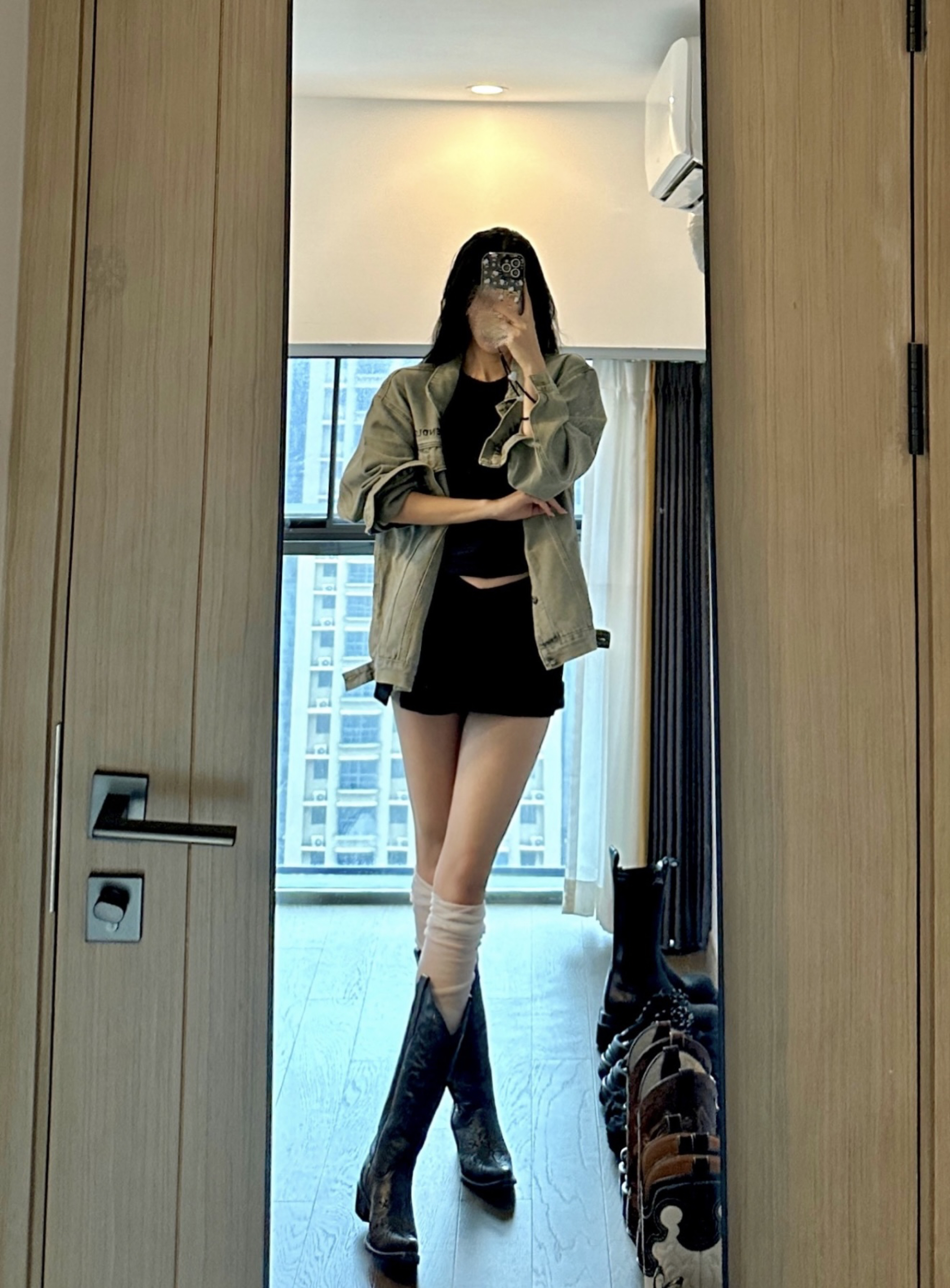 美式辣妹🔥 牛仔外套尊嘟太适合秋天 内搭All black搭配黄泥色复古水洗牛仔外套又酷又飒 上身舒适度也蛮高 衣服整体不厚重 贴身穿也可以 搭配西部牛仔靴包帅的~