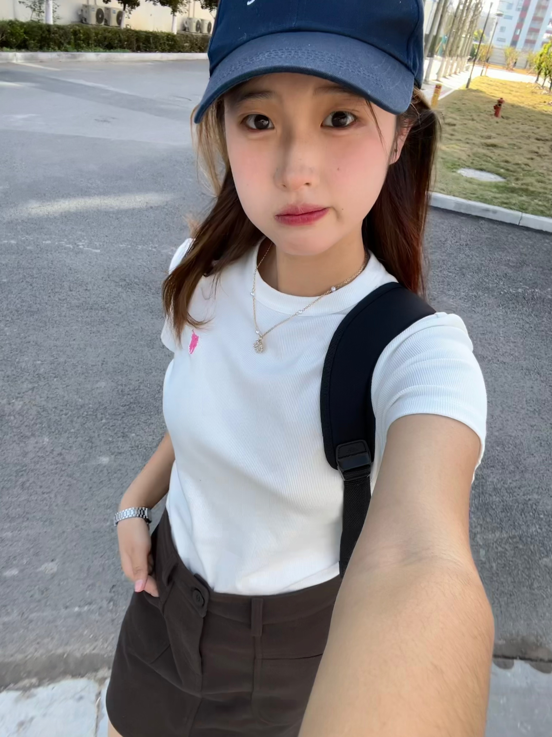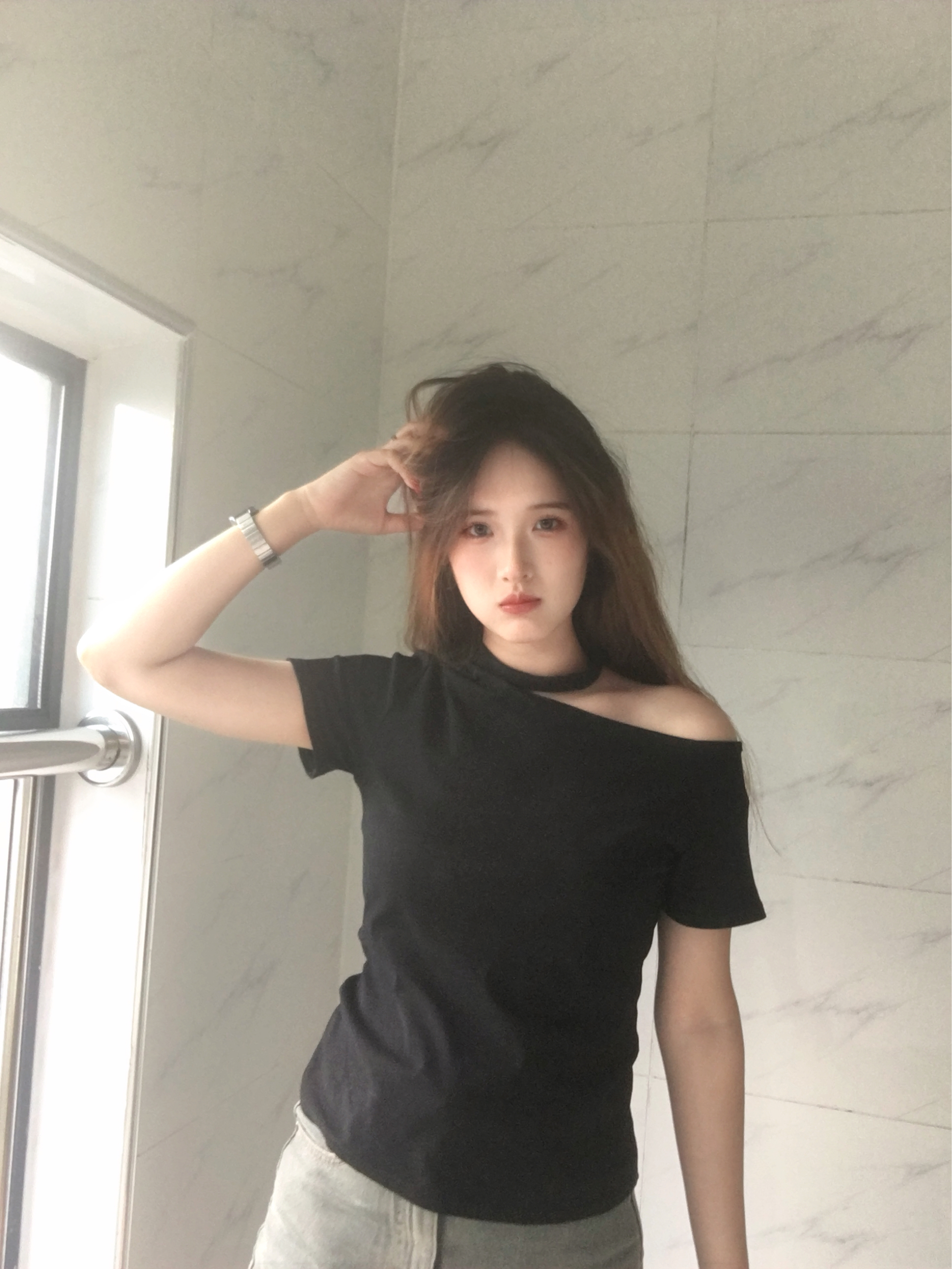 这件黑T的斜肩+挂脖设计太戳我! 简约款但细节显质感,搭牛仔裙清爽又耐看, 日常穿氛围感直接拉满~