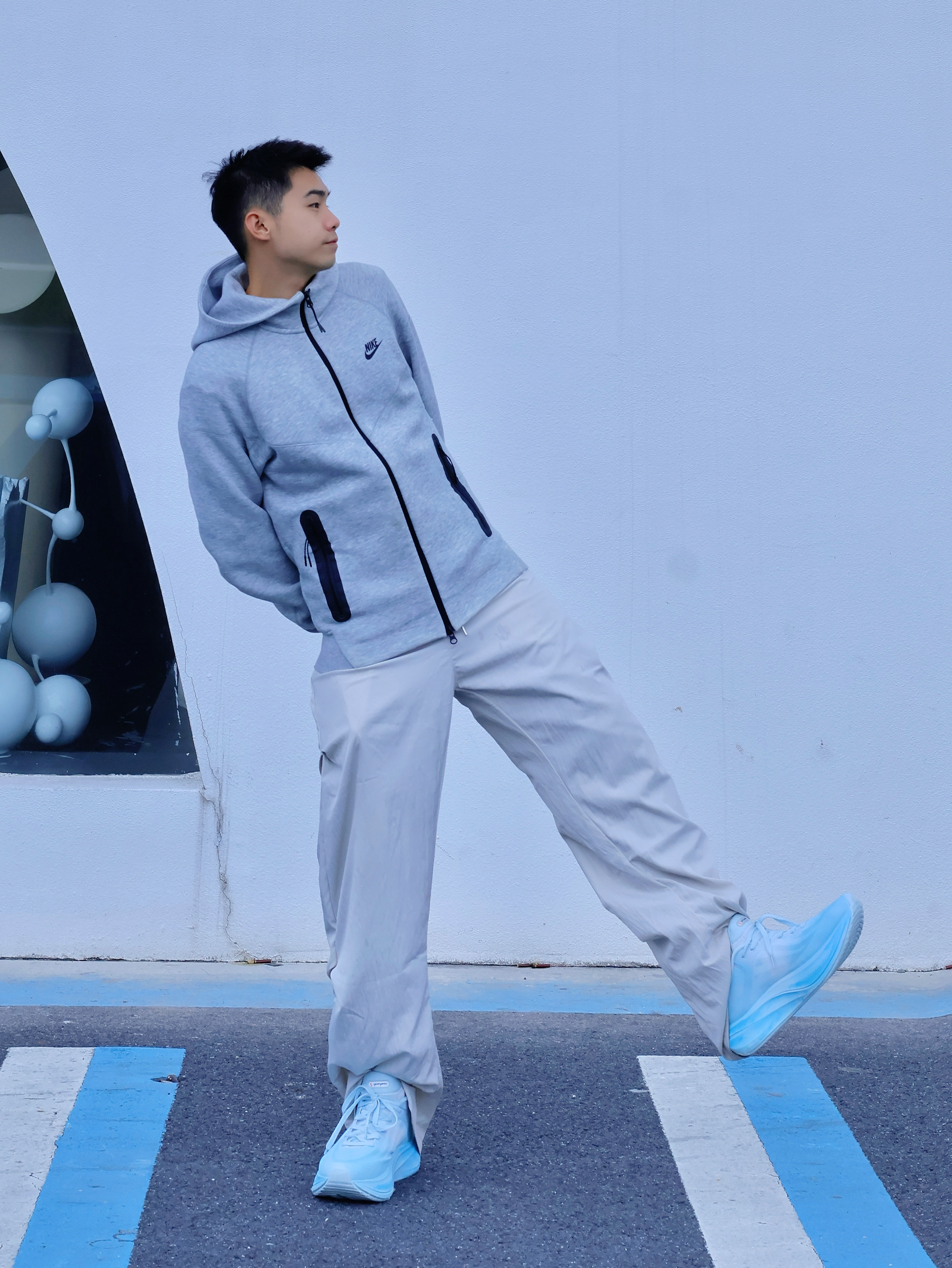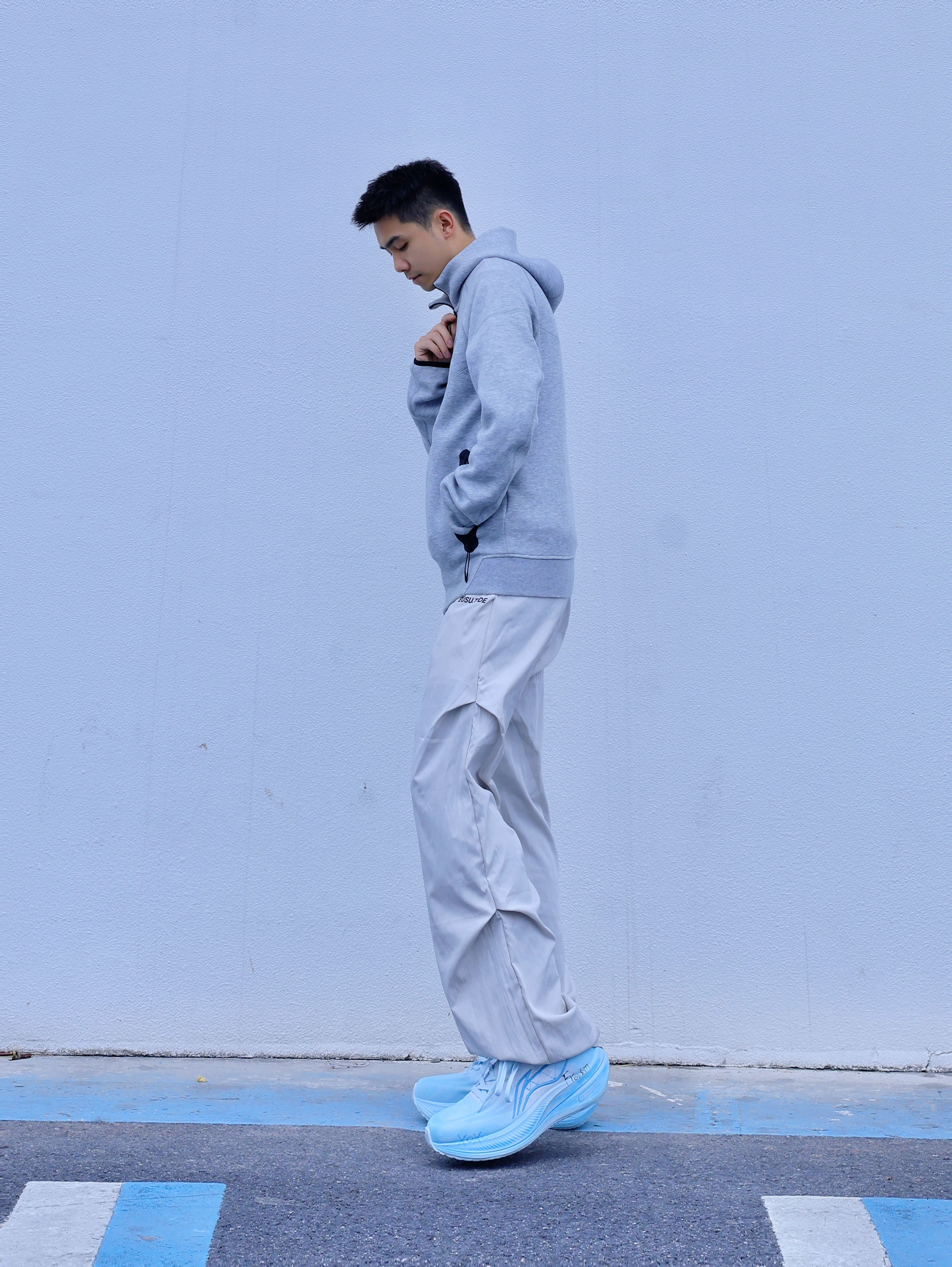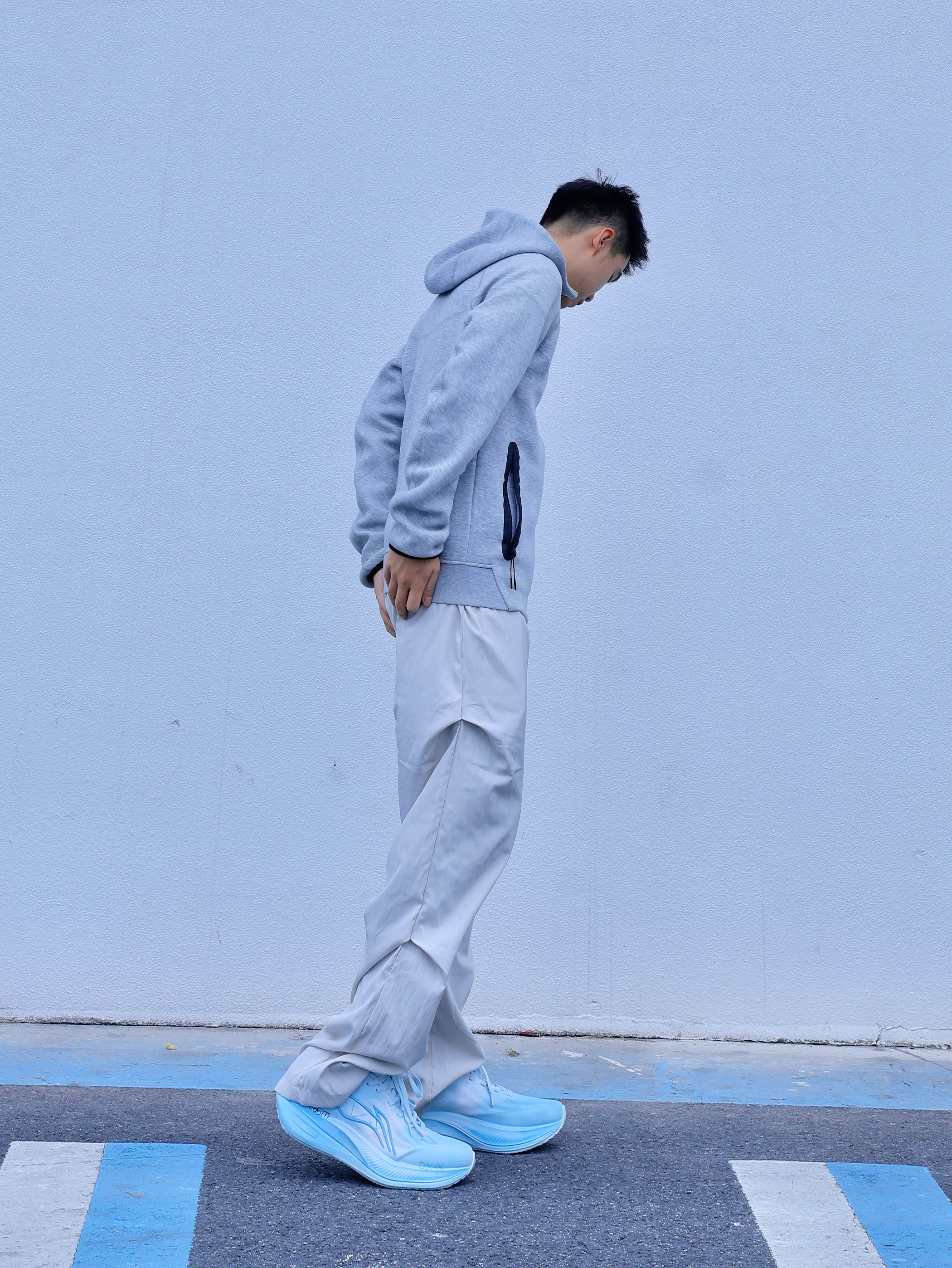 想要简约好看的穿搭 除了一身黑一身白 还有低饱和度穿搭 灰色系一般是我的首选 灰色基础卫衣外套搭配同色系弯刀裤 更显简约干净 鞋子选择了李宁的越影系列,脚感也不错 白蓝的配色好清新 是我蛮喜欢的🩵蓝天白云的配色☁️ 整体就突出一个简约感 通勤或出街都能轻松驾驭~