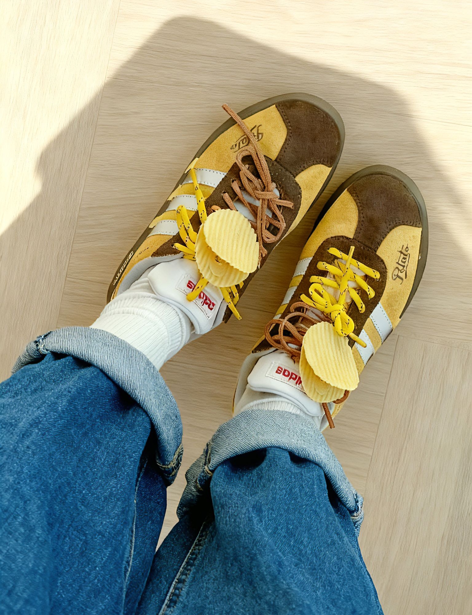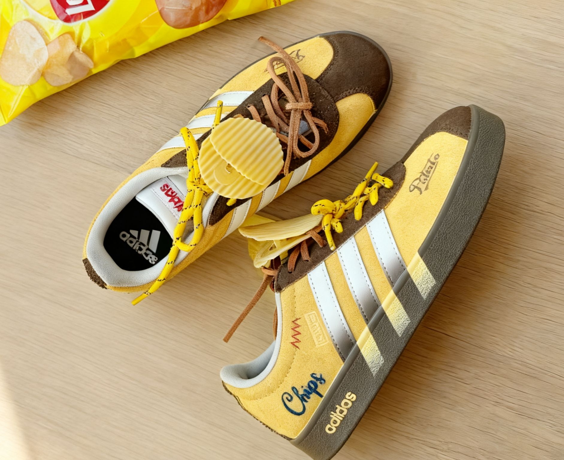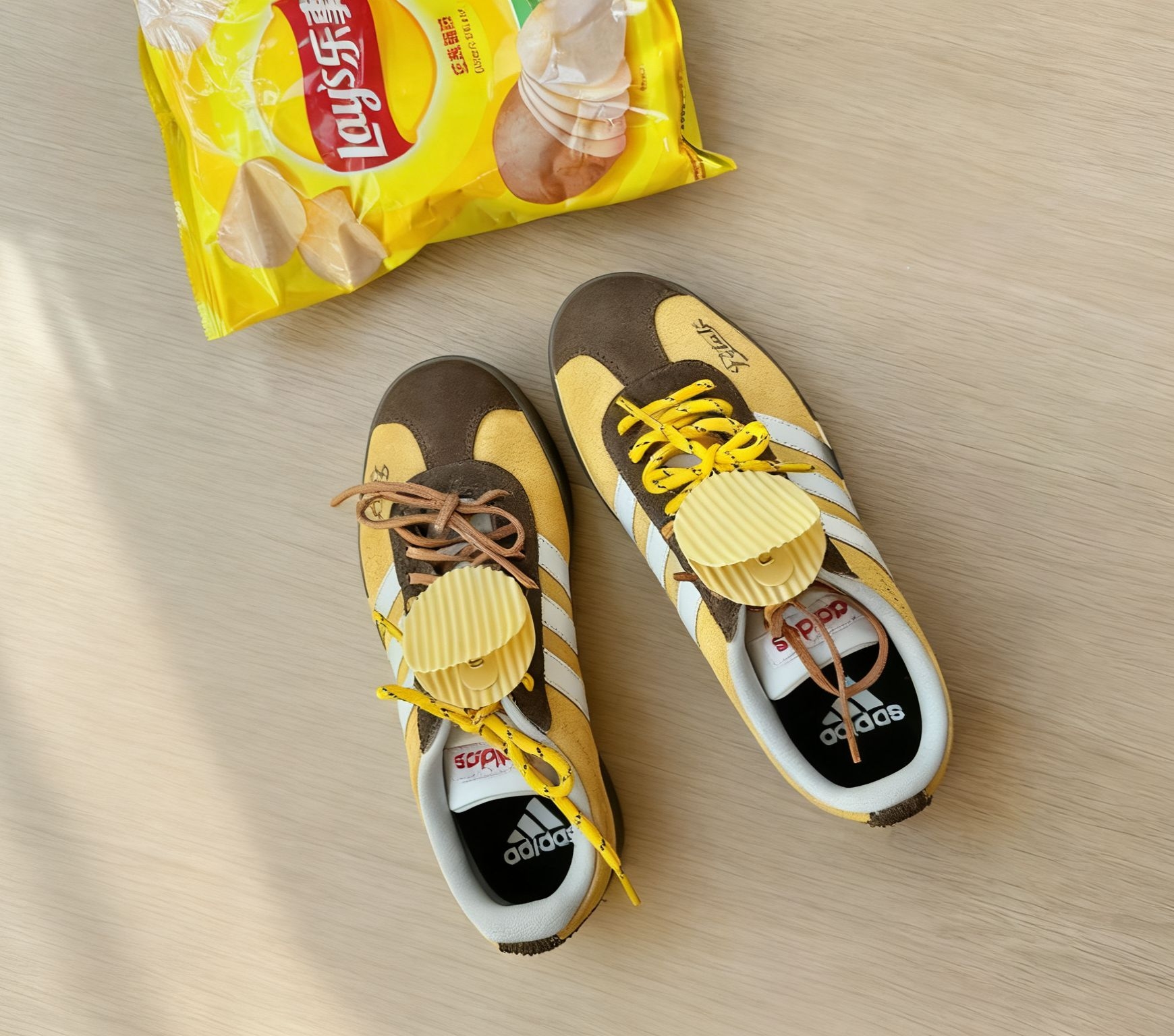 拿到手的这双adidas薯片鞋刚拆的时候,直接给看愣了✨这配色也太懂少女心了吧! 先说鞋面,是那种暖乎乎的橙黄调,还带着点像乐事原味🌮️边边的小波纹纹理,配上三条干净的白杠,往那包薯片旁边一放,活脱脱就是“球鞋版🌮️”!鞋带上还挂了个立体的薯片装饰,摸起来软乎乎带着脆片的纹路,低头系鞋带的时候,总错觉下一秒能闻到咸香的薯片味儿,越看越喜欢。 码数也正常,我平时穿37码,这双直接按正常码入的,上...