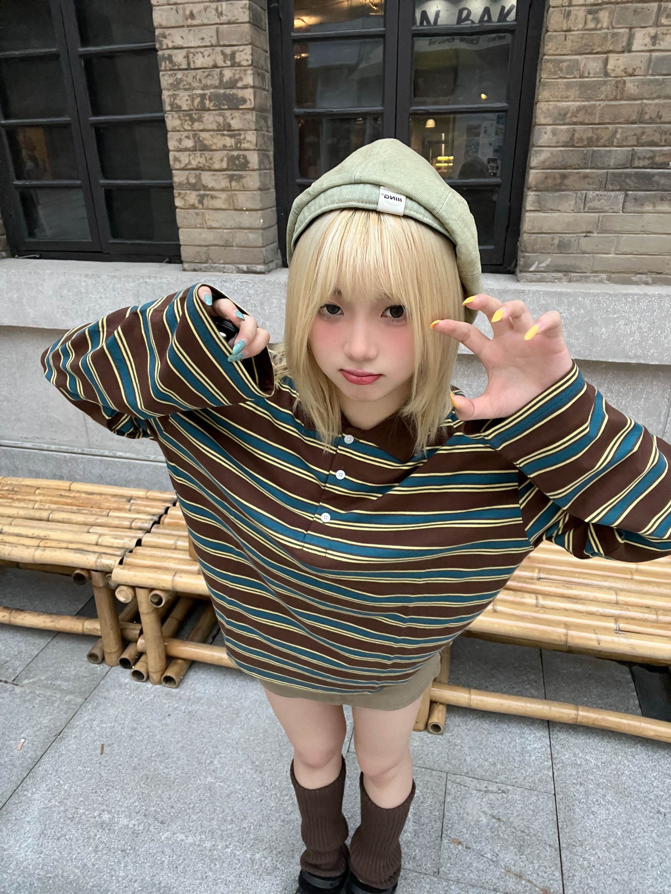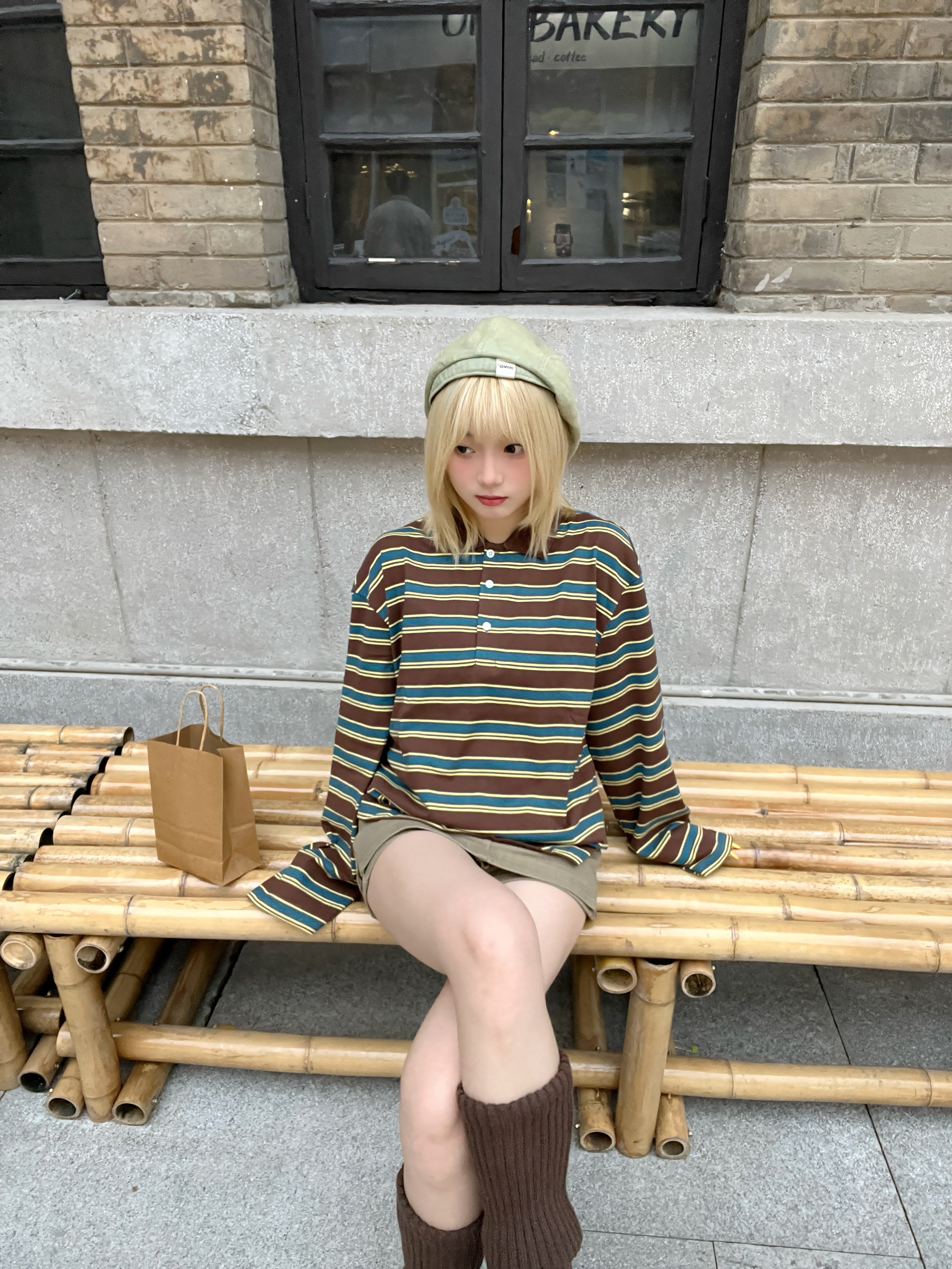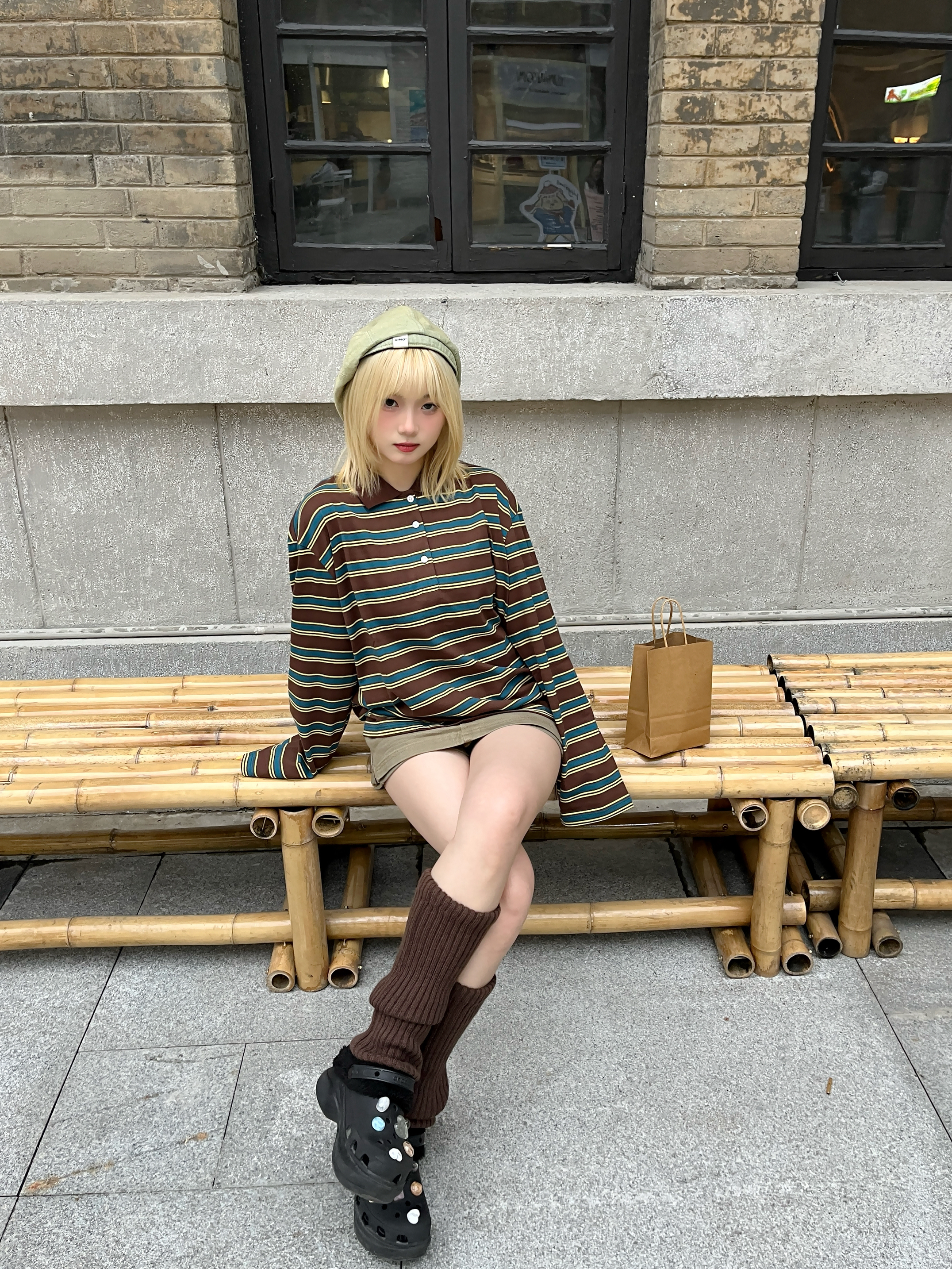 这次是真的很美式了! 撞色条纹polo衫和短裙的的搭配 水洗复古的贝雷帽和堆堆袜套正好跟衣服颜色呼应 色彩搭配一整个很复古