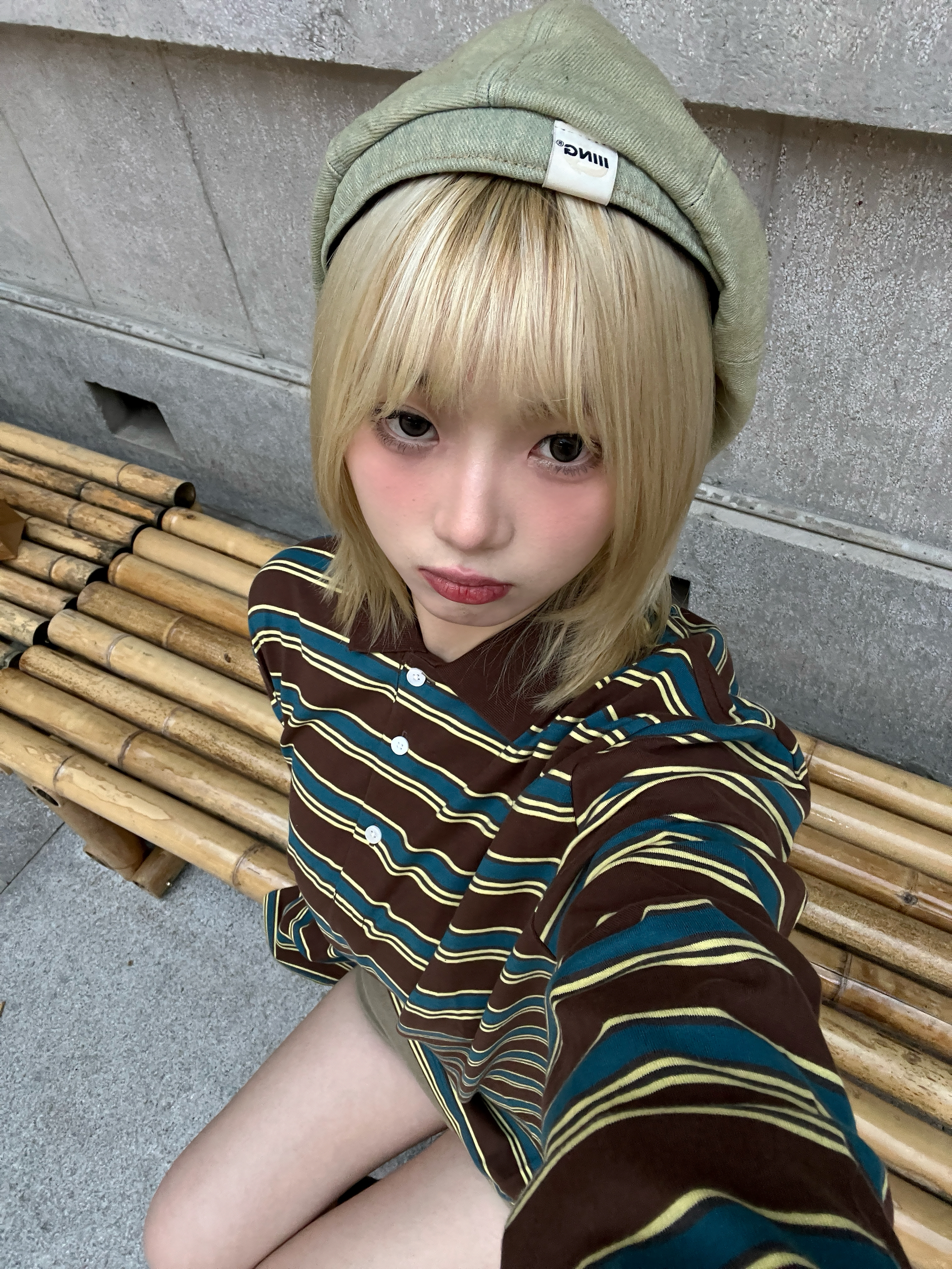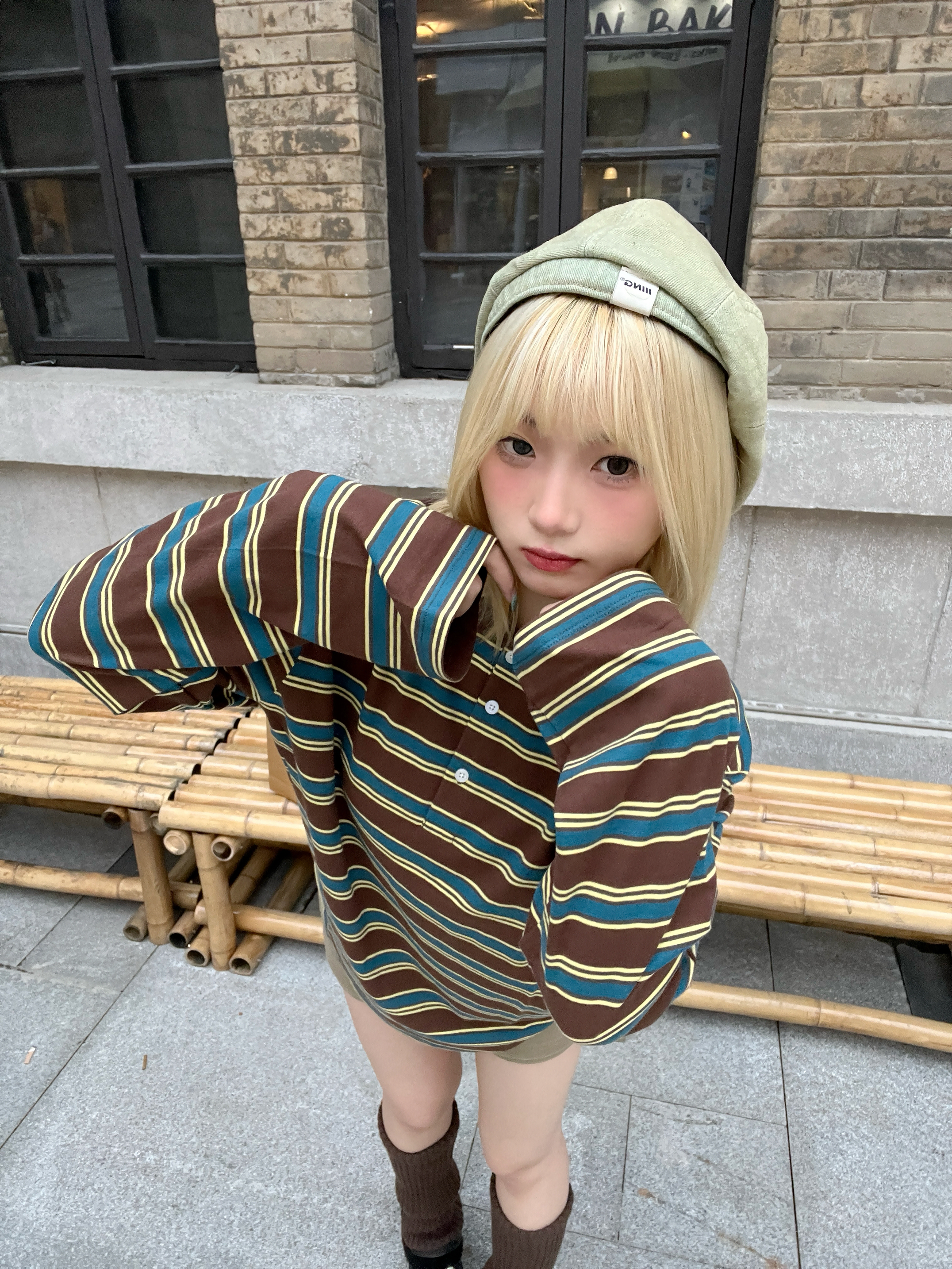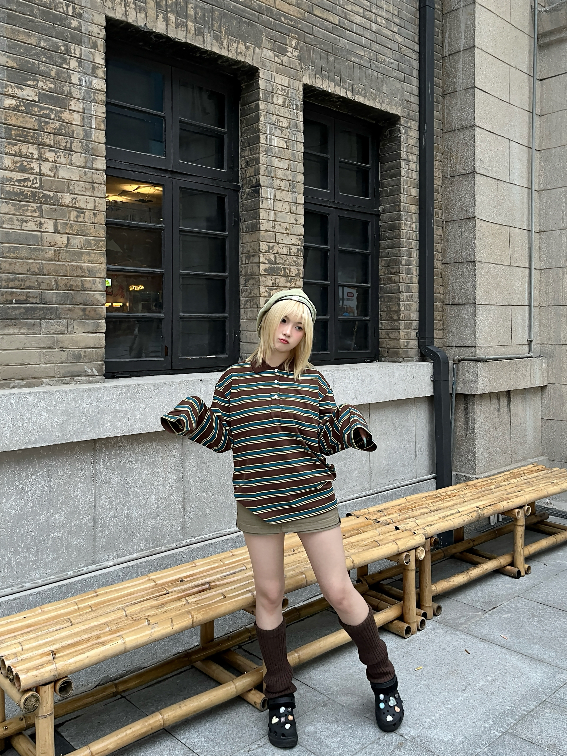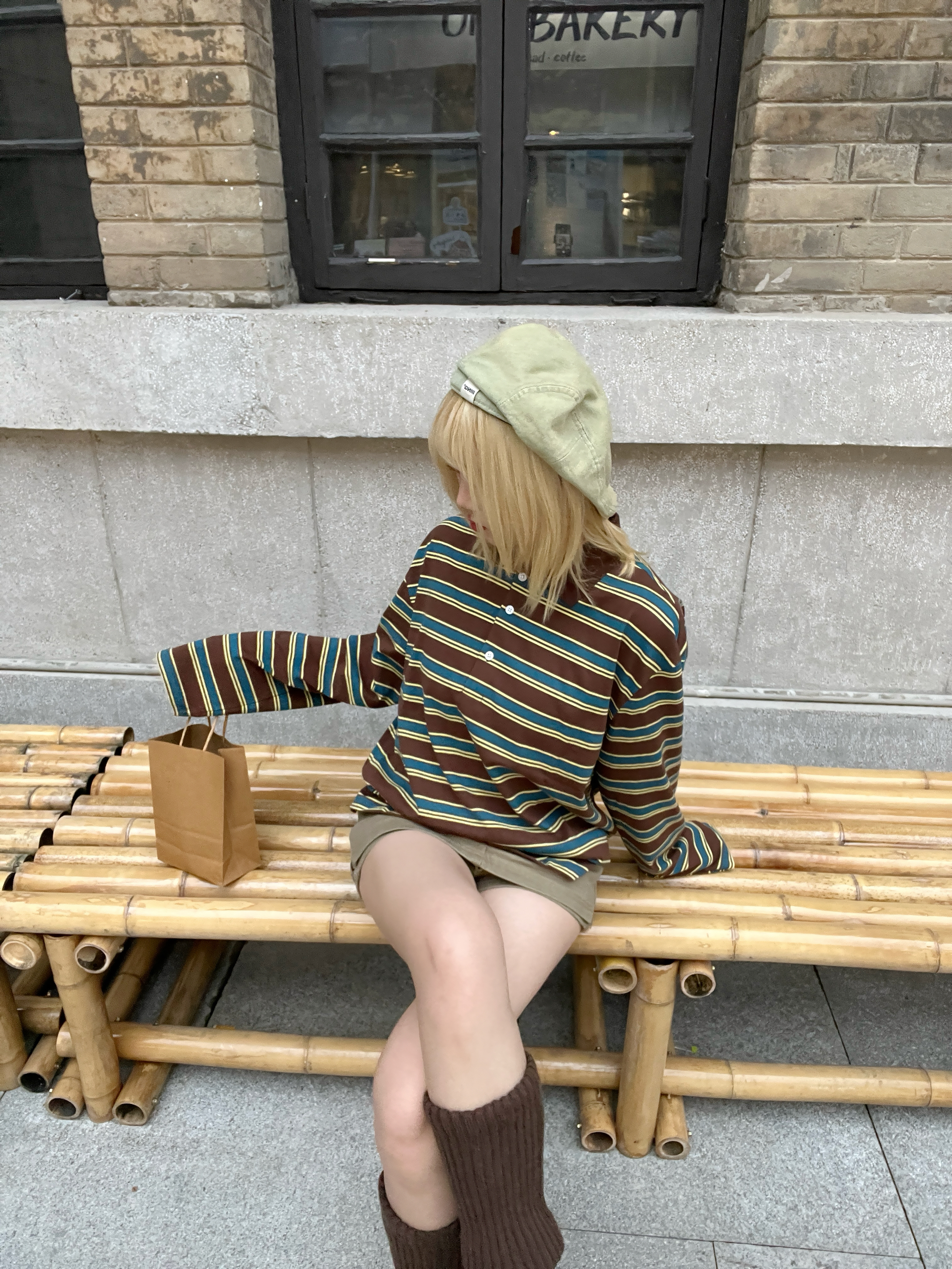 这次是真的很美式了! 撞色条纹polo衫和短裙的的搭配 水洗复古的贝雷帽和堆堆袜套正好跟衣服颜色呼应 色彩搭配一整个很复古