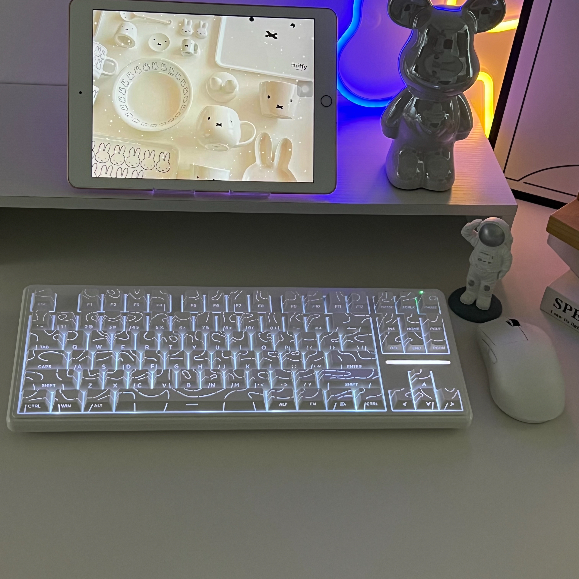 我最近挖到个很适合学生党、租房党布置桌面的数码小物件!它的RGB灯光模式还挺多,晚上开着灯打字,氛围感直接拉满✨~87键的紧凑布局,放在宿舍桌上不占地方,连Mac和Windows系统都能兼容,我换设备用也没压力。不过它是薄膜键盘,要是追求机械轴体那种段落感的话,可能得再考虑下。但日常码字、偶尔玩玩小游戏,手感还是很舒服的,价格也很平价,学生党想打造氛围感桌面可以试试👏!
