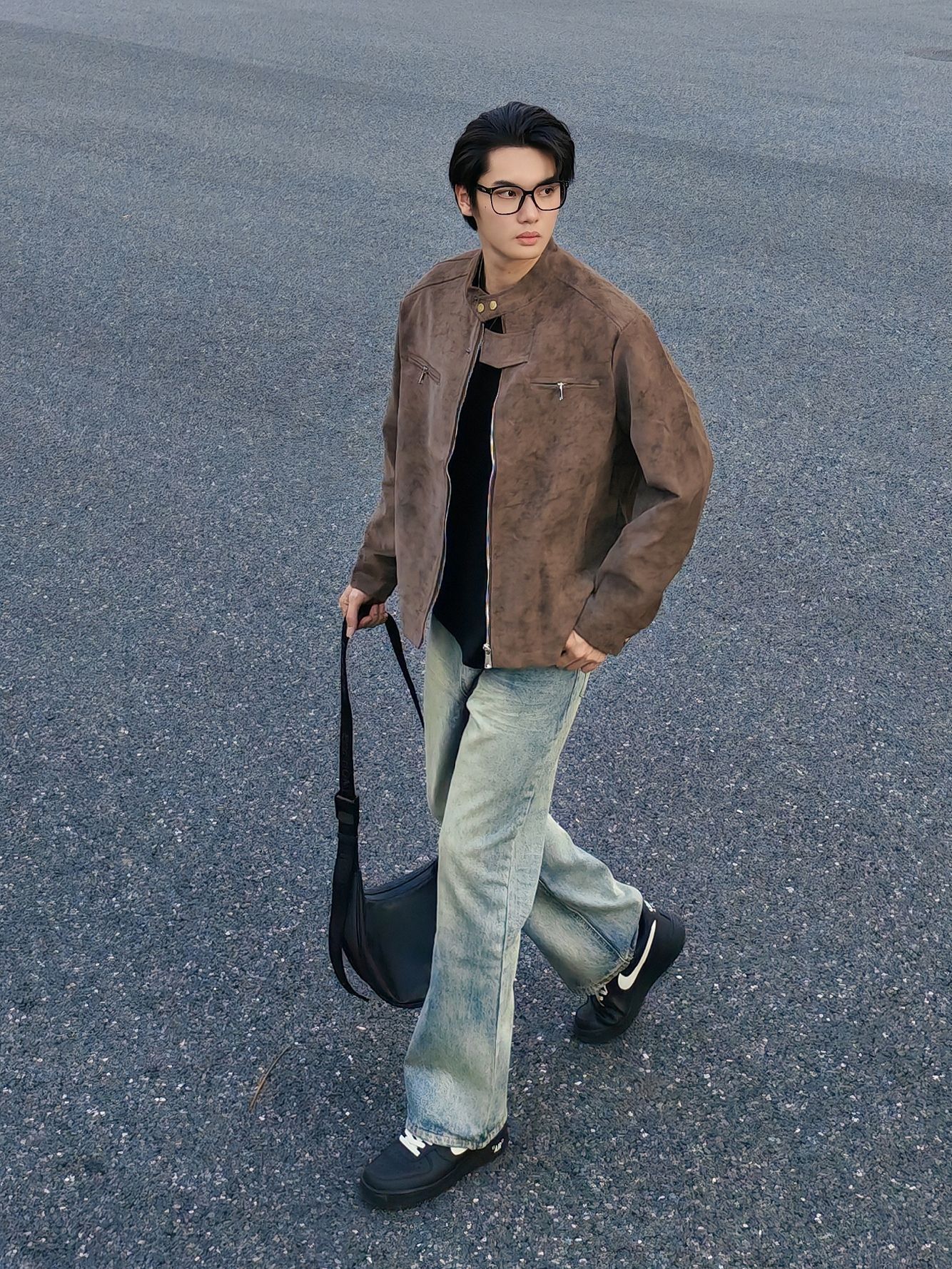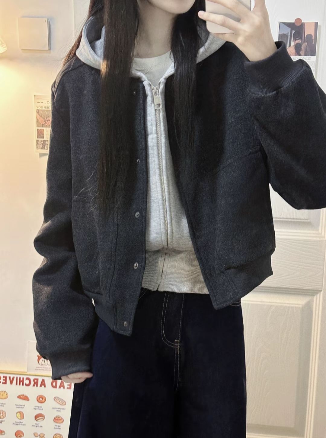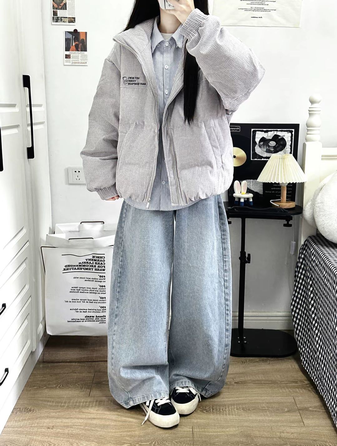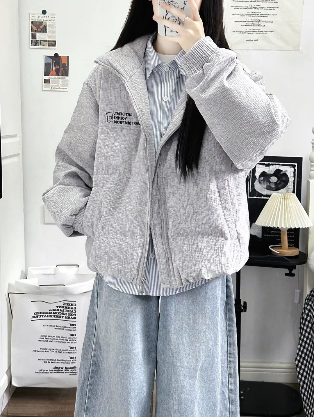 灰色灯芯绒羽绒服➕衬衫叠穿真的干干净净就很帅!❄️