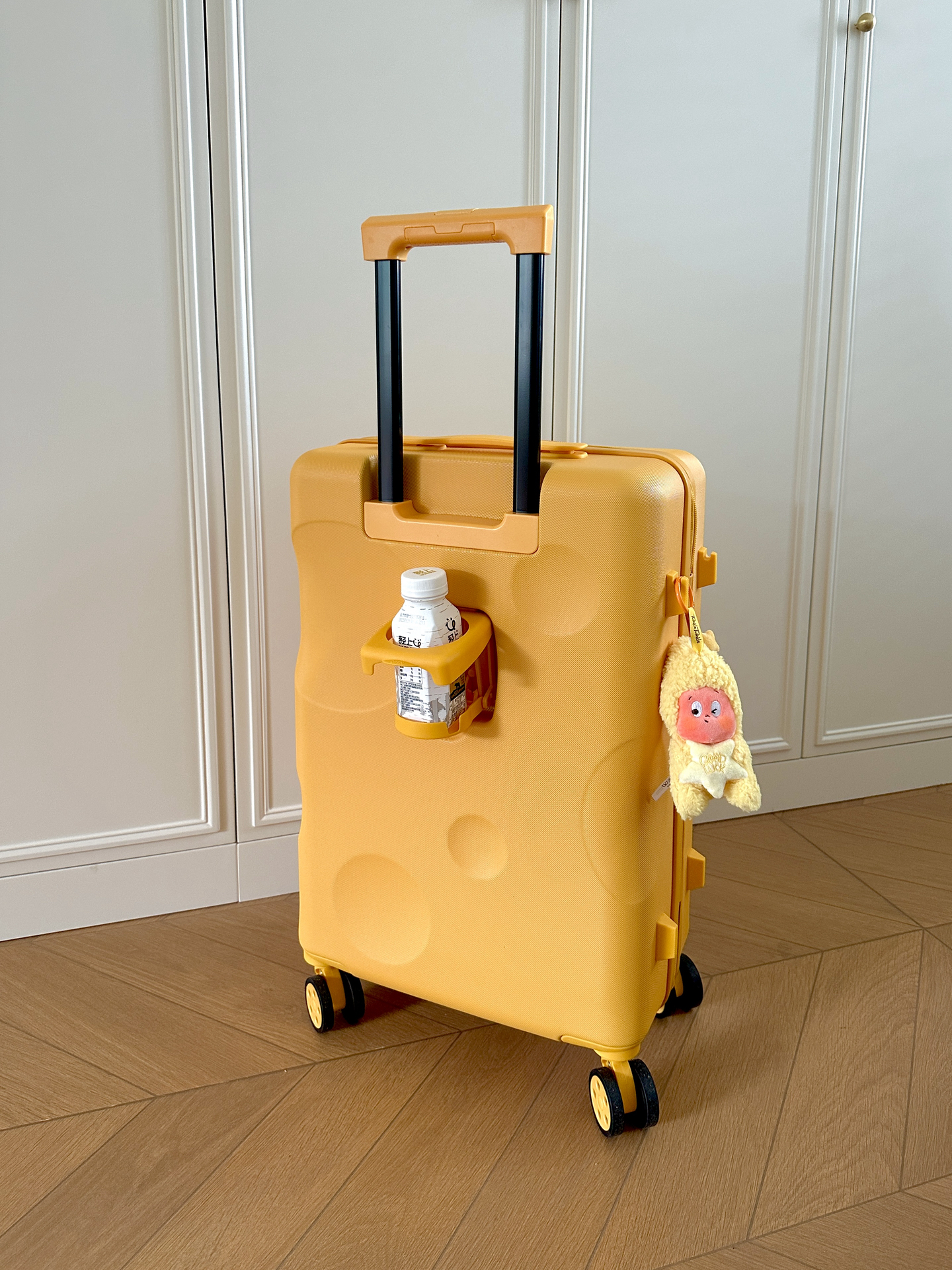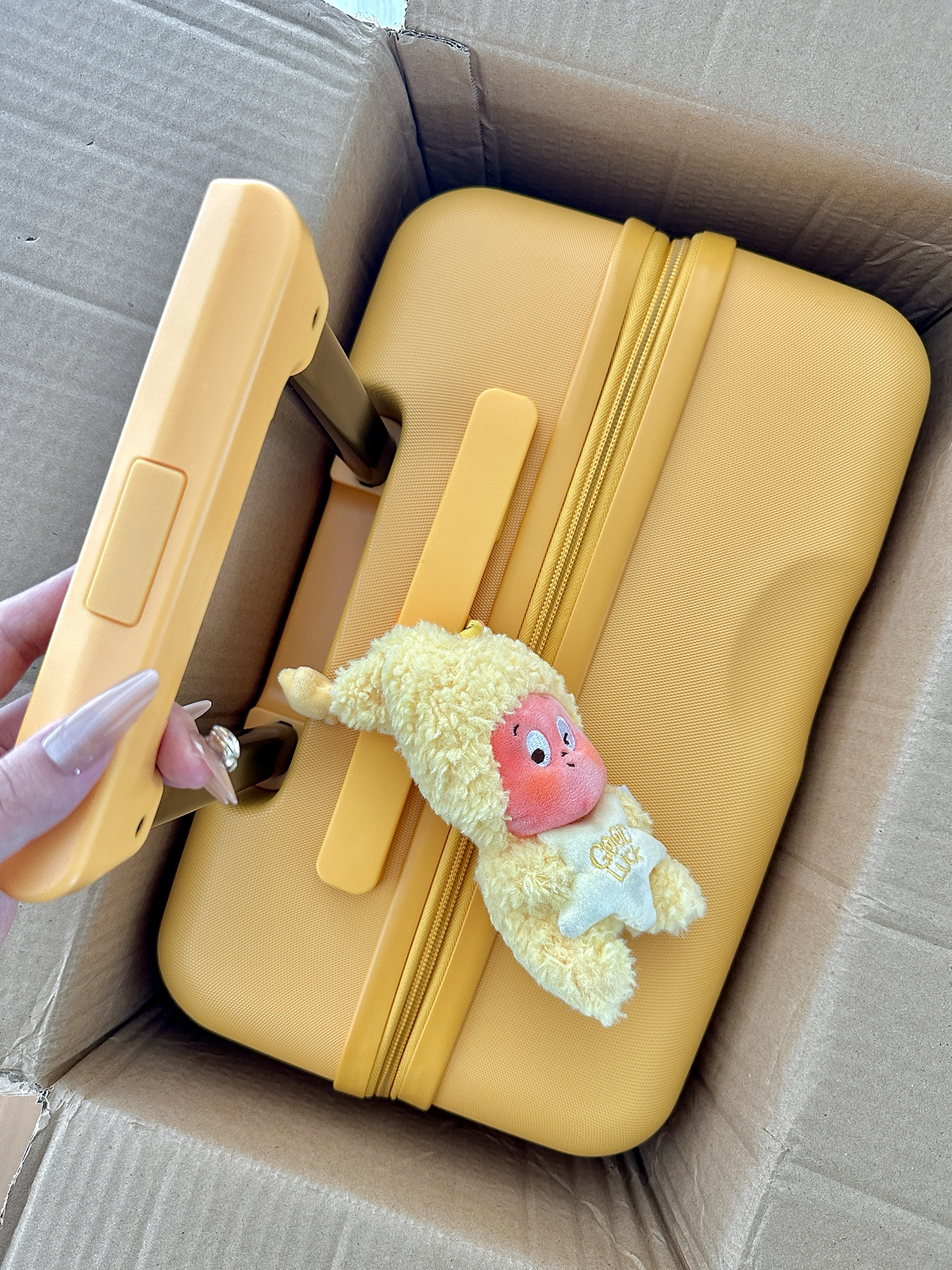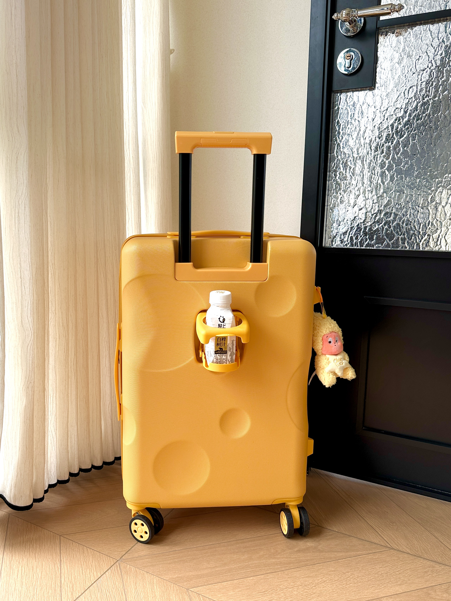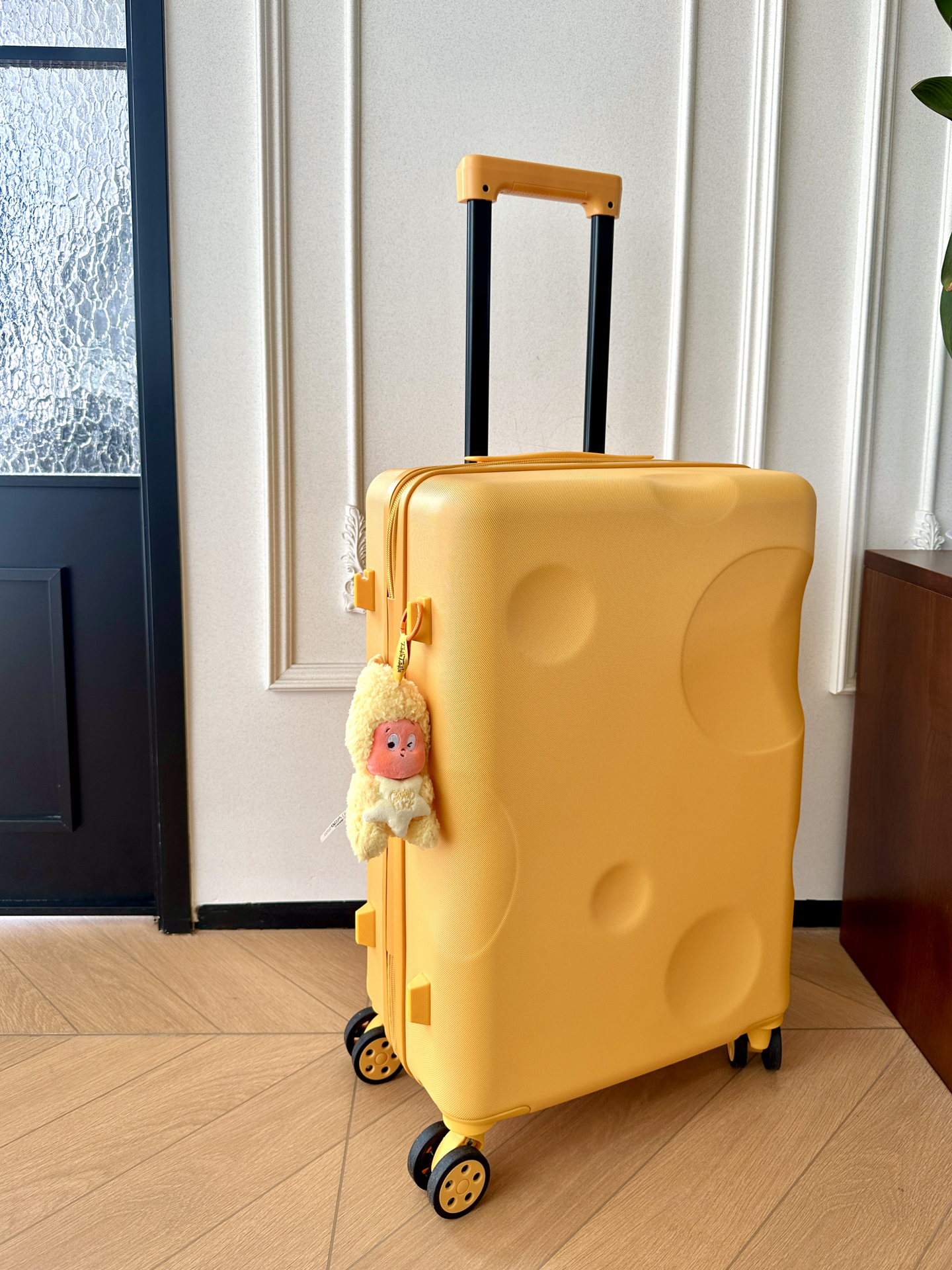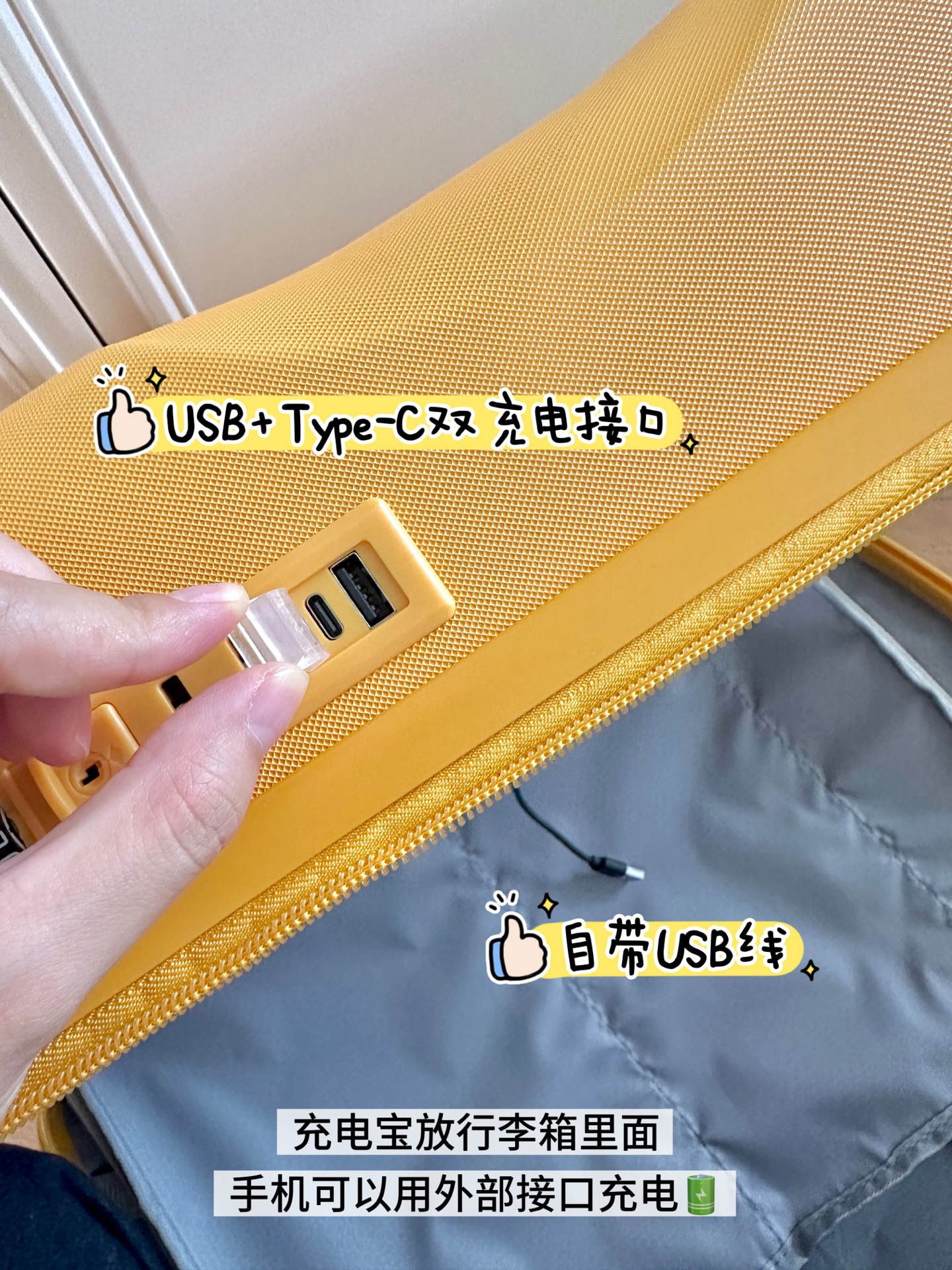 我发现这个芝士黄行李箱好适合假期出游背!外表像块奶油芝士🧀️,可爱到戳我~20寸看着小但很能装,上飞机也ok~内部分区干湿分离合理,外部还有放手机水杯的位置,还有俩充电口!不过要是有扩展层就更完美啦🥹 出游带它方便好多,学生党上班族都能冲!