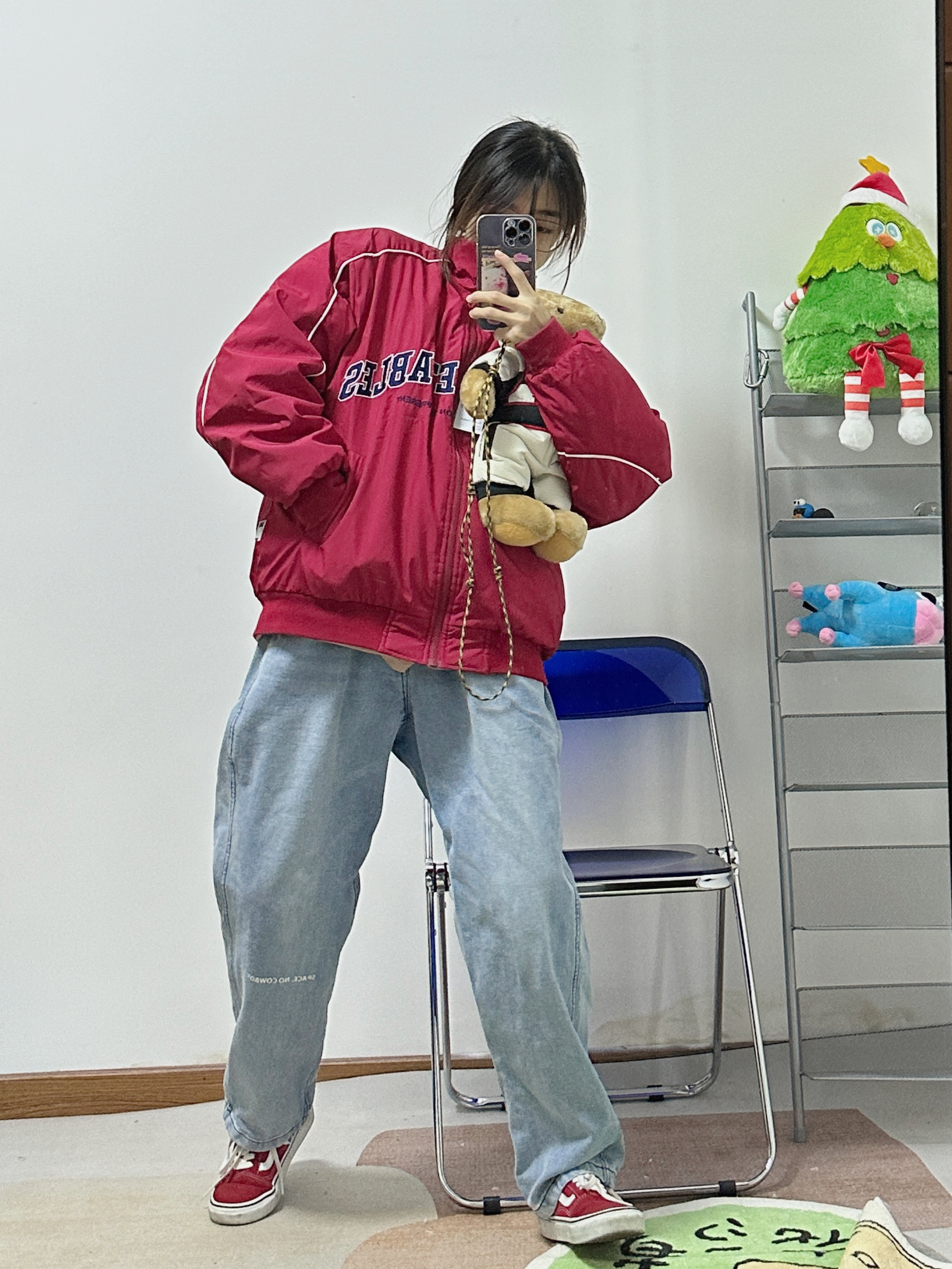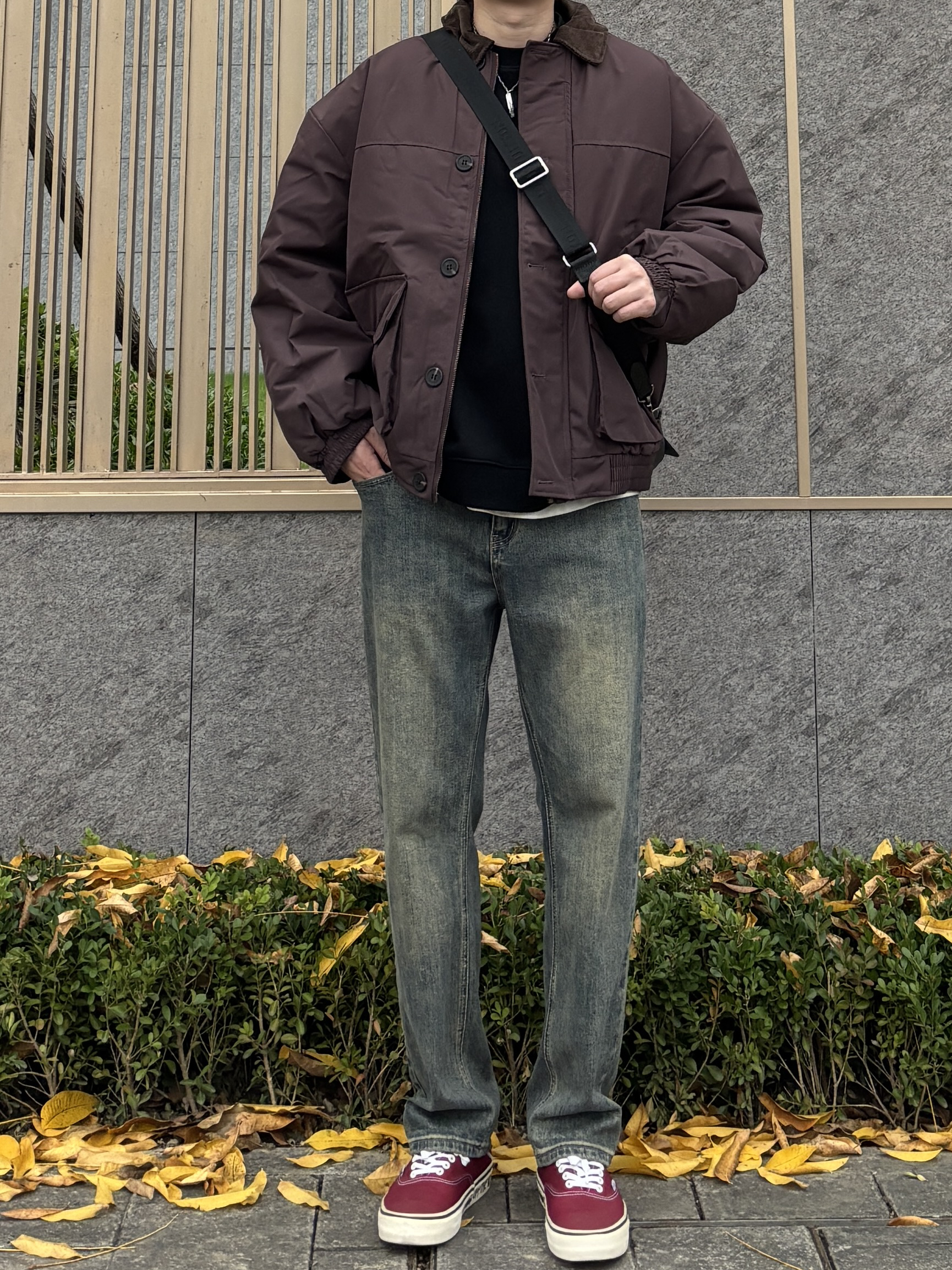 初冬就爱这种不费力又松弛混搭感~ 暗红色工装棉服自带复古滤镜,翻领设计利落不臃肿,内搭黑色小领口卫衣,裤子穿一条蓝色直筒水洗牛仔裤,酒红色涂鸦板鞋和外套悄悄呼应,细节感拉满。日常通勤或周末出门都合适,你们觉得这套怎么样🙋♂️ - 今日搭配 衣服裤子都来自:NICE LILI 鞋子:VANS红校车