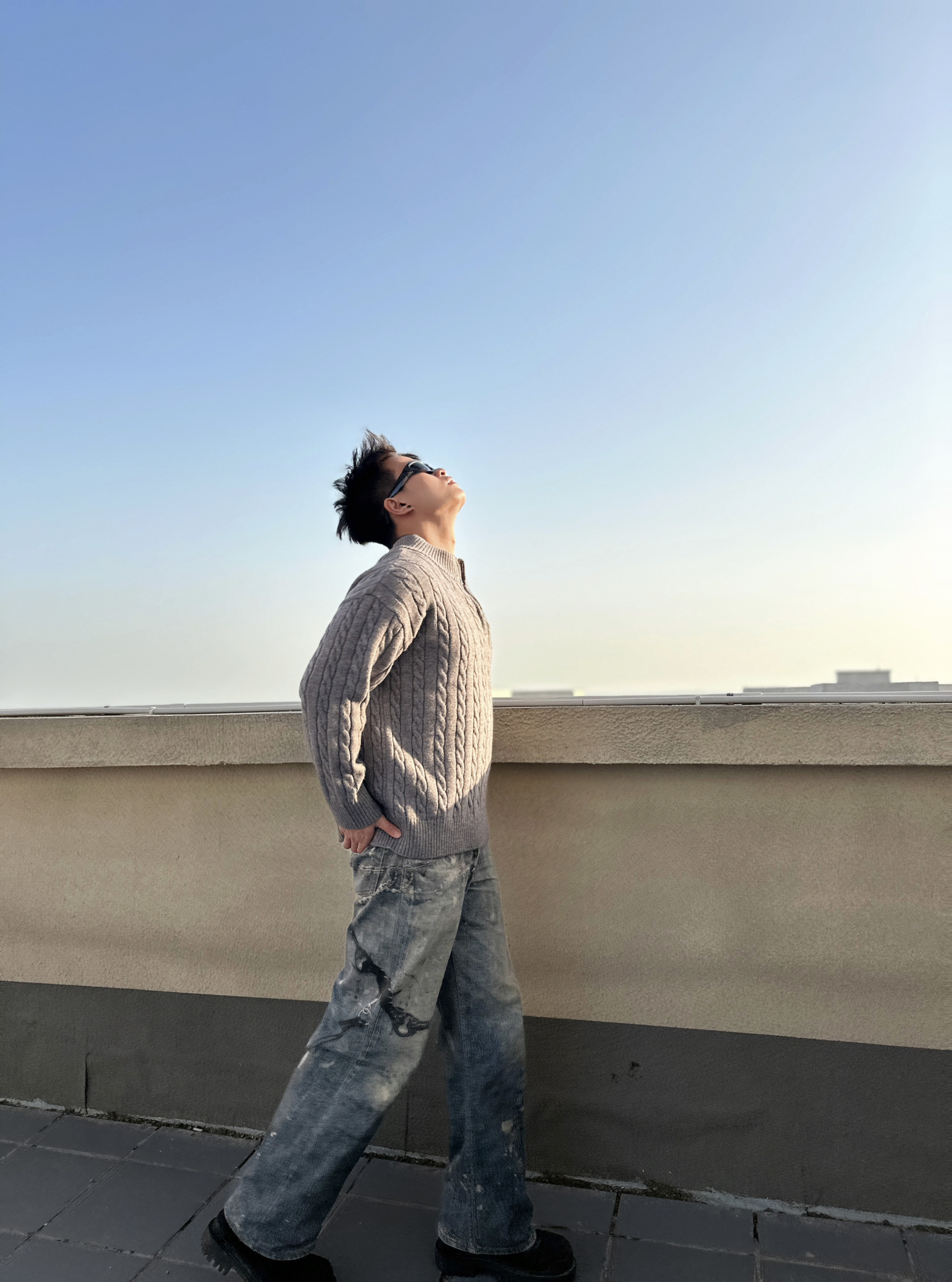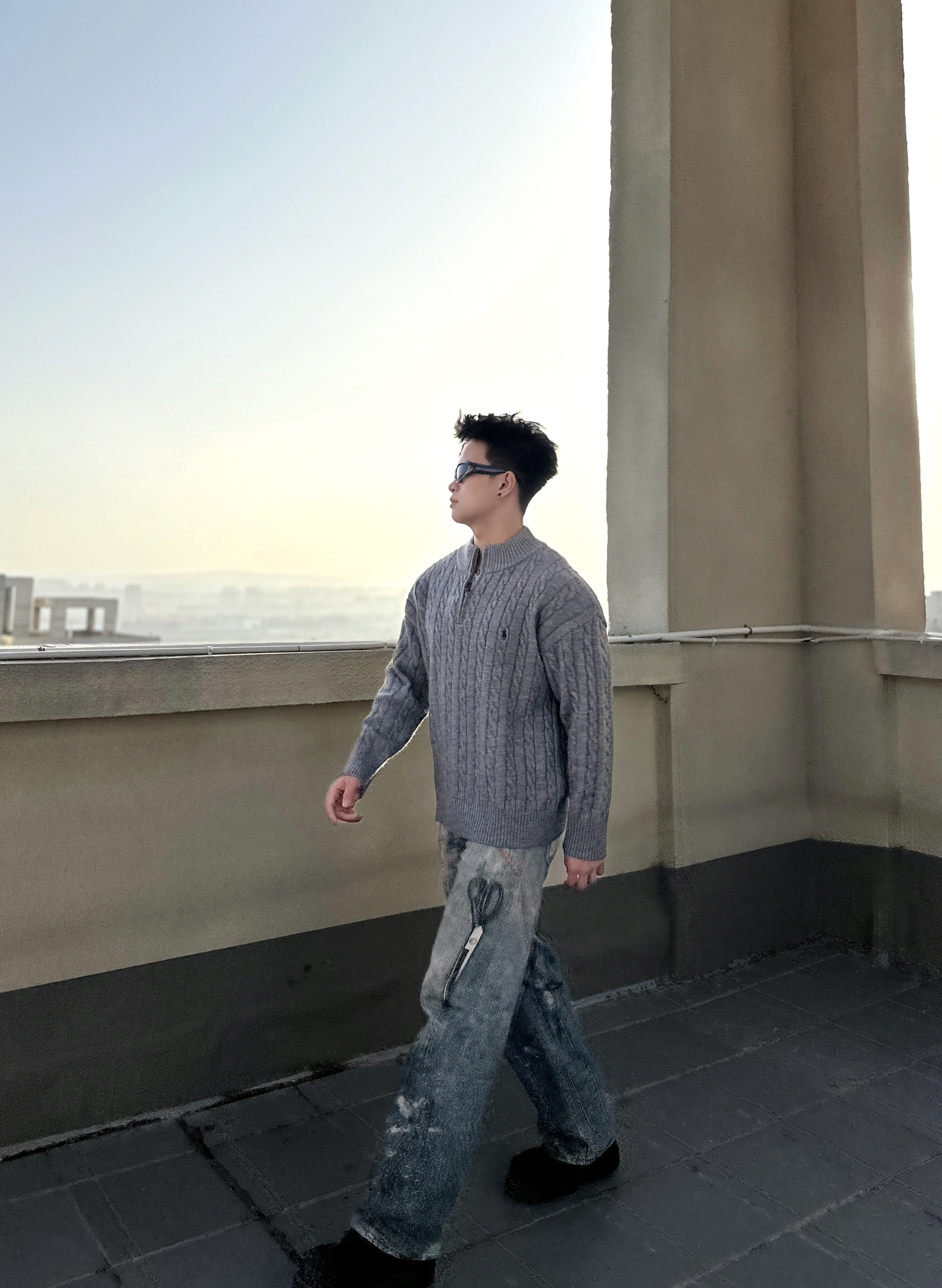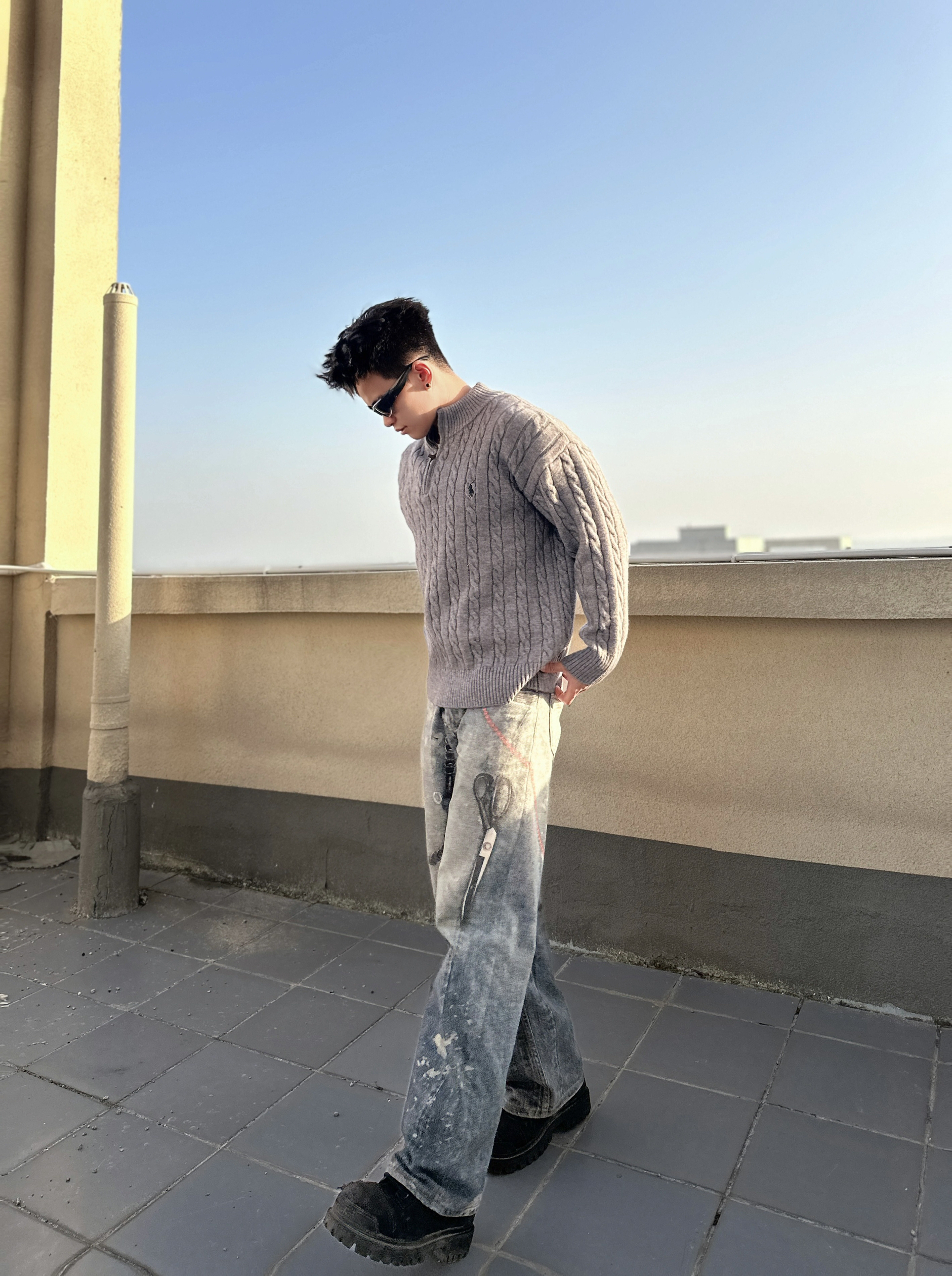 男生会穿搭还是挺吃香的 分享一套最近秋冬比较喜欢的ootd 拉夫的半高领拉链毛衣➕做旧涂鸦牛仔裤 剪刀装饰直接把“小众潮”焊在裤子上 满满的老钱风 版型设计宽松休闲 很适合秋冬季节 内搭外穿都可以 既保暖又舒适 羊毛面料 穿上不扎身! 👖 再配上一条大面积做旧 涂鸦印花拼接元素 视觉层次丰富且充满艺术感 强化潮流属性 天台浅拍了一组 松弛感直接溢出屏幕 177 69 M/L