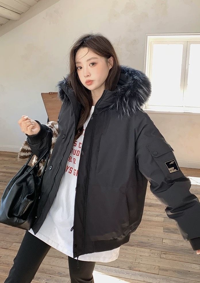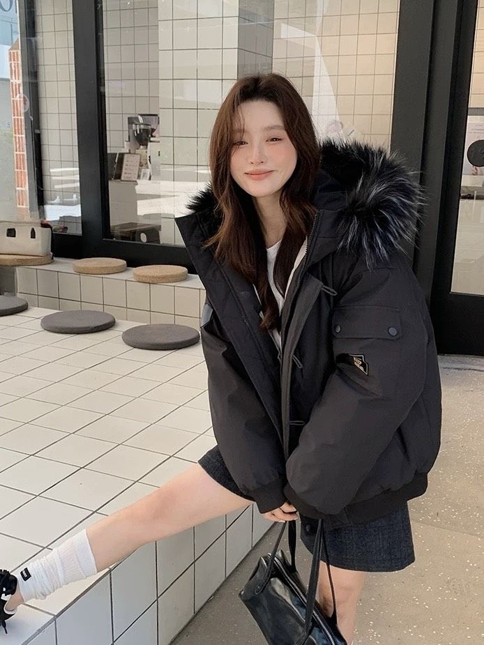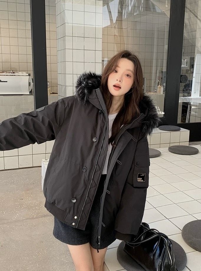 这件黑色貉子毛领羽绒服也太会拿捏冬日氛围了!蓬松毛领裹住半张脸,暖呼呼还显脸小✨ 工装风大口袋+抽绳设计,松弛感直接拉满,内搭白T+短裙露腿穿,甜酷反差感秒出片~抗风又轻便,通勤逛街都能打,谁穿谁是韩系街拍女主!