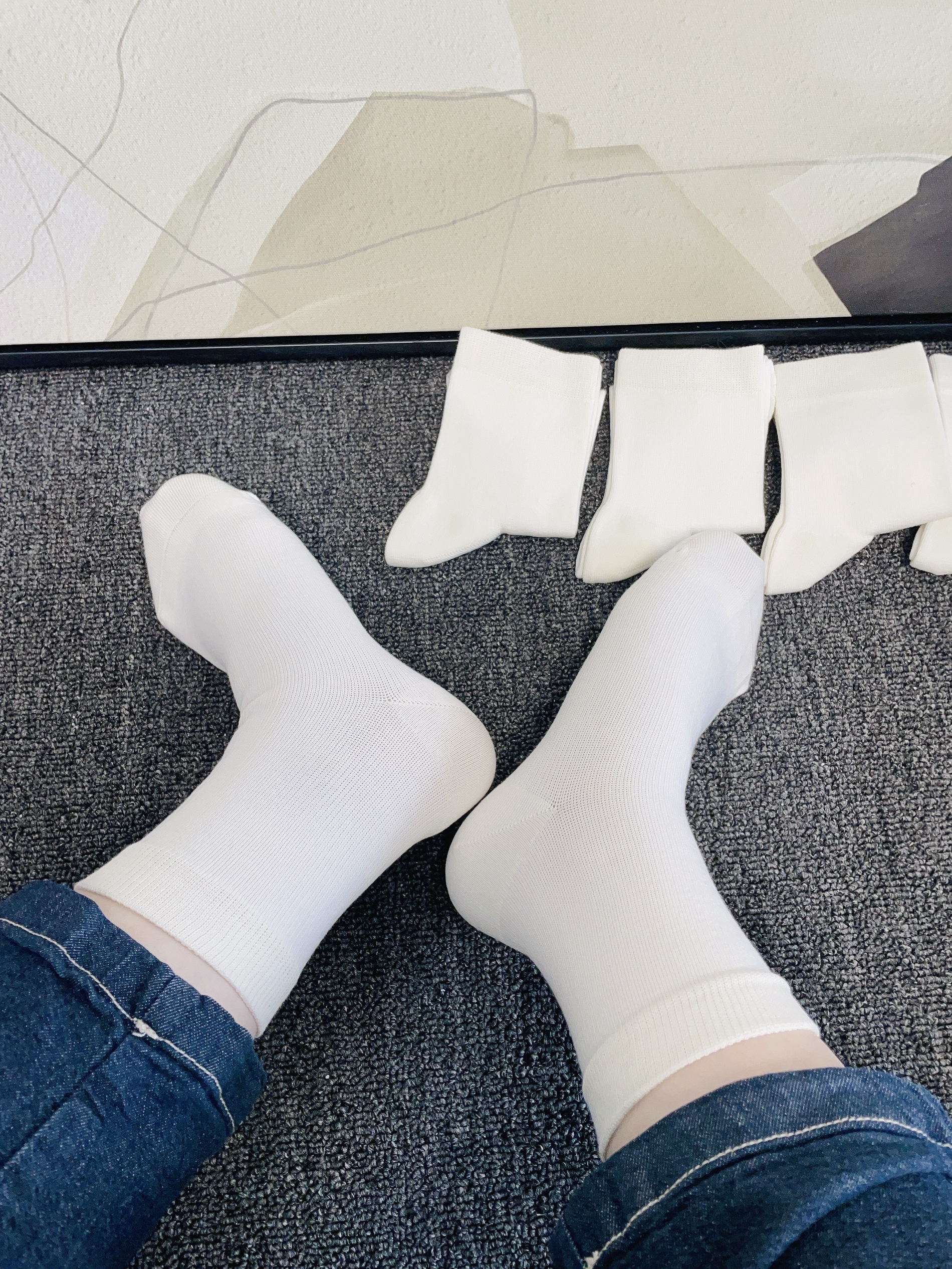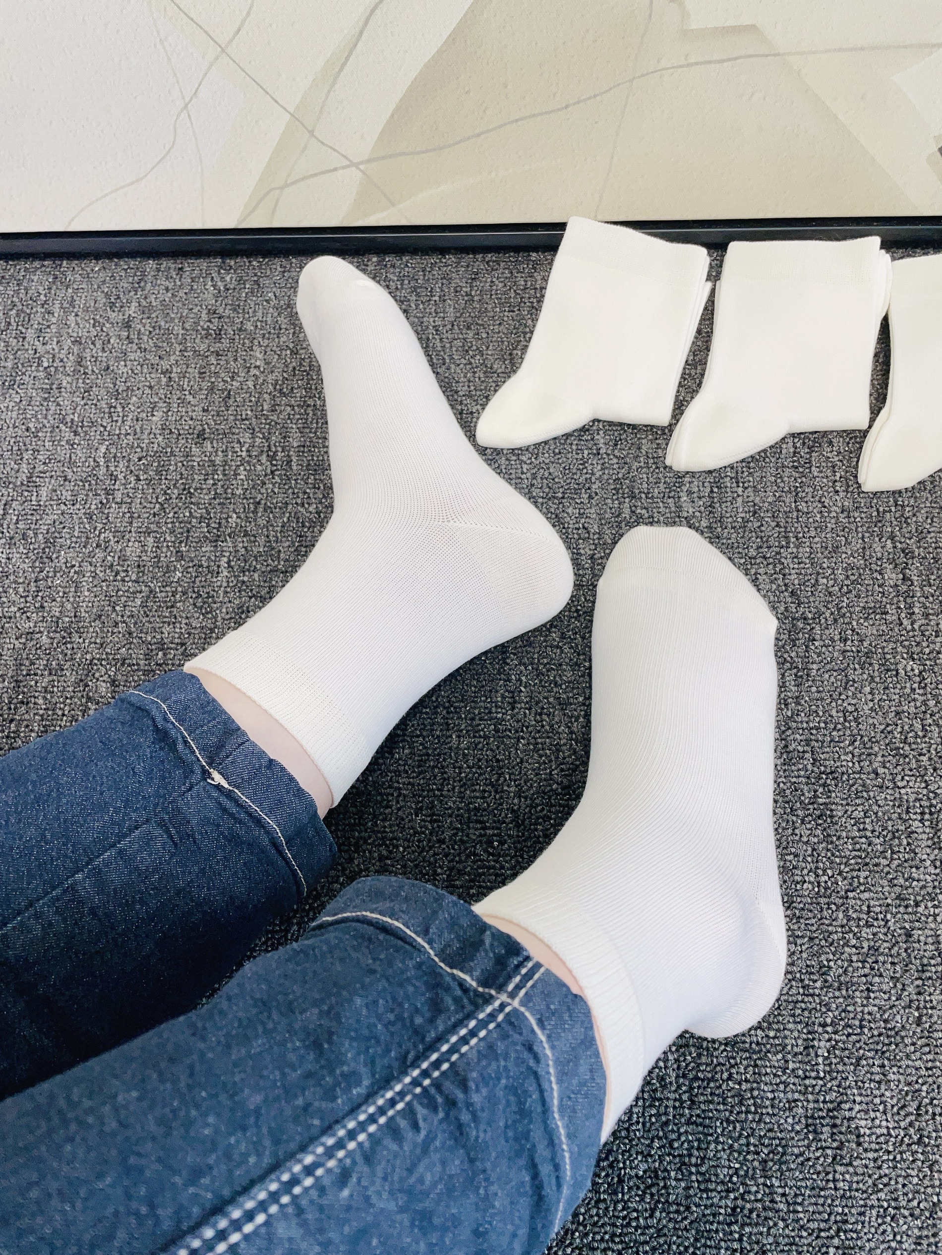 现在天气比较冷每天都纠结穿什么袜子好搭配 我给自己安排了新袜子 这款白色袜子简约干净好好看 摸着面料柔软 细节做的可以 上脚穿了舒服不会勒 日常通勤随便搭我的耐克鞋子都可以