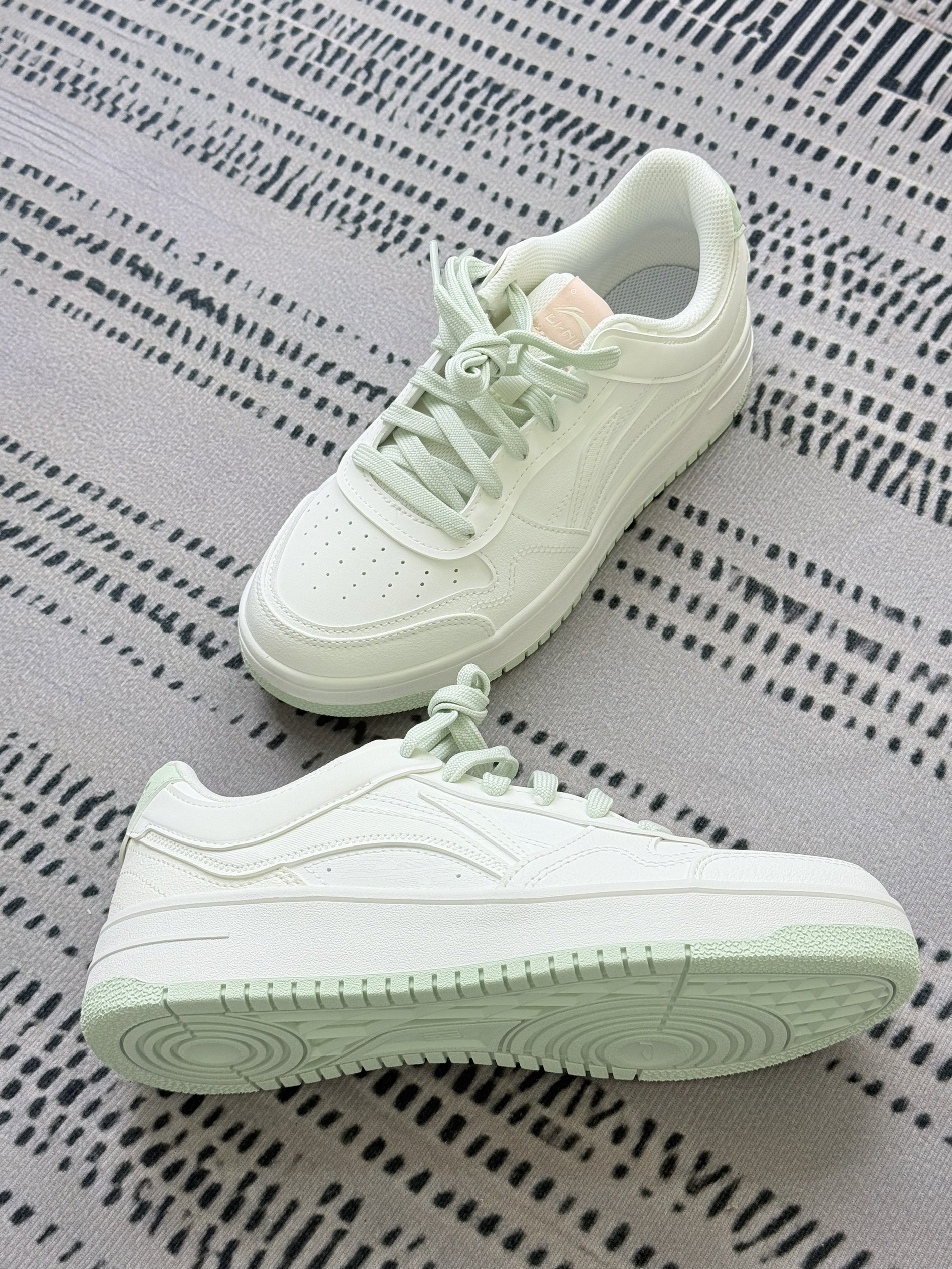 这是李宁品牌的天迹系列女子板鞋,属于2025年夏季新款,经典低帮板鞋版型,以米白色为主色调,搭配浅绿色鞋带与后跟拼接,清新简约,符合夏季穿搭需求;鞋身线条流畅,鞋头微收设计显脚型秀气,适合日常休闲或搭配服饰。 橡胶鞋底纹理清晰,抓地力强,雨天防滑性能较好;鞋侧有品牌标志性线条装饰,后跟“LI-NING”标识提升辨识度。 日常休闲穿搭、校园通勤、轻度运动或户外出行,百搭牛仔裤、短裙等多种服...