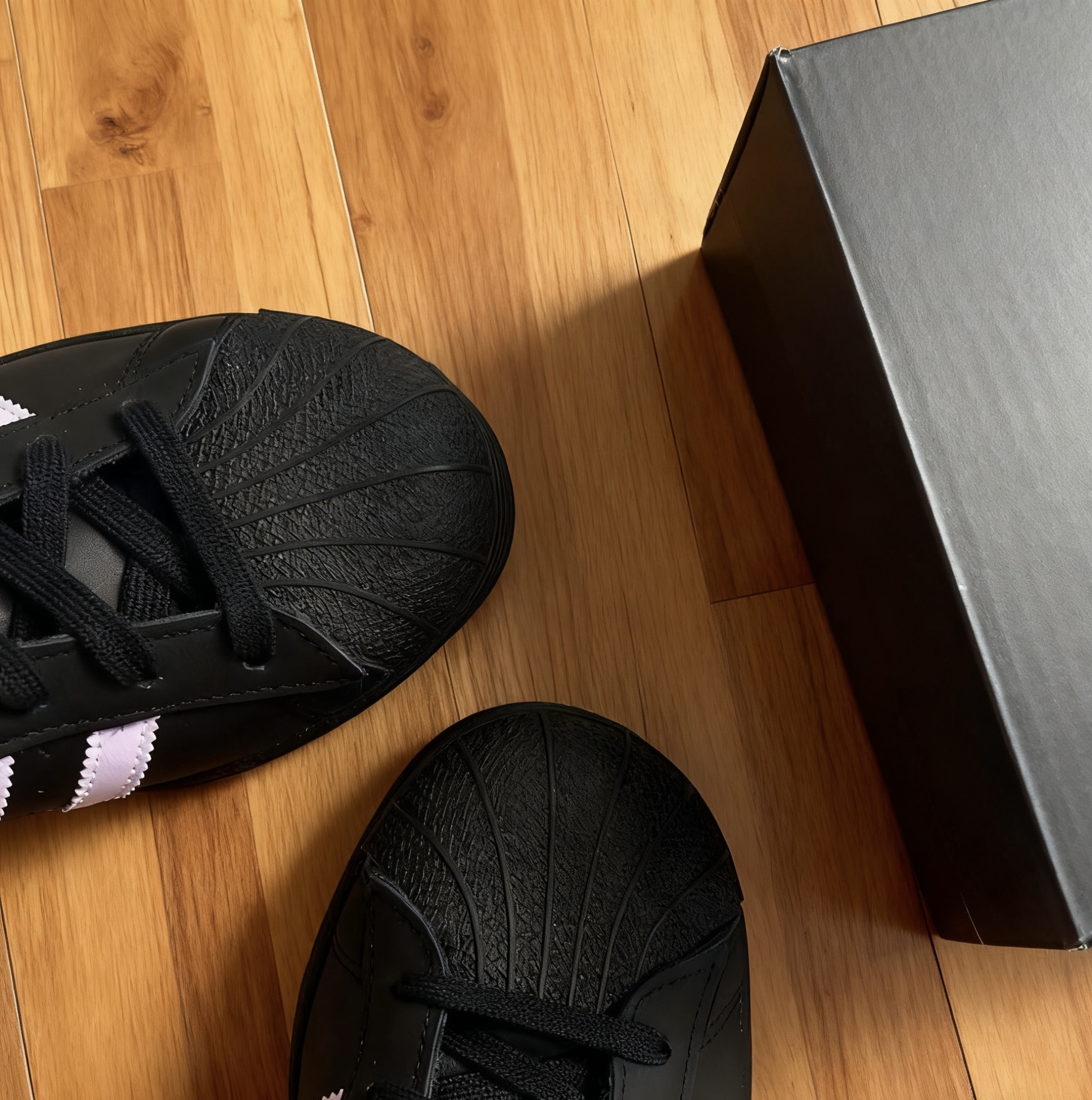 谁能拒绝这双黑紫配色的Adidas Superstar贝壳头啊!经典贝壳头设计自带复古buff,全黑鞋身酷感拉满,淡紫色三道杠和后跟细节又甜又嗲,甜酷风姐妹直接锁死~ 上脚巨百搭,配黑裙是暗黑甜妹,搭工装裤秒变街头潮人。皮质鞋面质感在线,贝壳头耐磨又有辨识度,日常出街、上学通勤都能打。这波黑紫撞色真的杀疯了,小众又吸睛,识货的姐妹快冲,穿上就是穿搭圈显眼包!