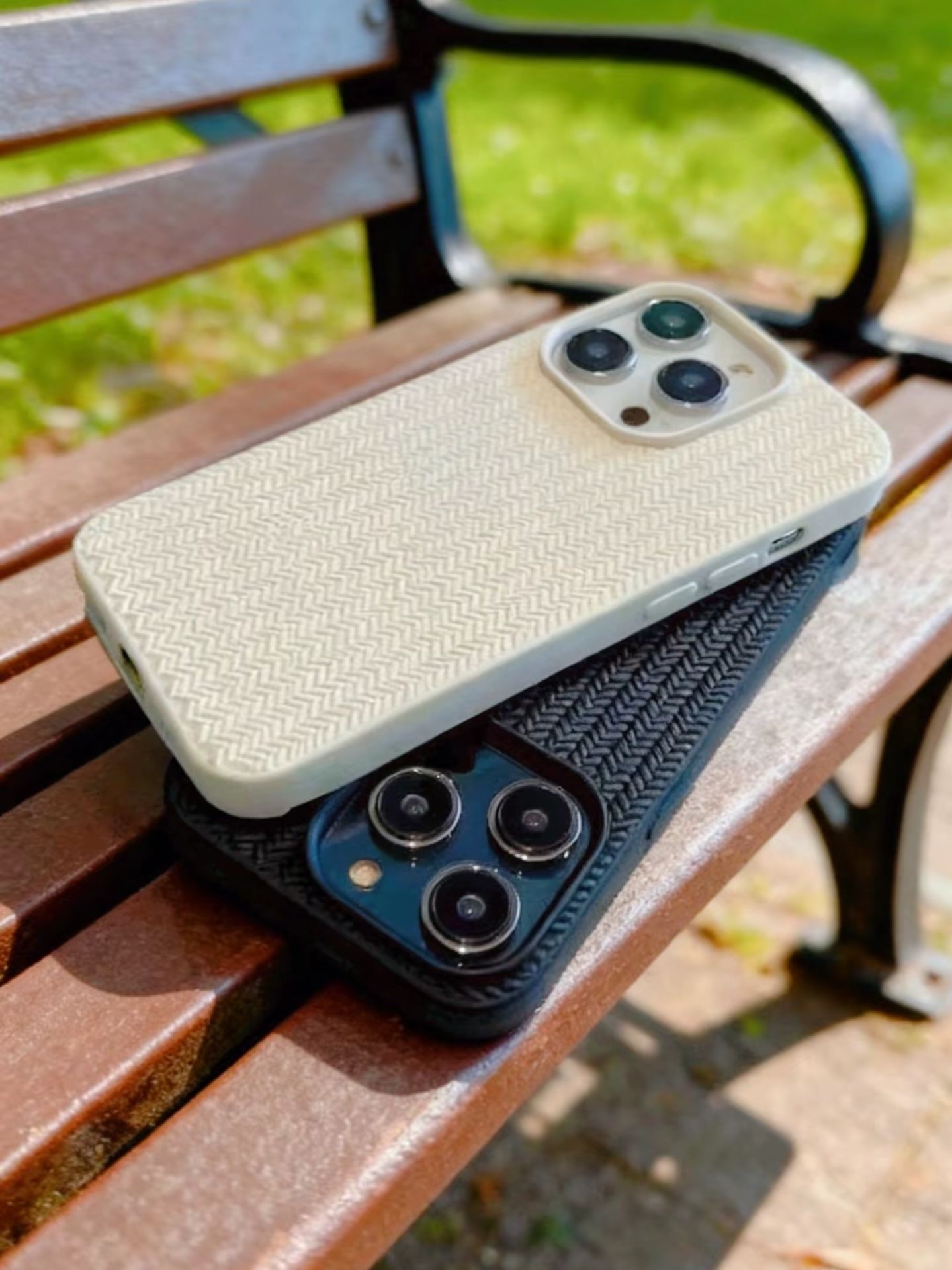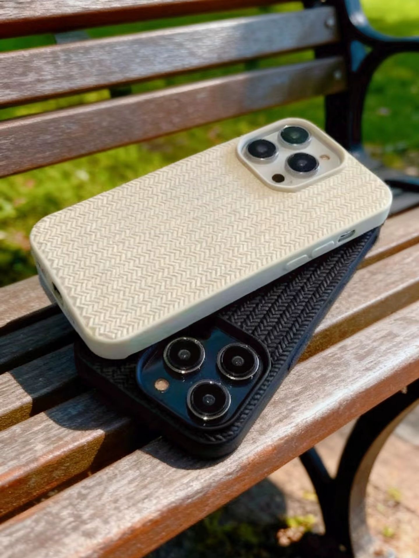 周末逛公园随手拍,把两个手机叠在长椅上🌳 结果好多人来问这个手机壳! 黑色是带点酷感的编织纹,白色是温柔的米白 阳光洒在上面,质感真的绝了 最惊喜的是摄像头这块,黑的沉稳,白的清透 放在一起莫名和谐,像极了爱情的模样❤️