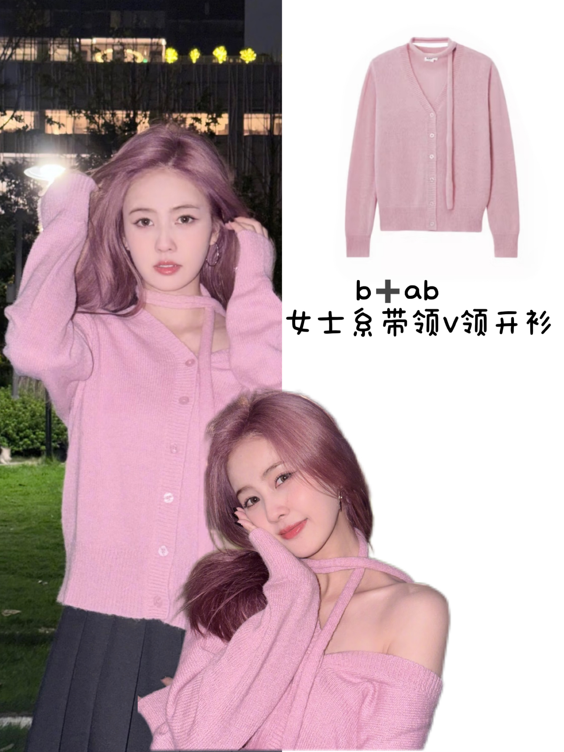 粉发和粉开衫的同色系适配度100%!嫩粉+黑裙的撞色,甜而不腻还自带清冷感,晚上拍氛围感直接拉满,是路过都会被问链接的程度!