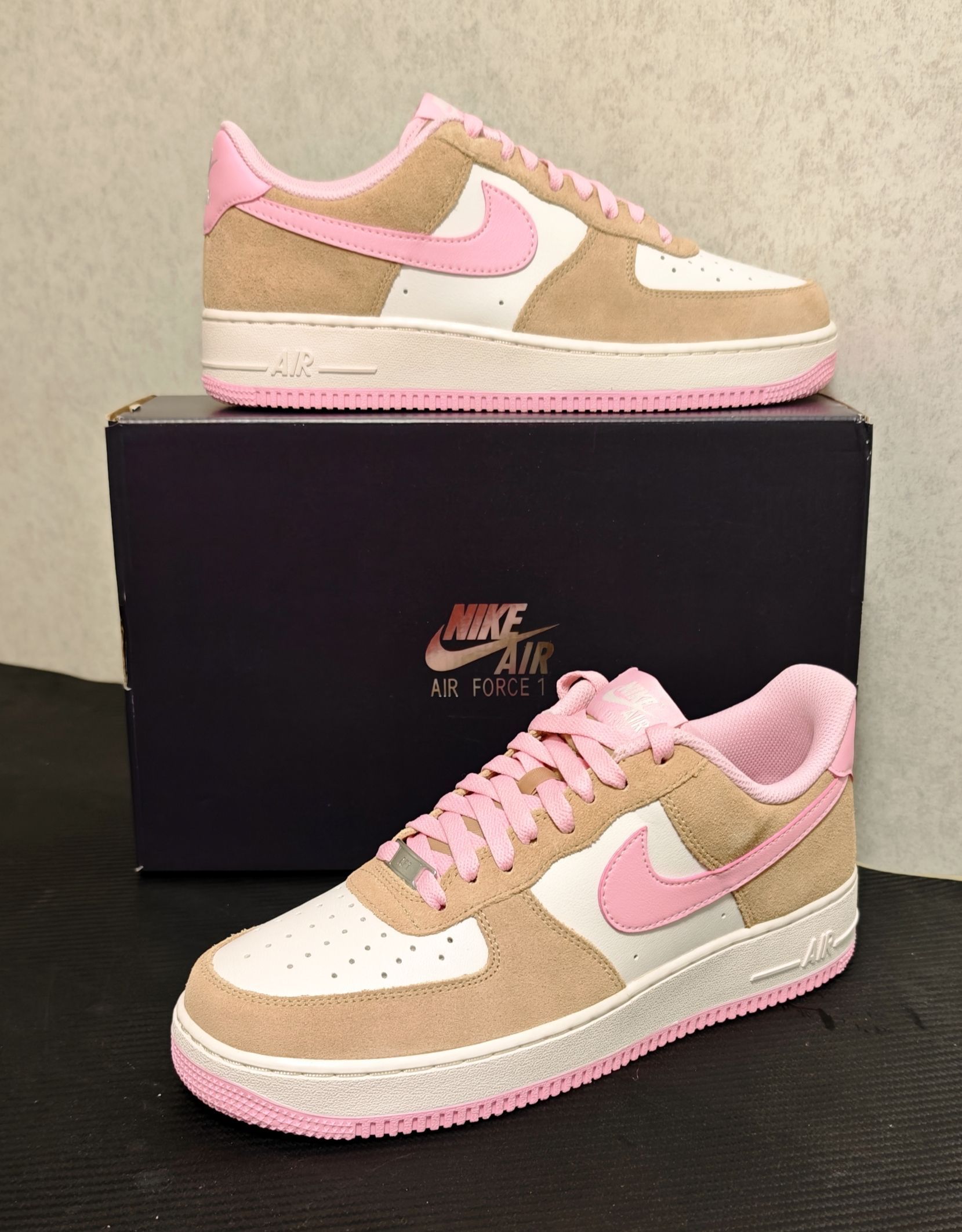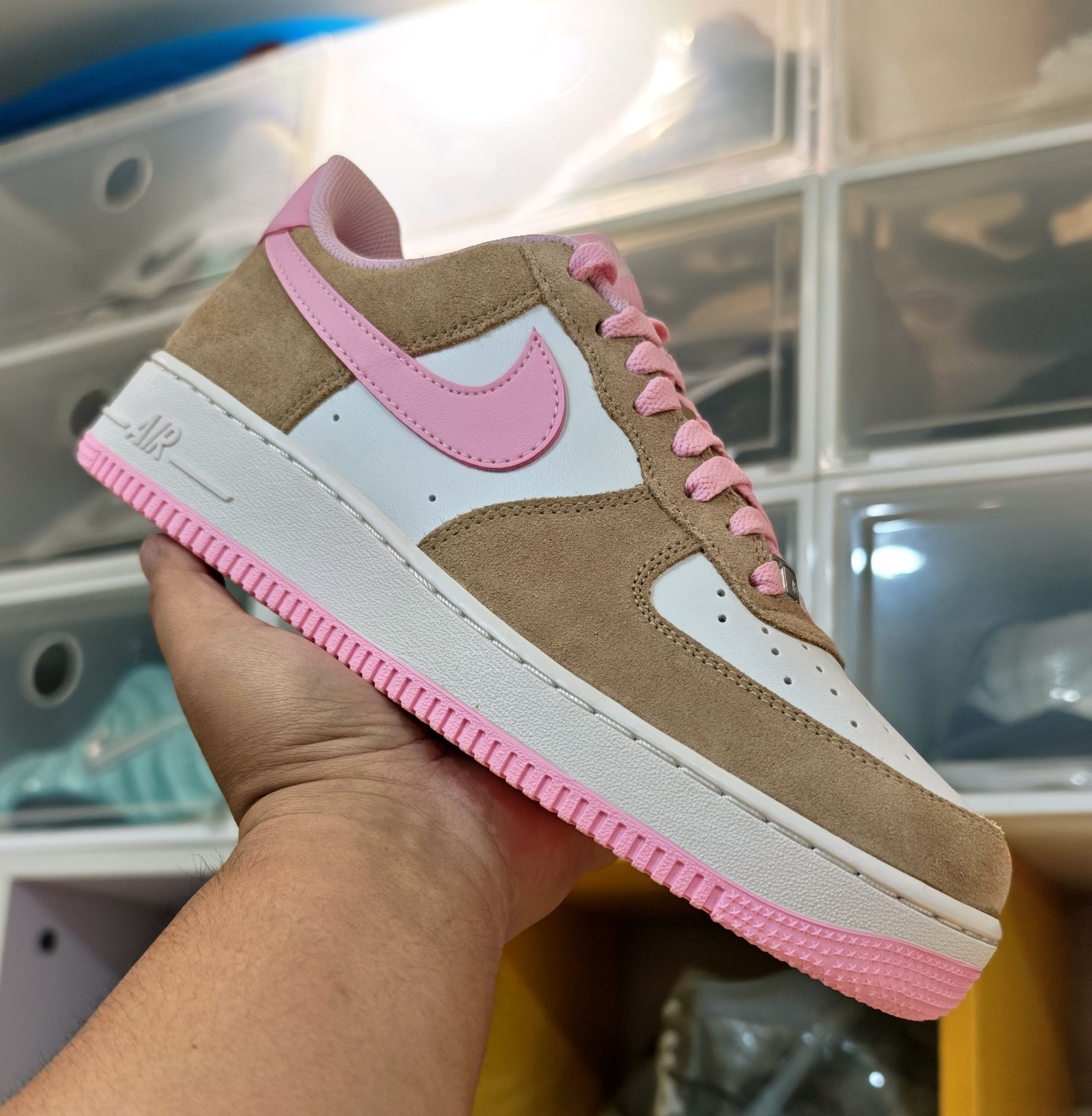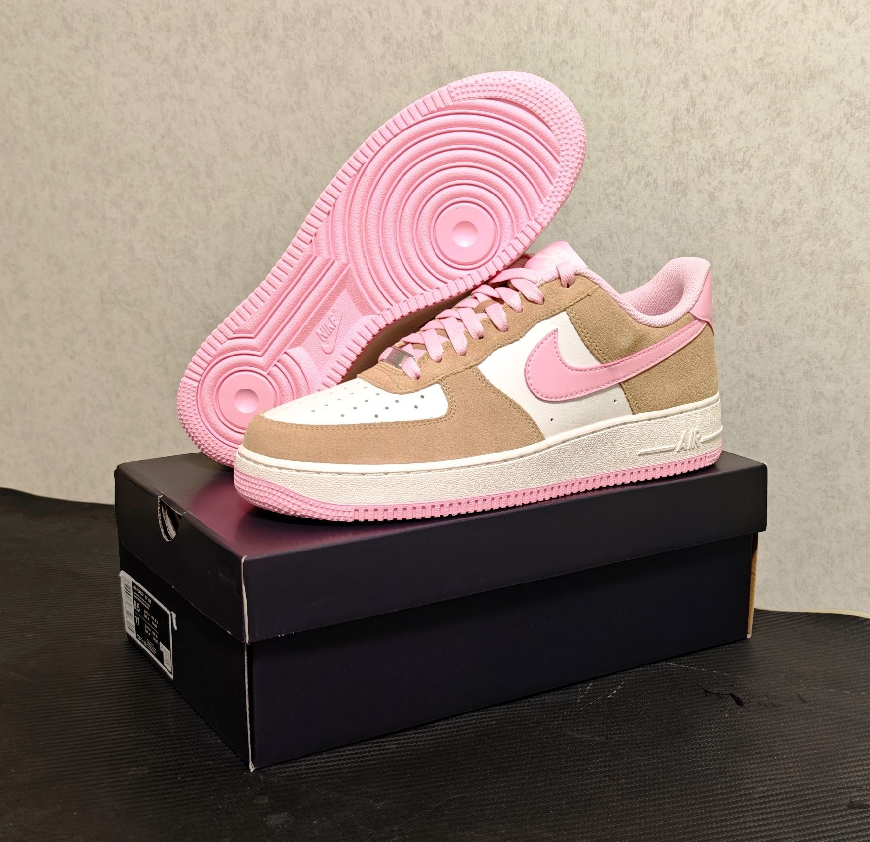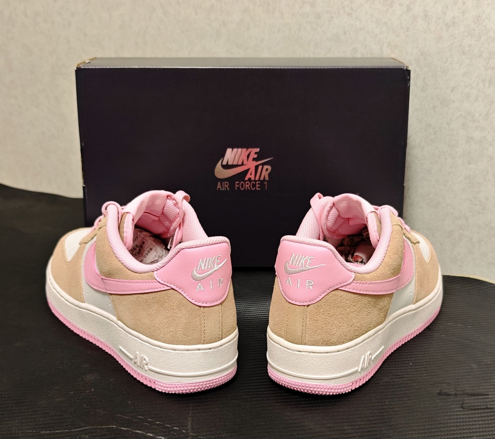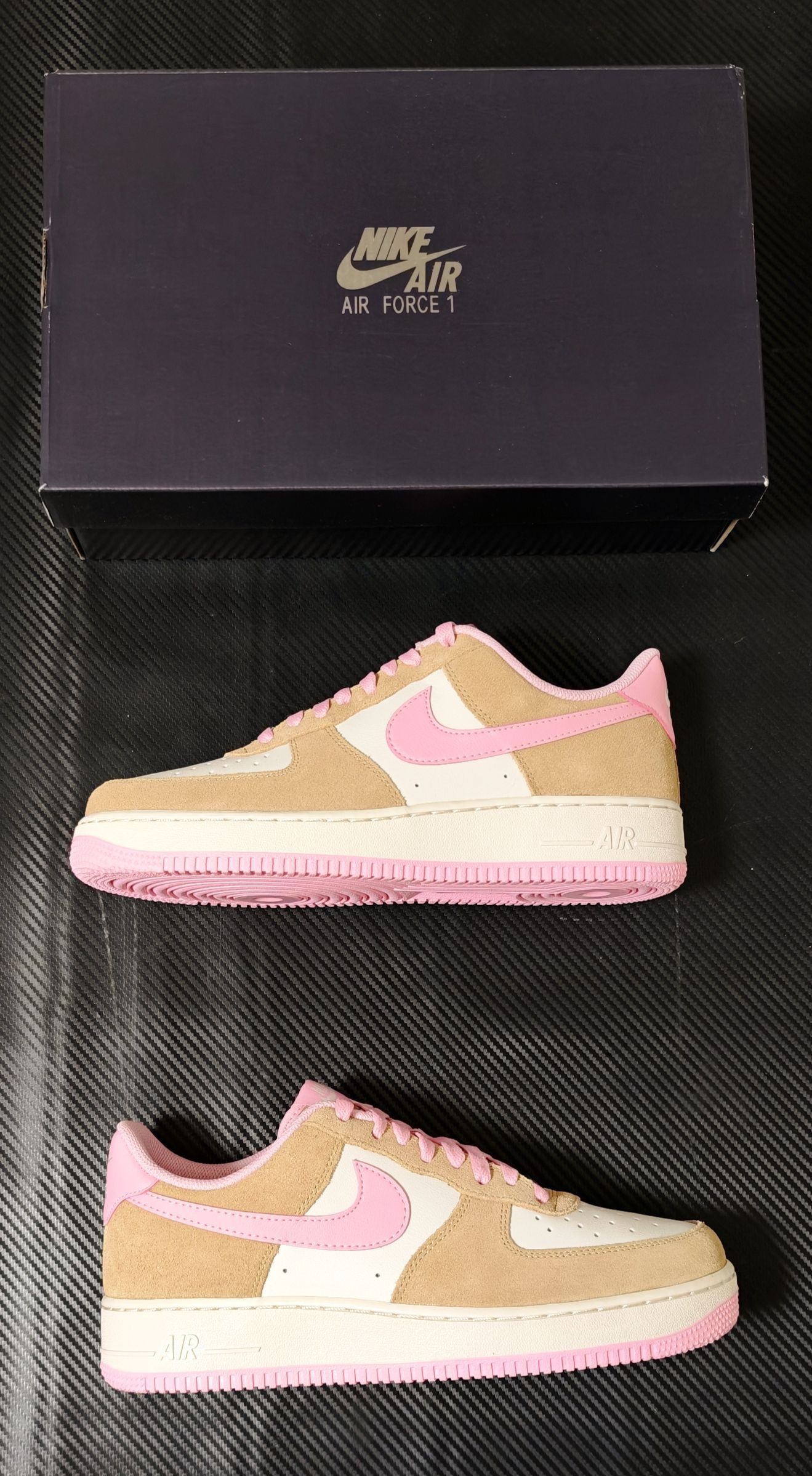Nike Air Force 1 空军一号 球鞋评测 开箱印象:细节拉满的仪式感 开箱后,粉棕配色鞋身与内部白色缓冲纸形成鲜明对比。鞋面采用浅棕色麂皮+白色皮革+粉色Swoosh的拼接设计,材质边界处理工整,无溢胶现象,初步体现Nike的品控水准,皮质做工比一般空军都要好一点,实物棕色会更浅。 实穿体验:舒适度与适配场景 - 脚感: 沿用AF1经典的泡棉中底+Air Sole气垫,走路时能...