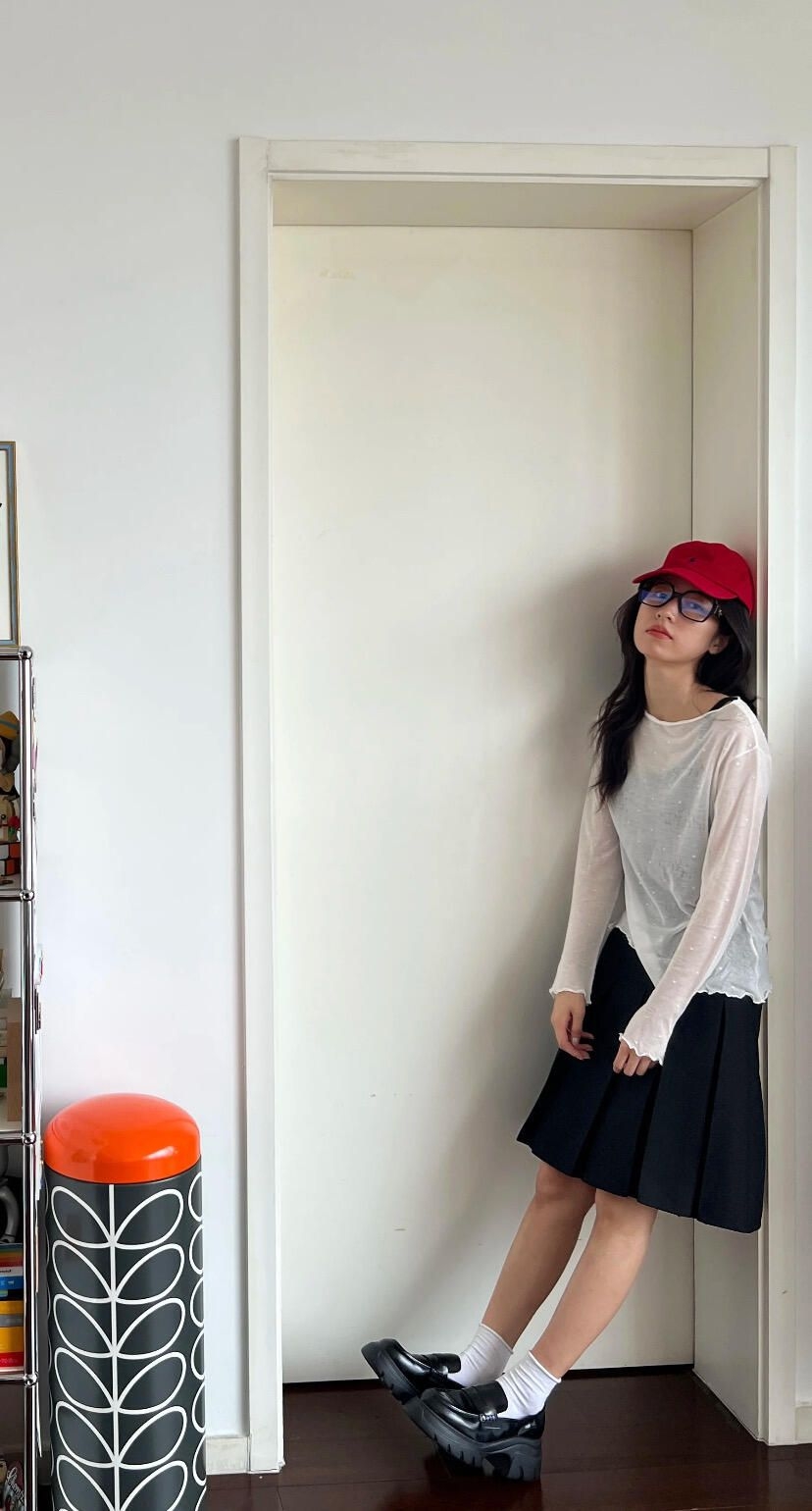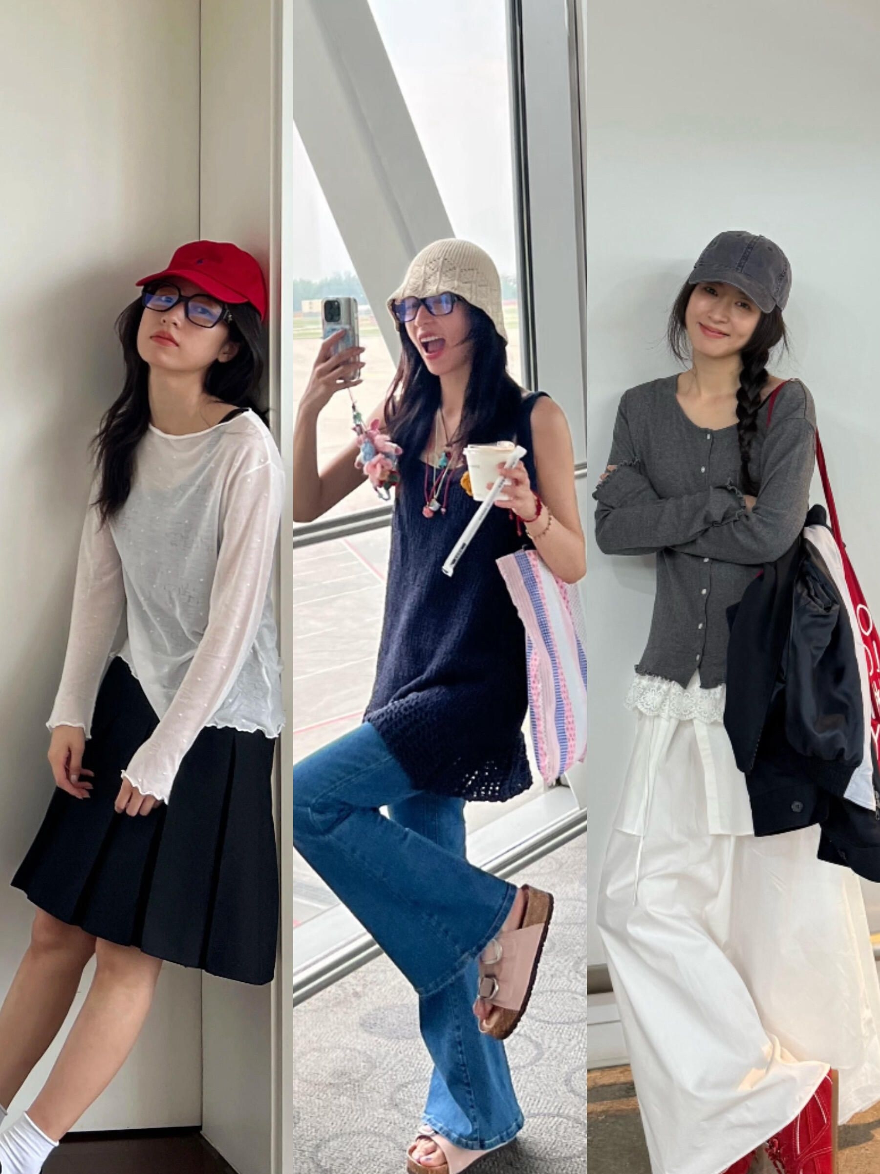 1.第一套:白色微透长袖上衣叠穿内搭,搭配黑色百褶裙,头戴红色棒球帽,休闲又有活力😎 2.第二套:黑色无袖针织衫搭配蓝色喇叭牛仔裤,头戴米色帽子,妥妥的时尚达人出街既视感🥳 3.第三套:灰色开衫叠穿白色蕾丝内搭,搭配白色阔腿裤,脚踩红色鞋子,休闲中带着精致🧚♀️ 4.第四套:浅米色衬衫裙搭配米色运动鞋,斜挎同色系大包,简约又大气,通勤或者日常出街都很合适✨ 5.第五套:白色短袖上衣搭配深蓝色牛仔...