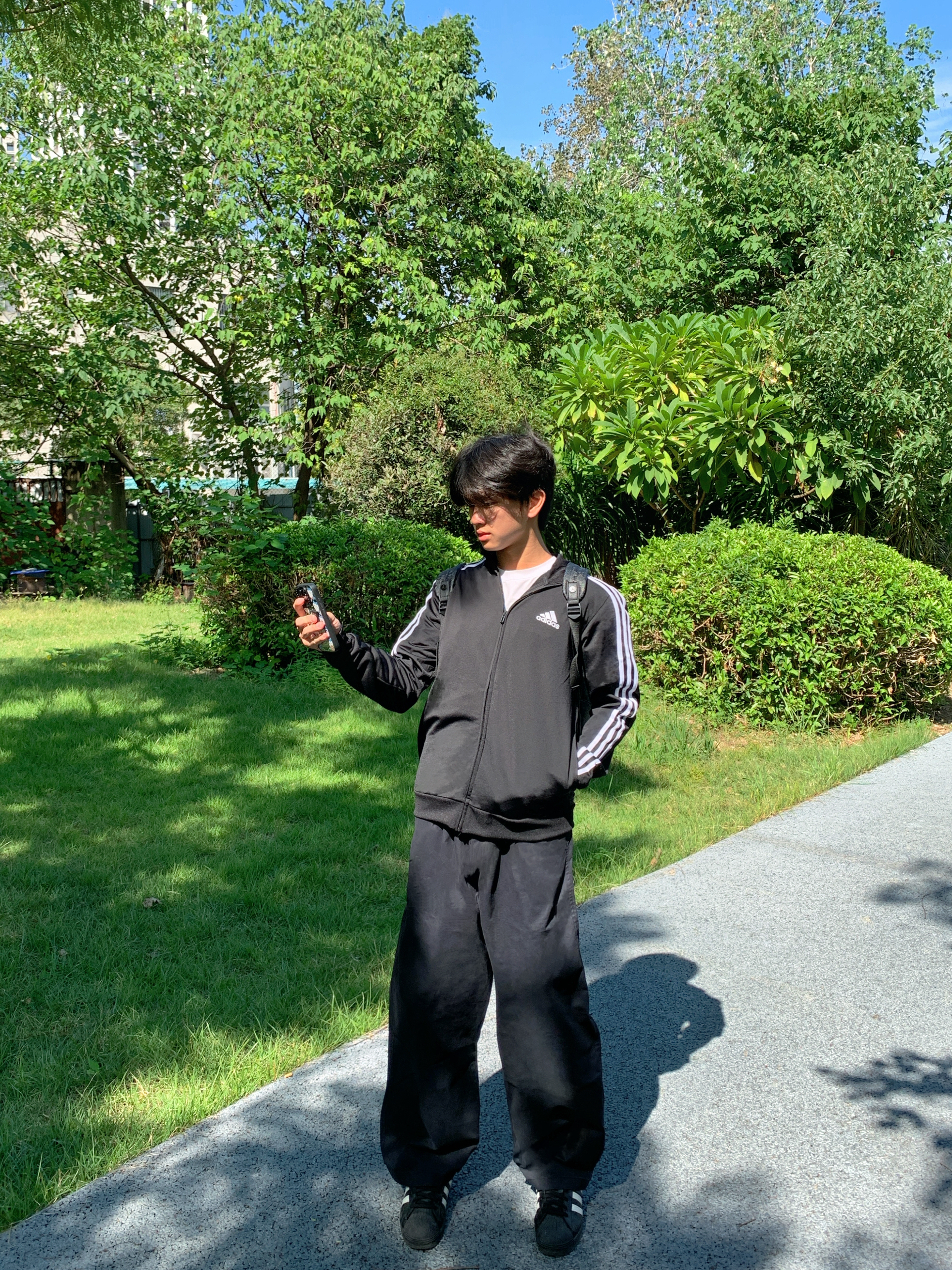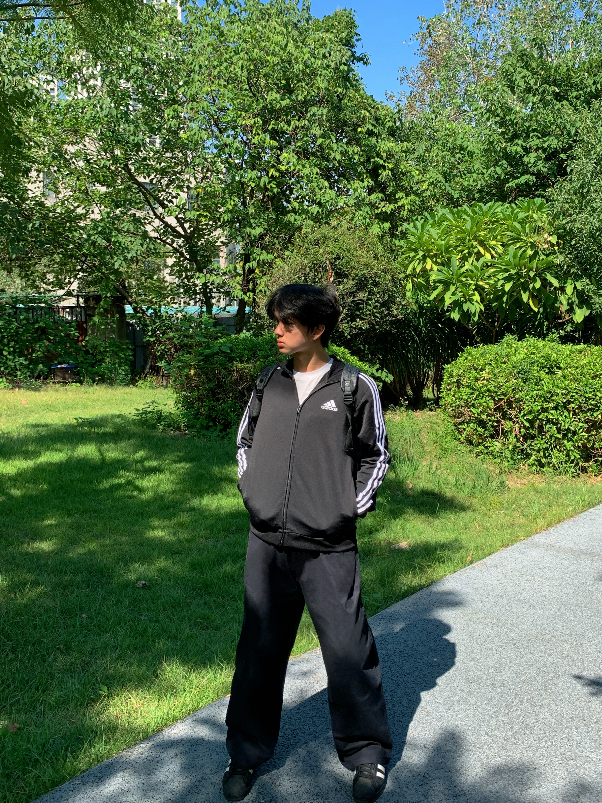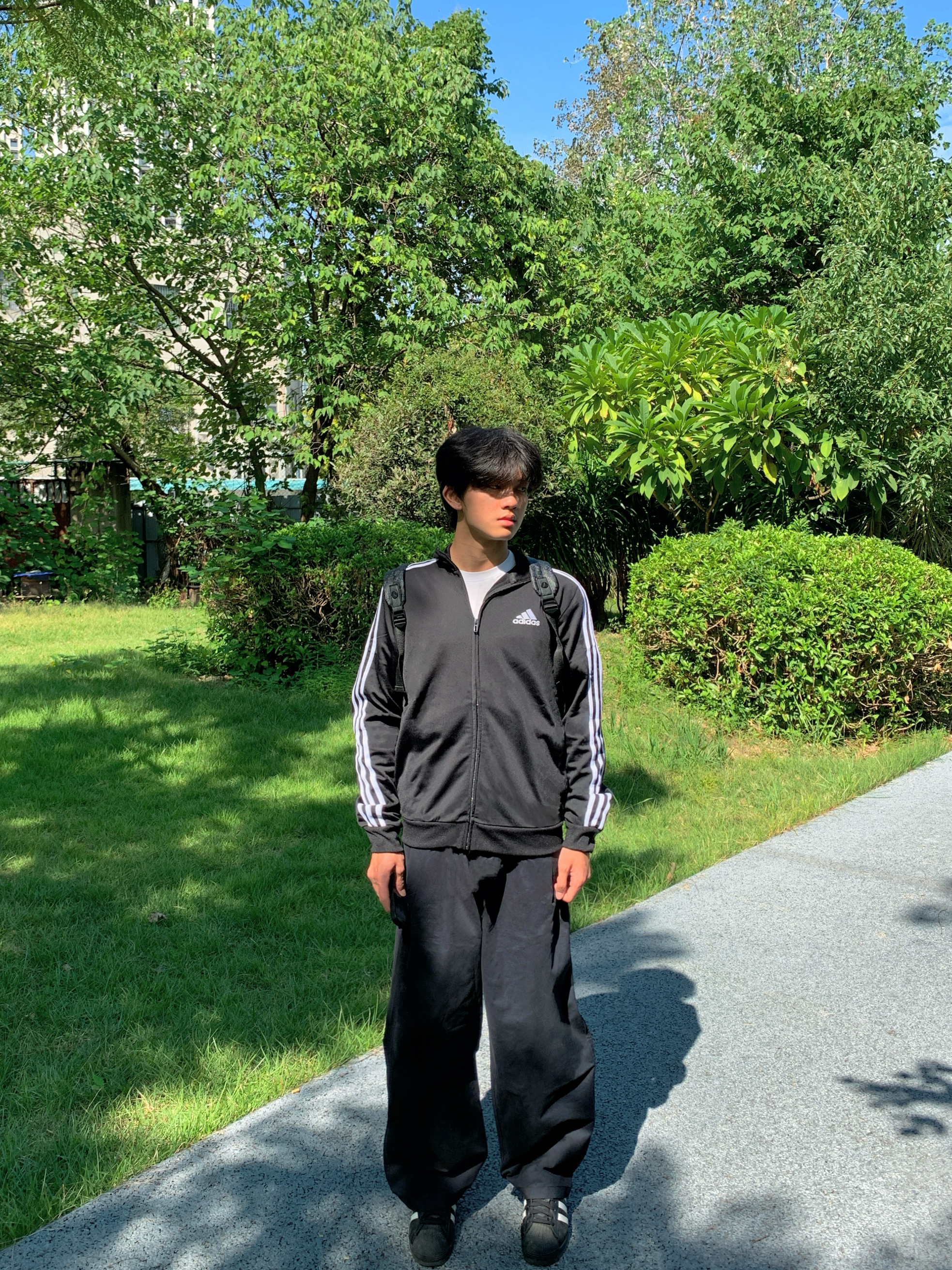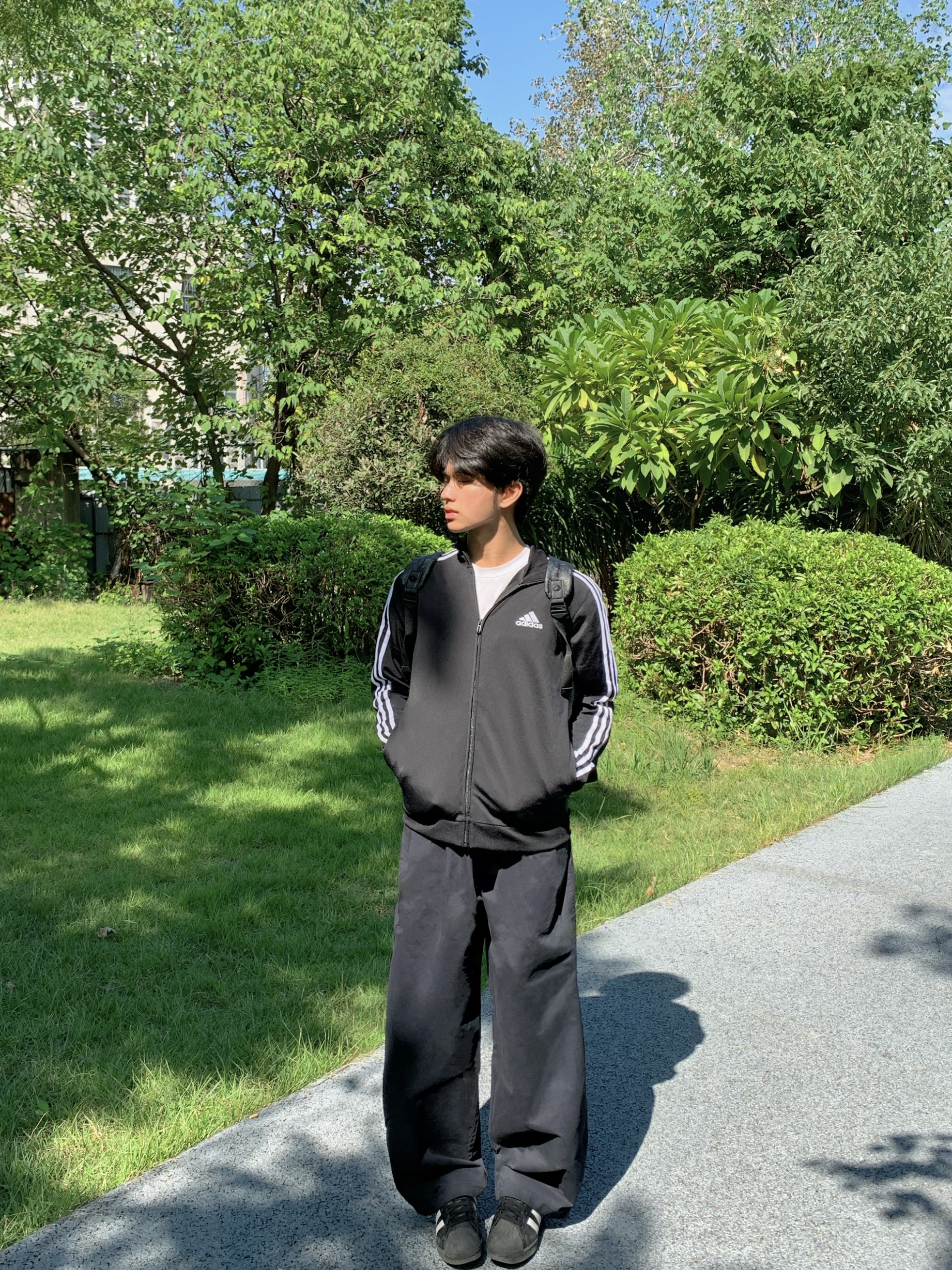 一身黑的adidas套装自带松弛感,经典三条纹元素让基础款不单调,宽宽松松的版型舒服又藏肉,配上同色系运动鞋,整体干净利落还很有少年感🌿 随便往小区绿化带一站,阳光一衬就很出片,日常上学通勤这么穿,舒服又不费力~