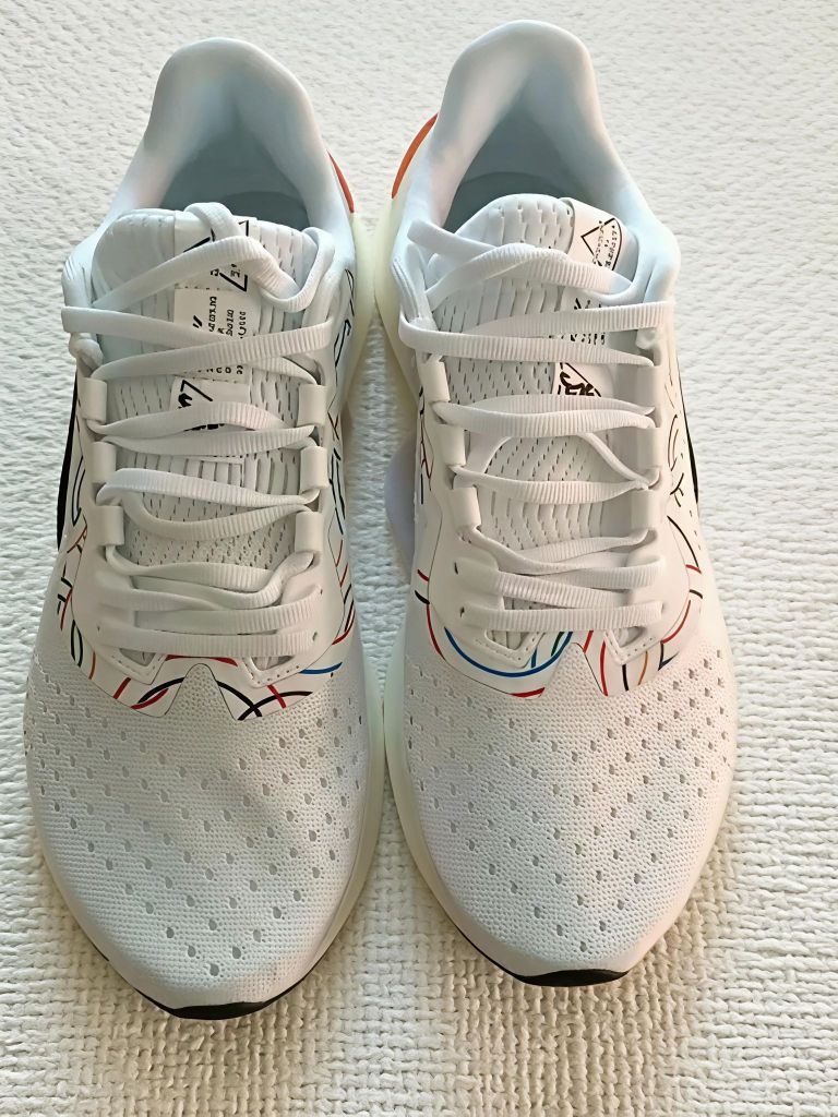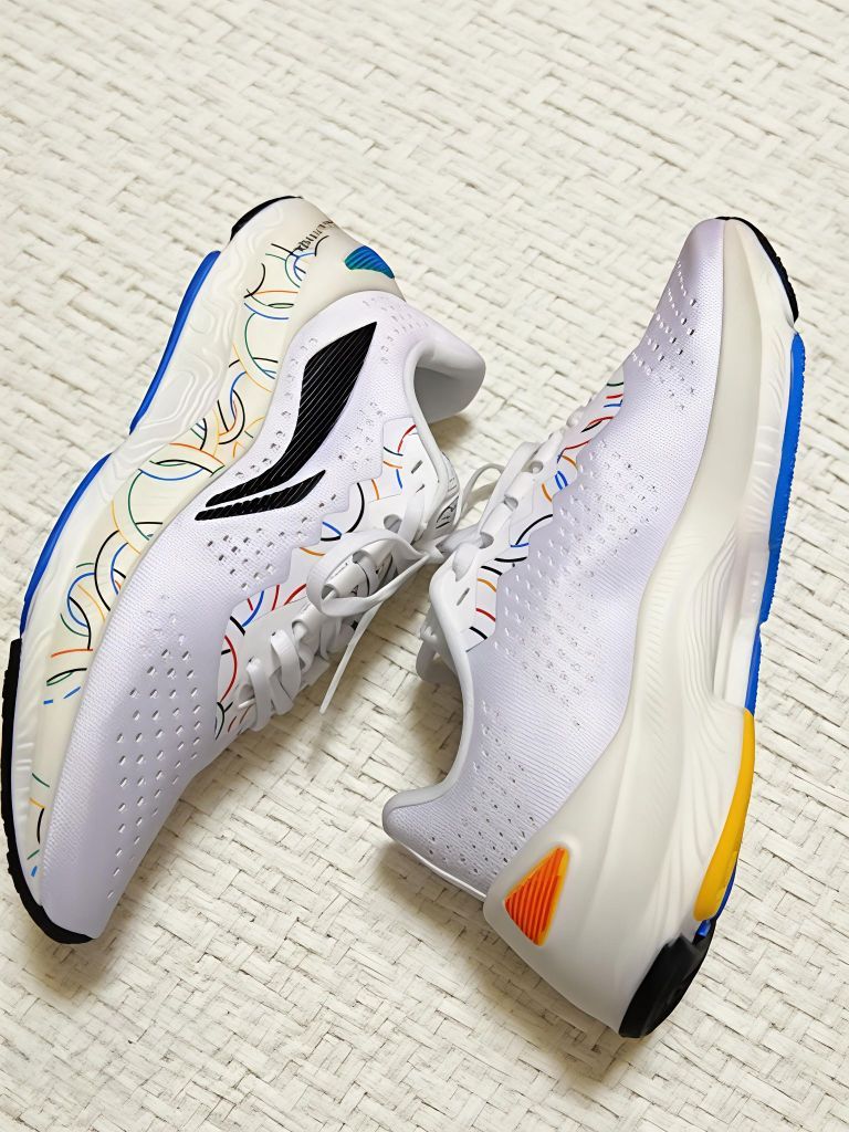 这双跑鞋白底色配彩色线条,简约又有活力✨,针织鞋面透气不闷脚,运动风造型日常配运动装、休闲装都很可~ 上脚软弹软弹的,跑步、日常遛弯都舒服,像给脚装了“弹簧”🚀,每次运动都想穿着它! 就是白色鞋面容易脏,得经常打理,不过看在它好穿又好看的份上,这点小缺点可以忍啦~