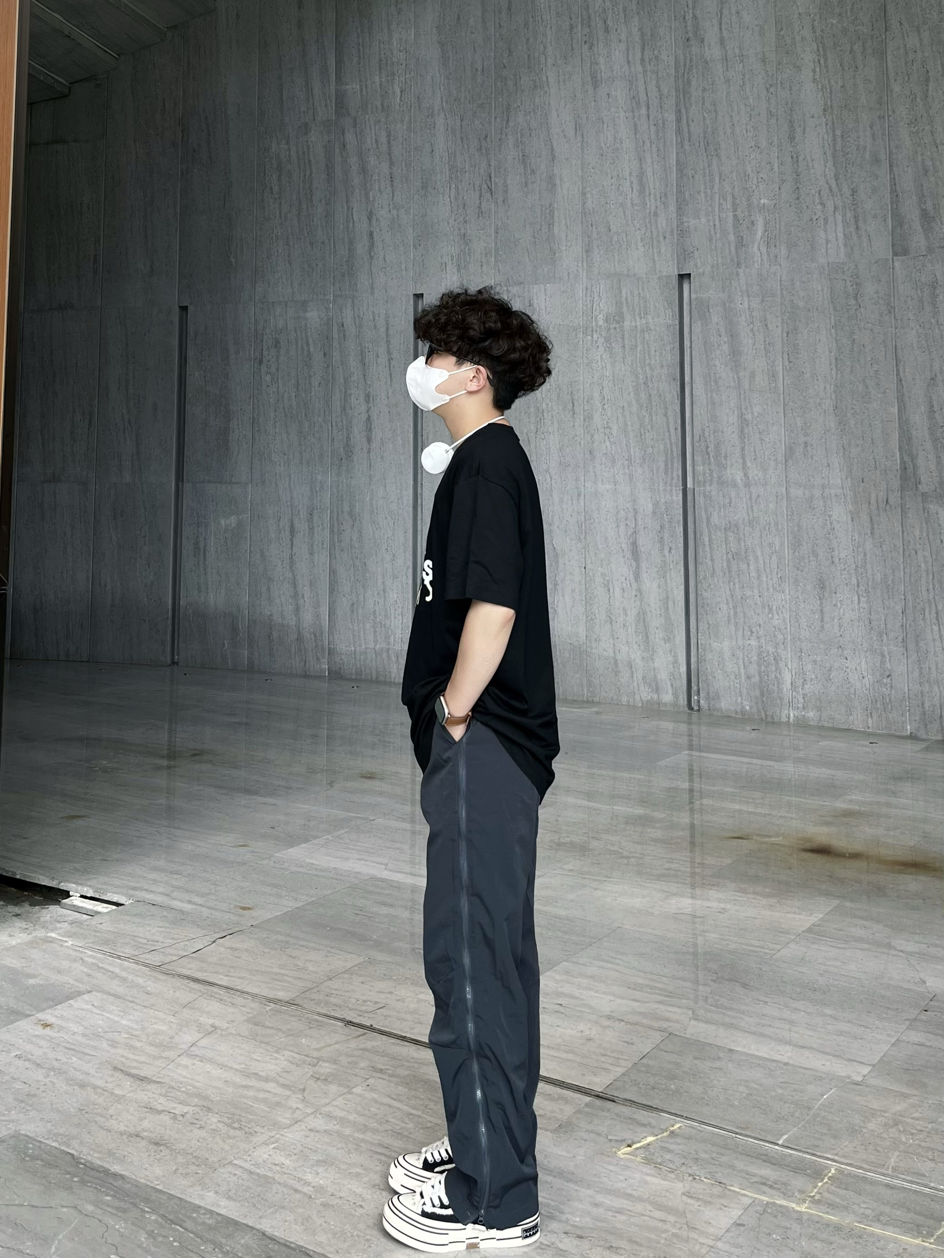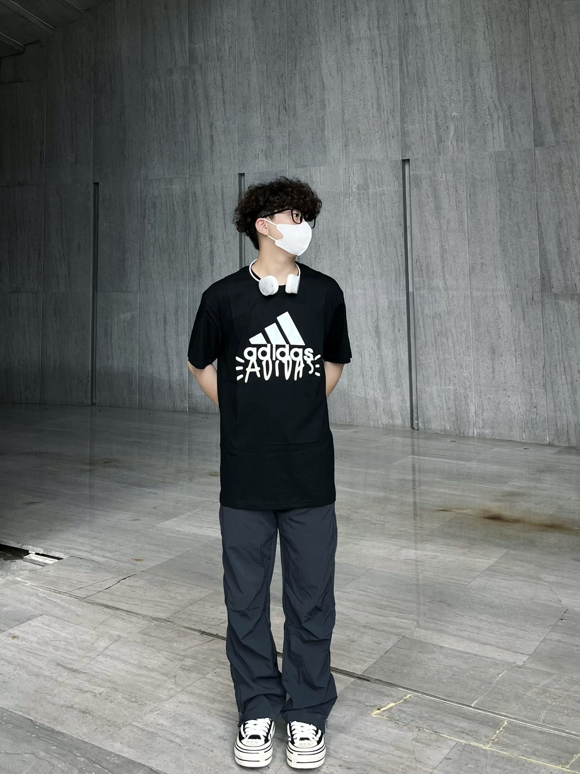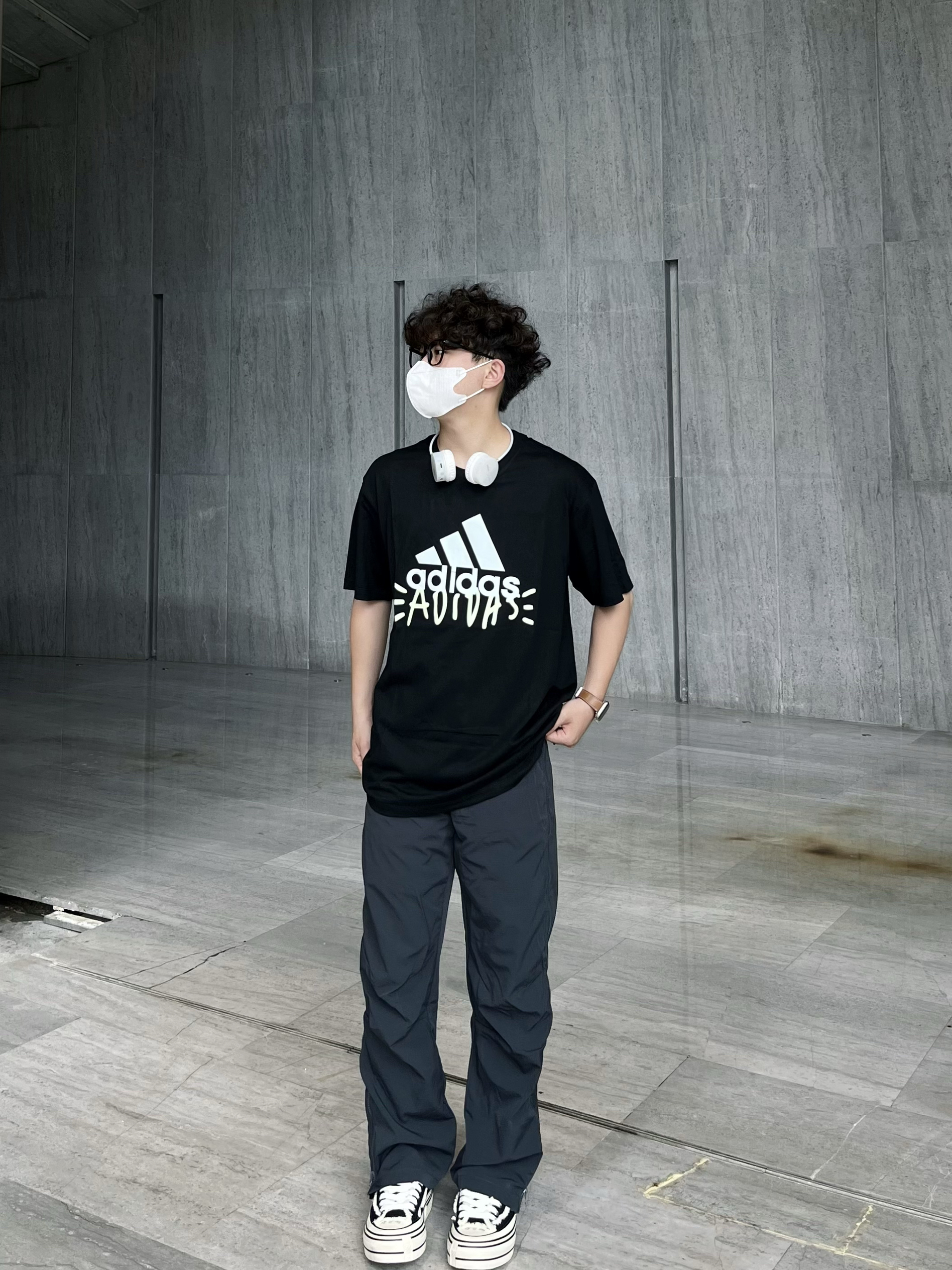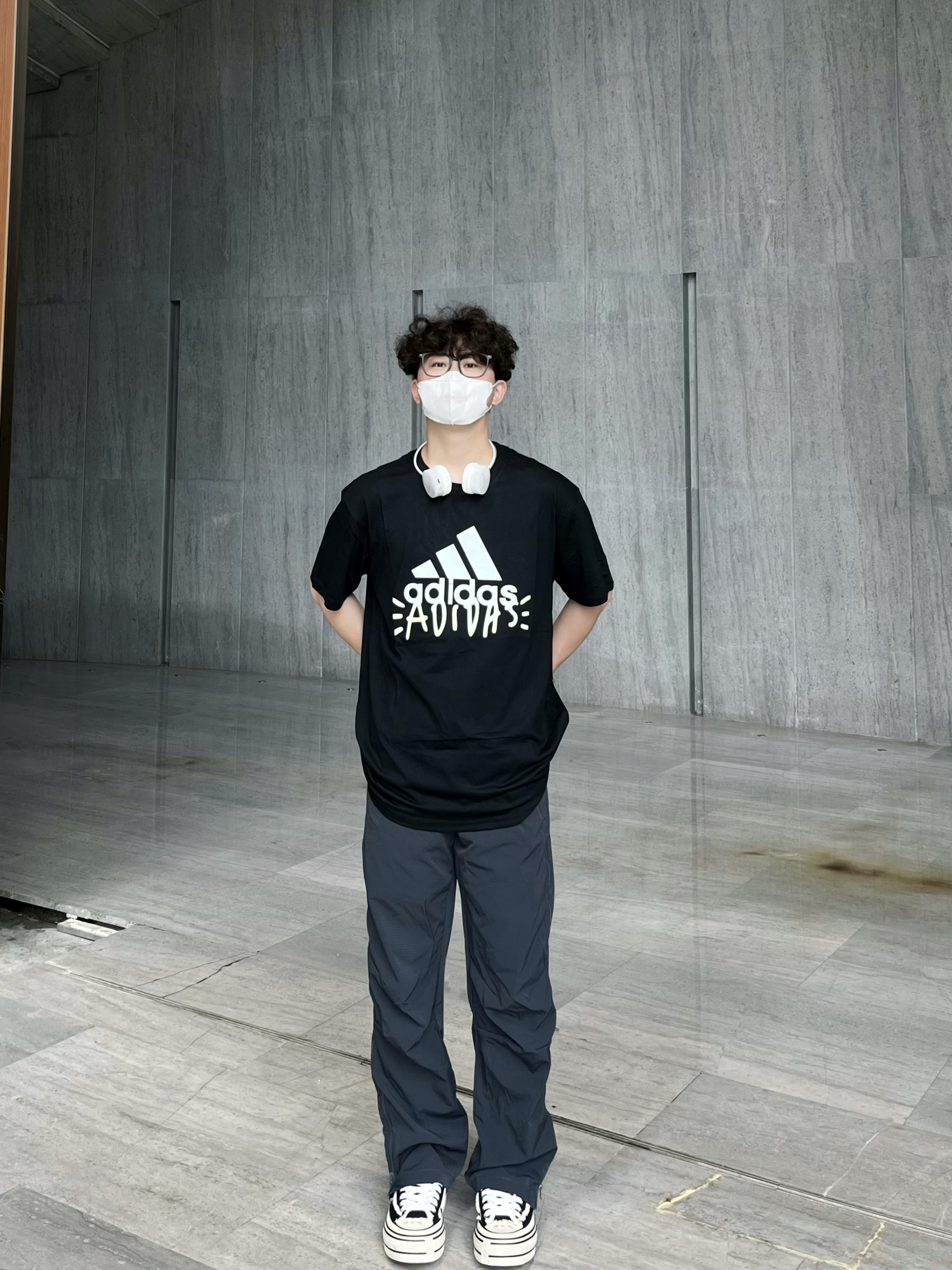今天的户外outfit穿搭✔️ 上身是一件阿迪的印花T恤 黑色还是百搭很耐看 裤子搭配一条黑灰色的拉链裤 一身偏黑色系基础简约⚫️