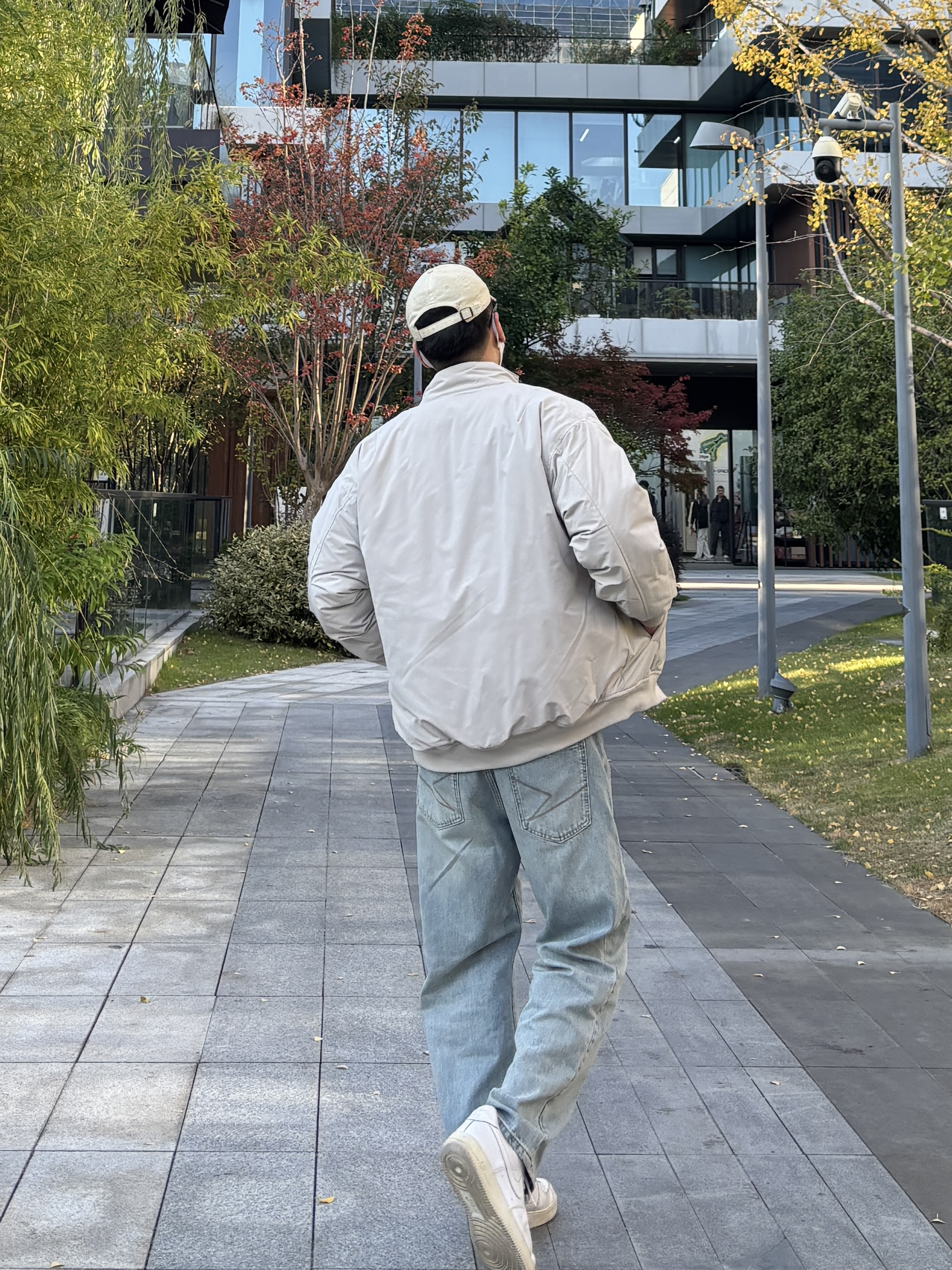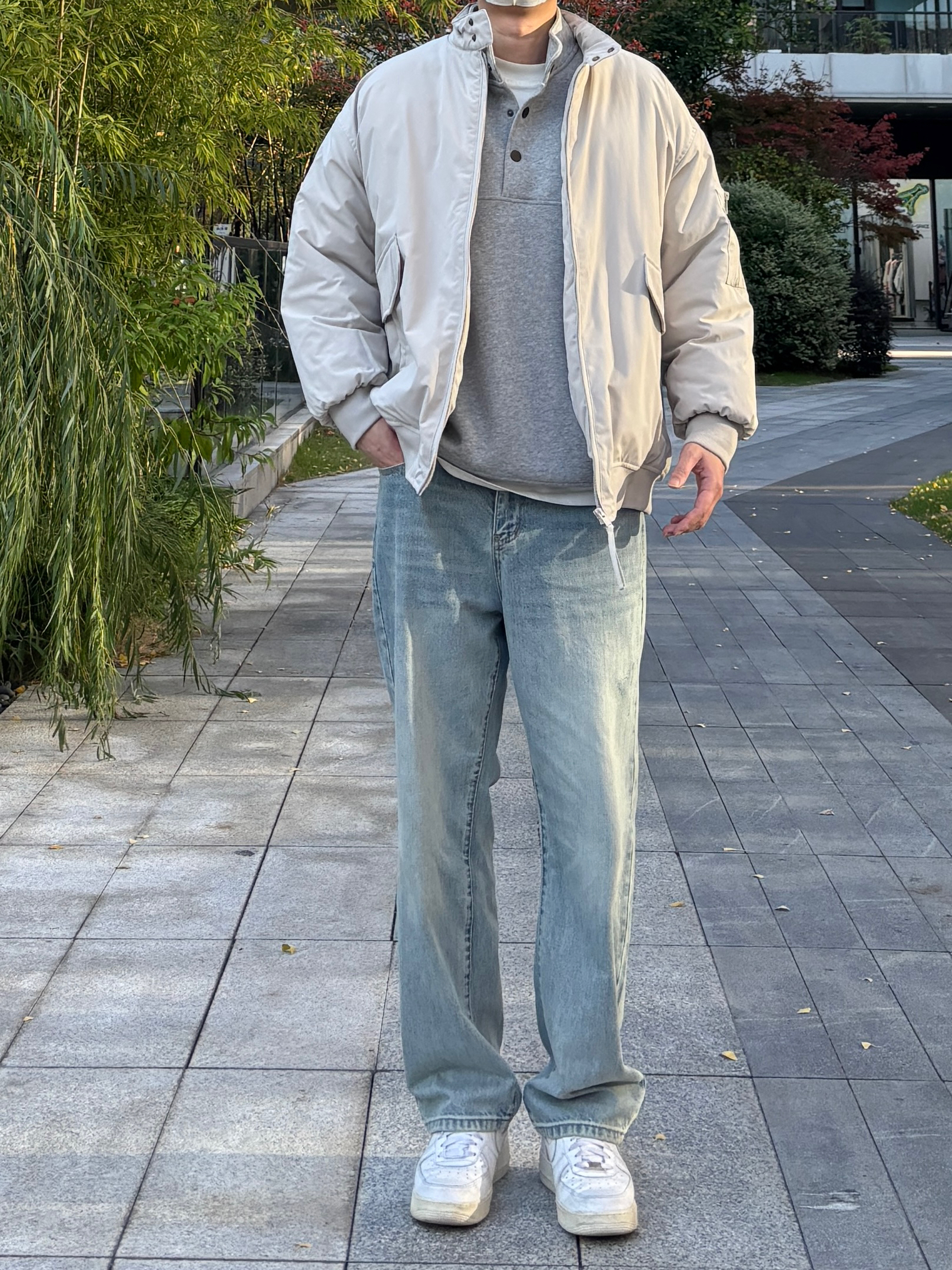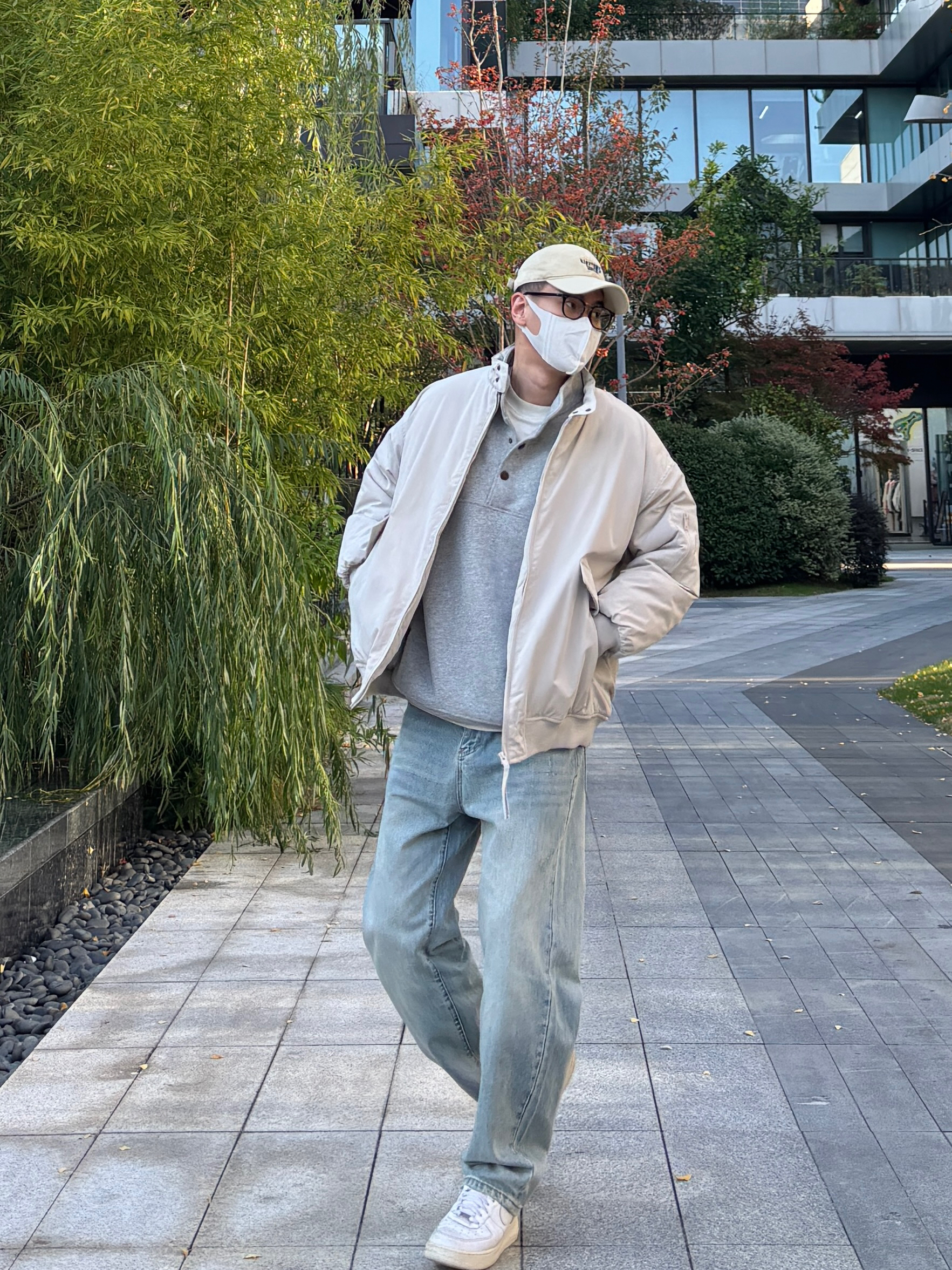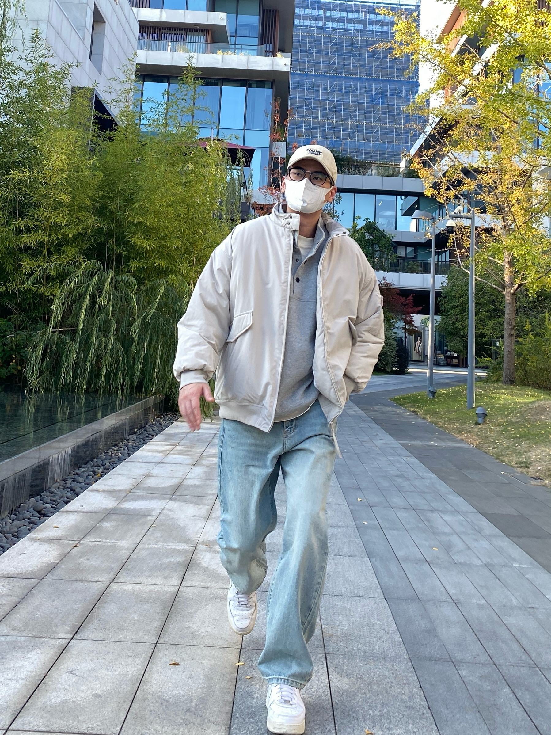 冬天不要只穿黑灰这些深色,偶尔也可以试一下浅色系穿搭,更有少年感。 灰色开胸卫衣搭配米白色立领棉服,再选择一条浅蓝色水洗牛仔裤和纯白色低帮皮质板鞋,简单随意,清爽又帅气✌️ - 衣服裤子:NICE LILI 鞋子:AF1纯白