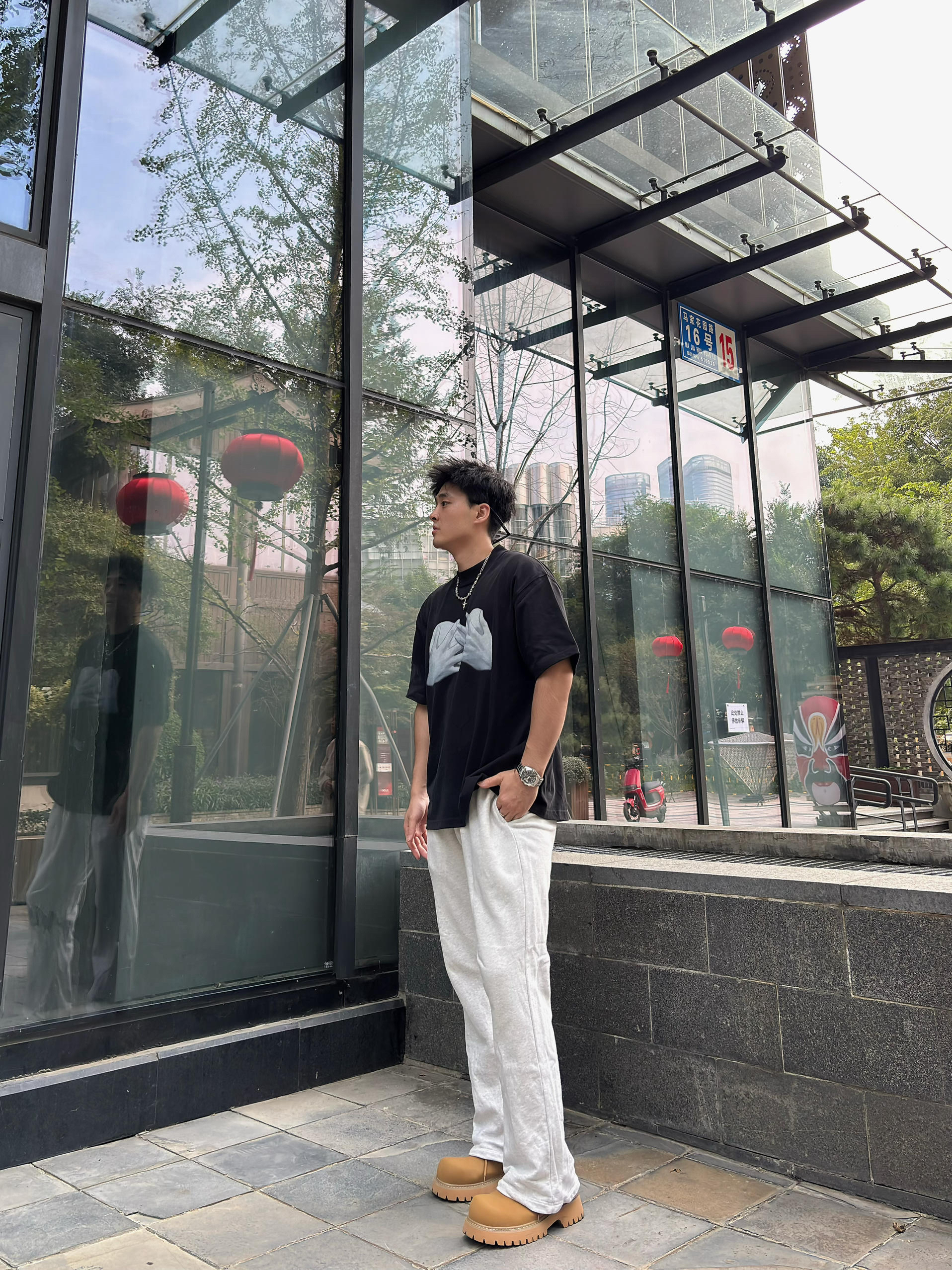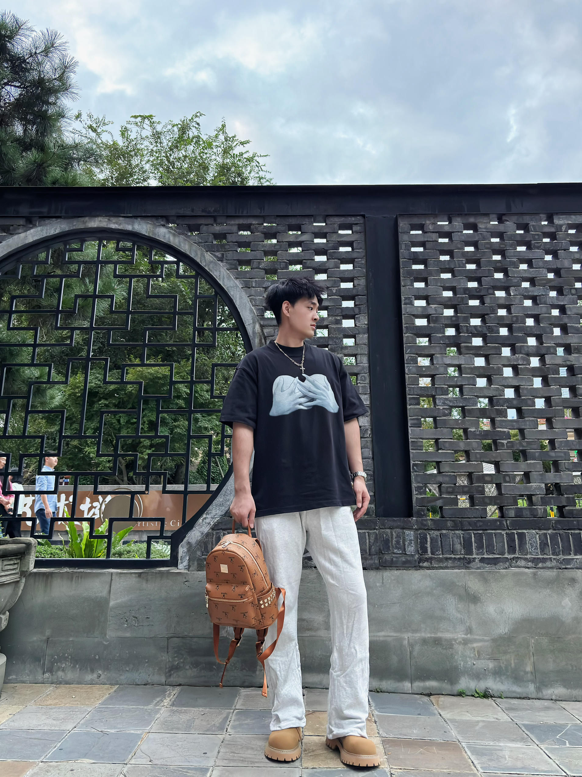 180cm|75kg,身上这套街头国风混搭绝了! Oversize黑T宽松不压身,白色阔腿裤显高还藏肉,棕色工装靴复古又百搭,马克华菲老花背包点睛质感。在老街区一穿,潮流与国风的碰撞,出片率直接拉满~ 🧍♂️ 穿搭风格:街头穿搭 👔 上衣:For Fear That 👖 下装:PODGORNOI 👟 鞋子:KREATE 🎒配饰:马克华菲