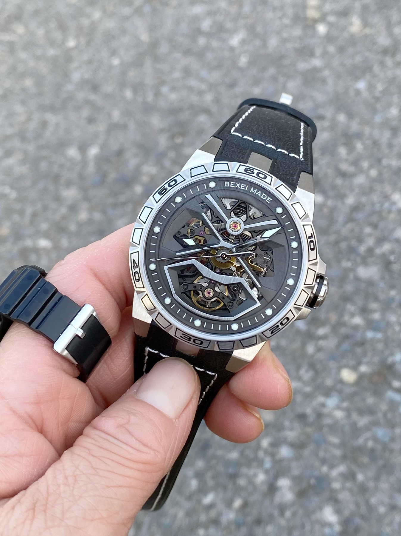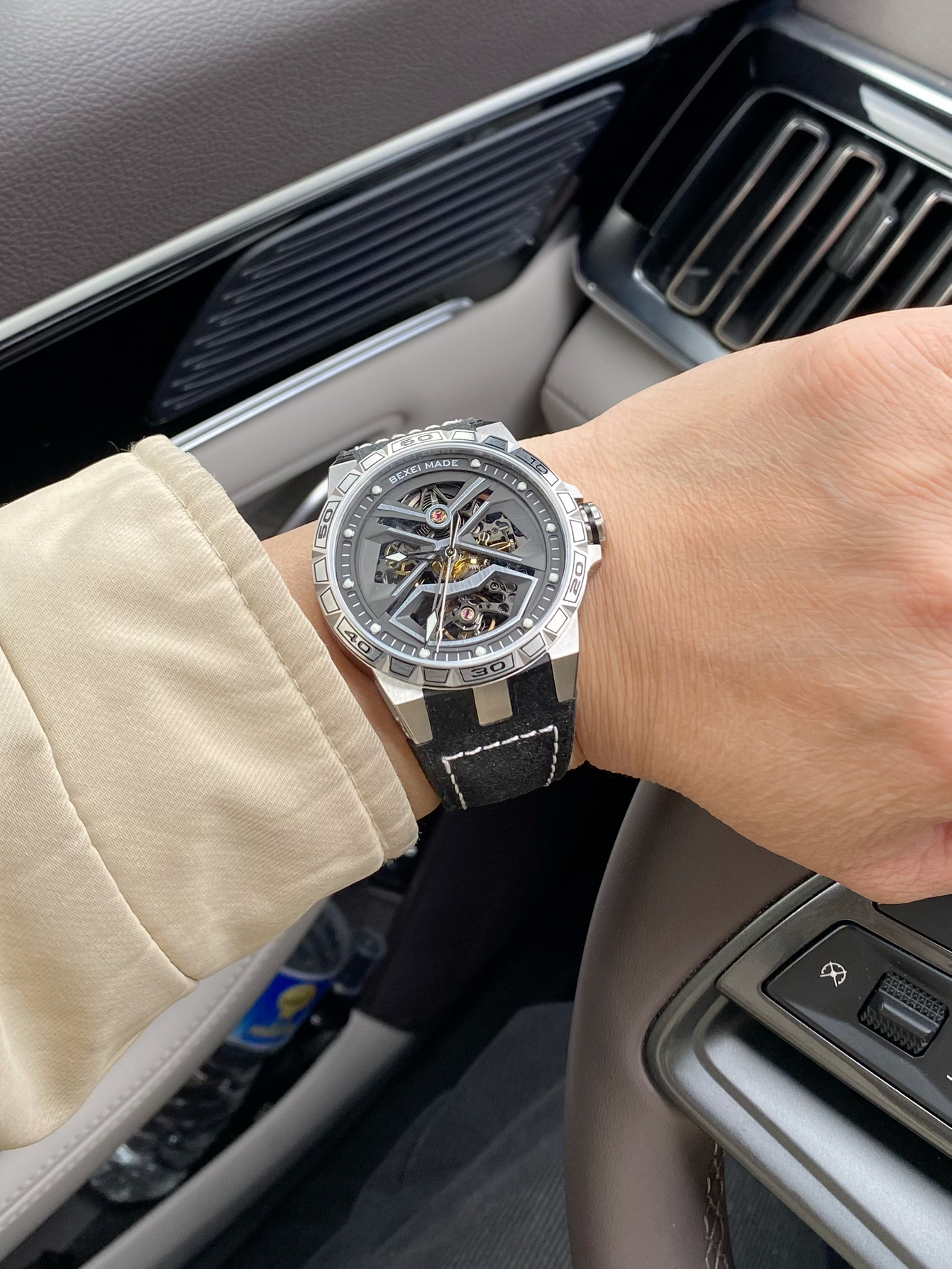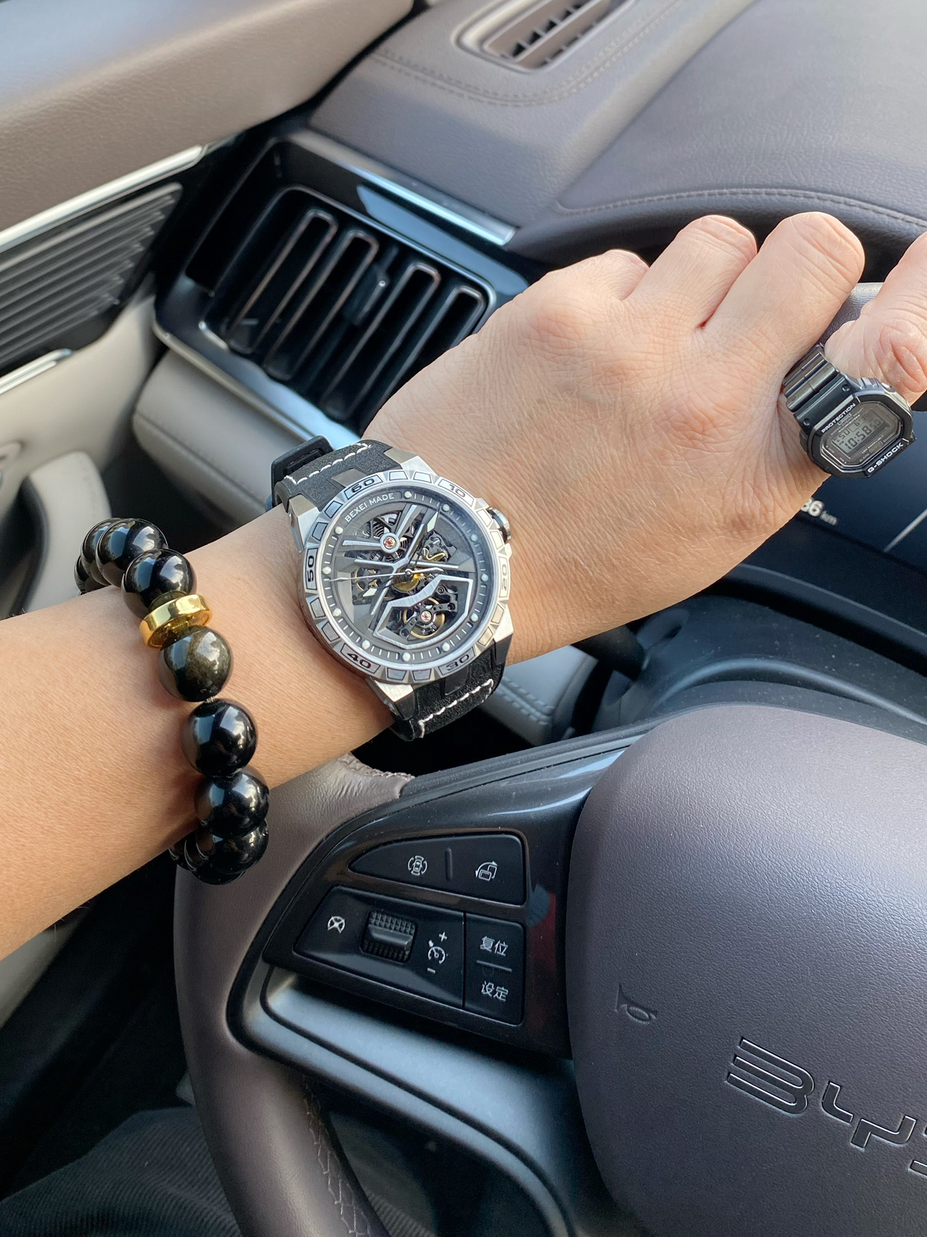 黑皮表带摸着特别软和,最绝的是表盘,能看到里面的机械零件在转动~ 不管是上班戴还是跟朋友出去玩,戴这块表都特别有面儿。