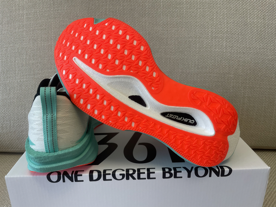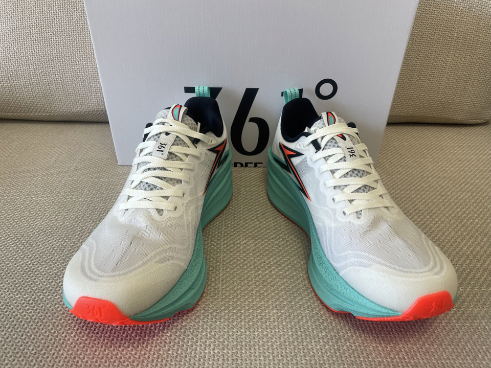 鞋子型号: 361° 飞燃4MIX 极光 训练竞速跑鞋 货号:672512204-1 👟外观:鞋子整体由白色透气贾卡织布覆盖,左侧、右侧、前侧由韧性十足的轻薄覆盖,显得十分轻薄,鞋带处与鞋跟处由轻薄的柔性材料组成,在尽可能轻的设计下增加了与脚的接触舒适性。 鞋底则有抗扭炭板、缓震层、防滑层组成。在厚实加宽的缓震层中做了漏空处理,可以在中间看到碳板情况,并且不失稳定性,设计巧妙。 上...