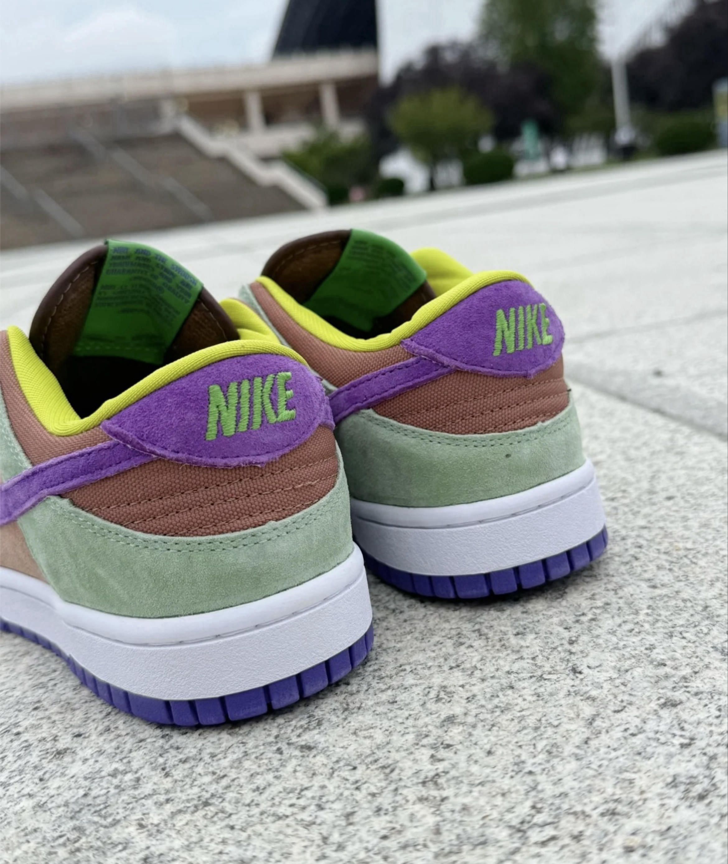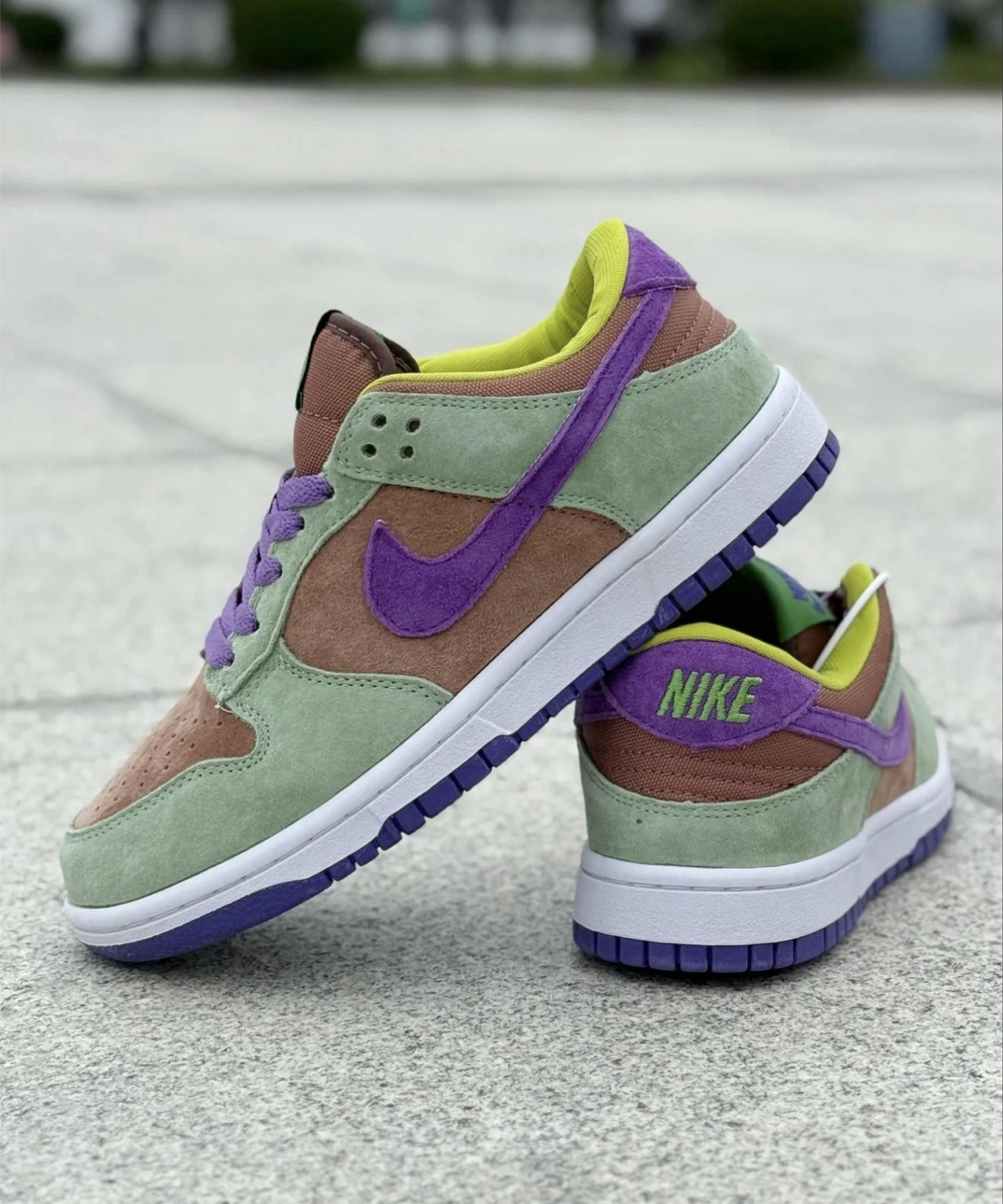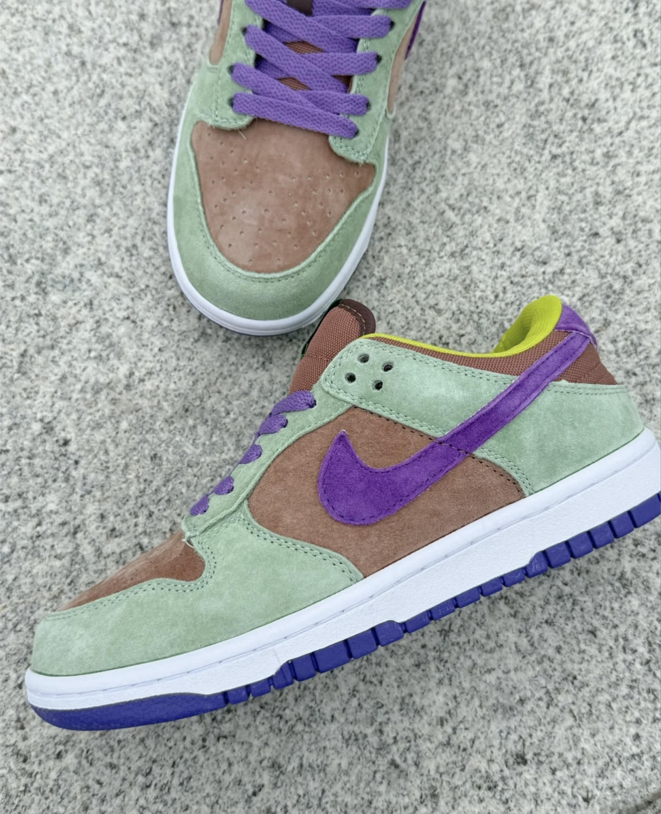 我还是很喜欢DUNK的,主要是鞋型好看,虽然脚感相较运动款差一些,颜值战胜一切! 这个丑小鸭配色很独特,绿色加紫色、褐色,真的有点绝,上脚感觉比较有活力,少年感很强,麂皮材质相较皮面更加有质感一些,这个配色搭浅色牛仔裤、或者工装裤都很不错,男女同款,做情侣款也蛮不错!