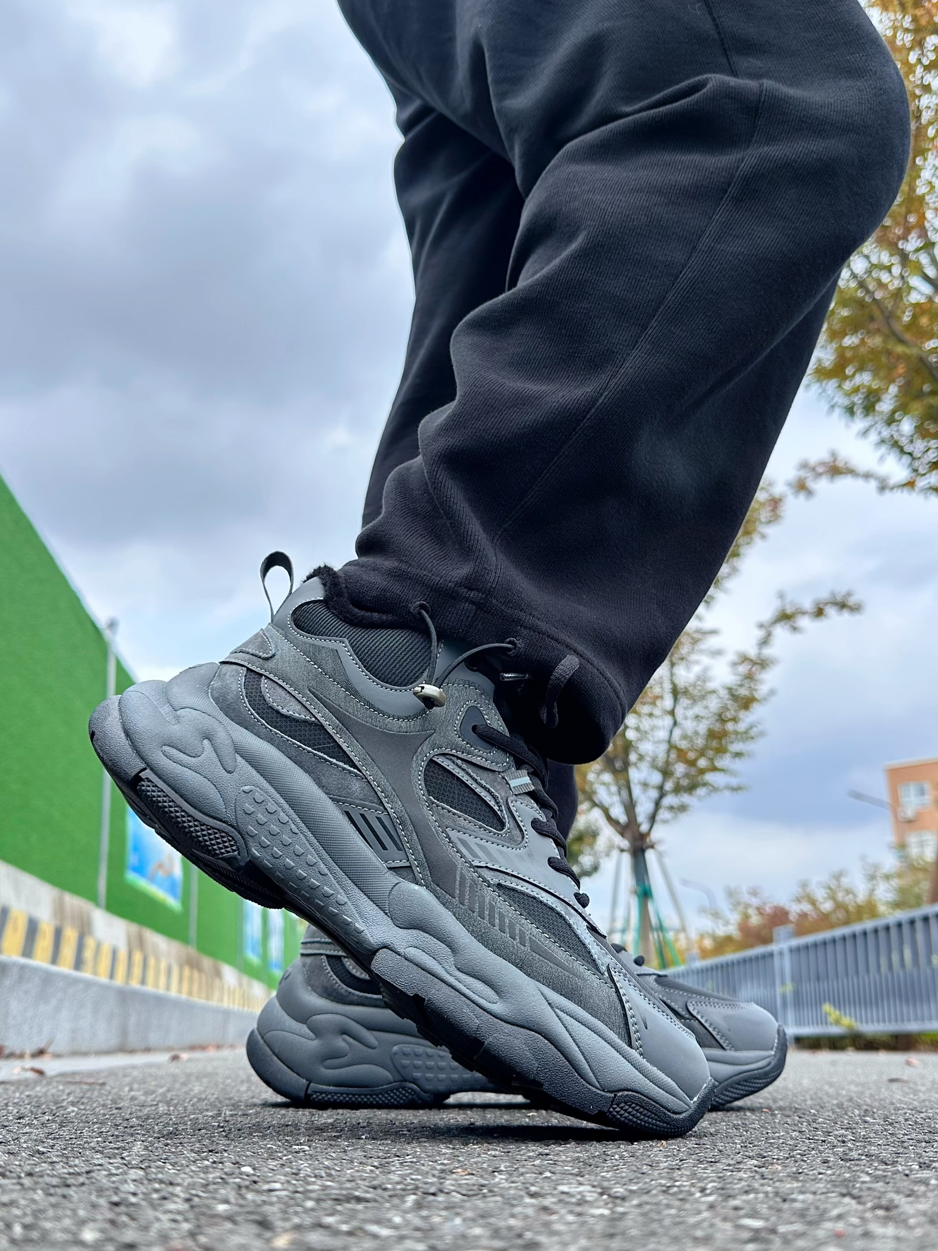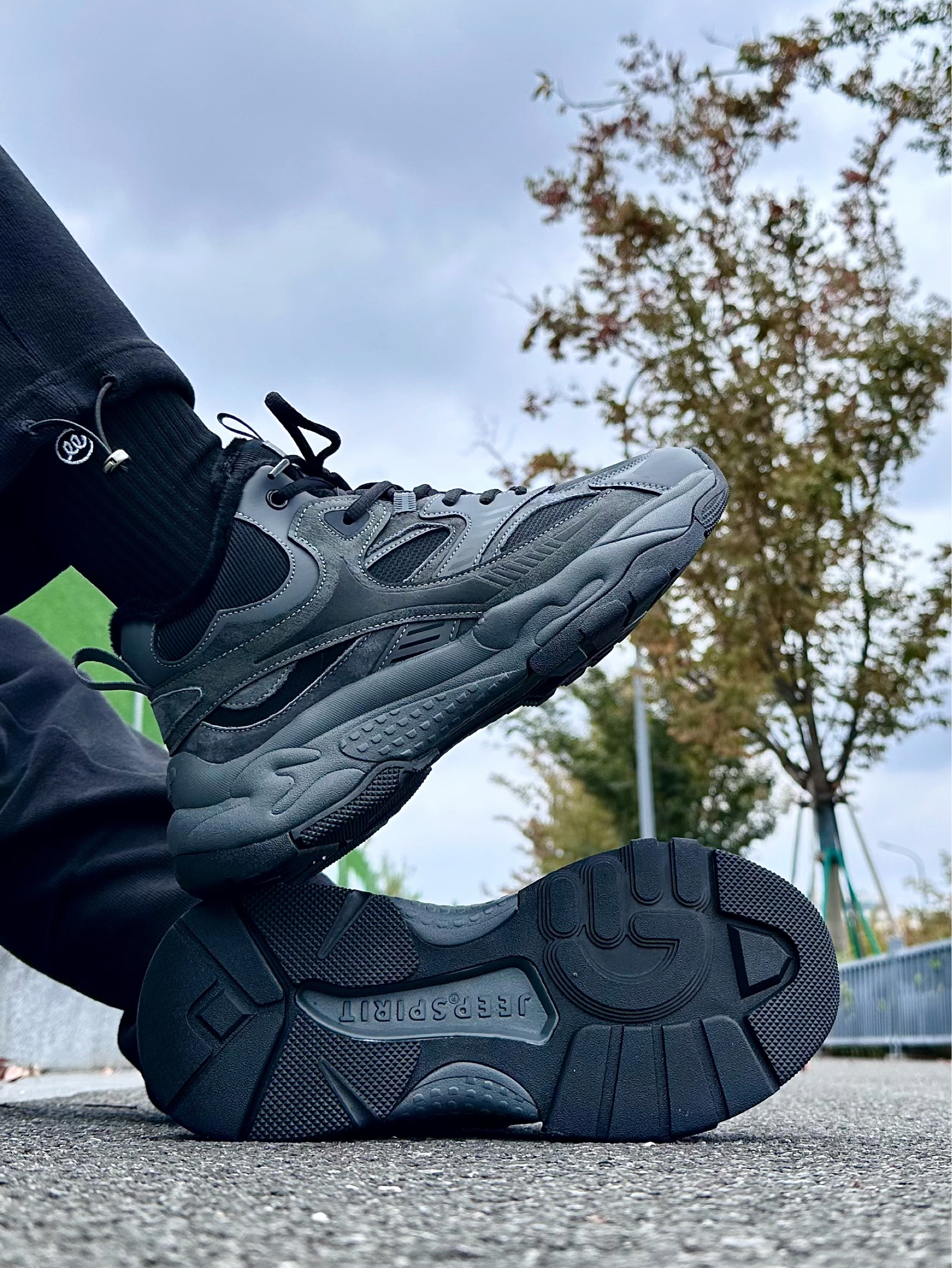 每次不知道穿什么鞋子的时候,黑武士配色总是能够给我托底! 最近对于黑武士鞋子比较着迷,频繁上脚的是jeep 家的黑武士配色鞋子,鞋面采用深灰色皮革➕黑色网格织物拼接而成,搭配上黑色发泡🧼大底,颜值感比较在线! 穿着上脚踩起来脚感软硬适中,包裹感比较不错能够将脚掌牢牢包裹起来暖暖的比较舒服,鞋底外侧的橡胶大底也比较耐磨抗造 简单搭配了一件黑色长裤➕外套🧥,一整套黑武士配色上身也好看呀!