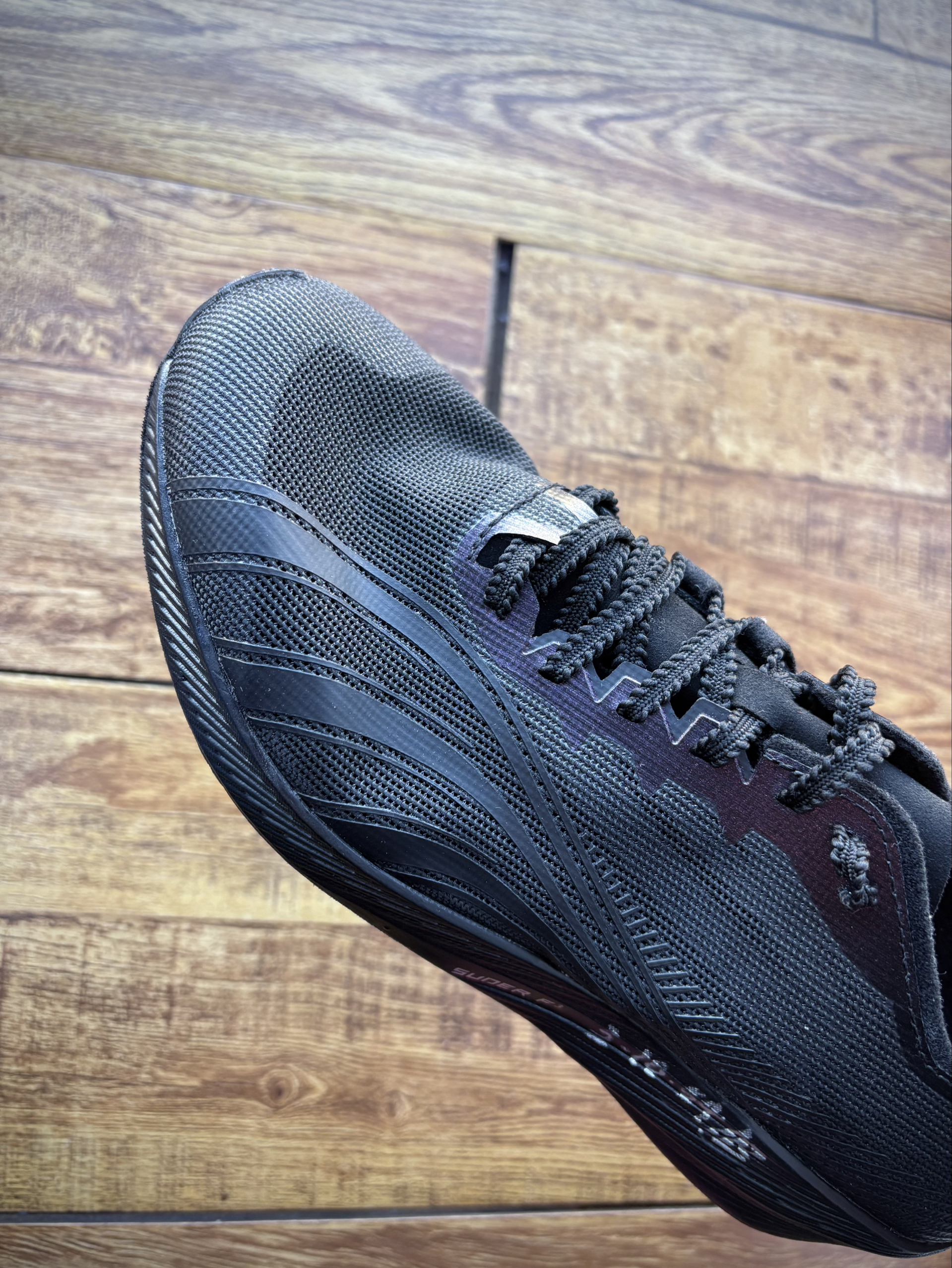 同为测试版的黑色隐忍二非常帅气有没有? 这个版本领口更大,鞋舌也换成了柔软的麂皮,更轻量,灵活,极致!