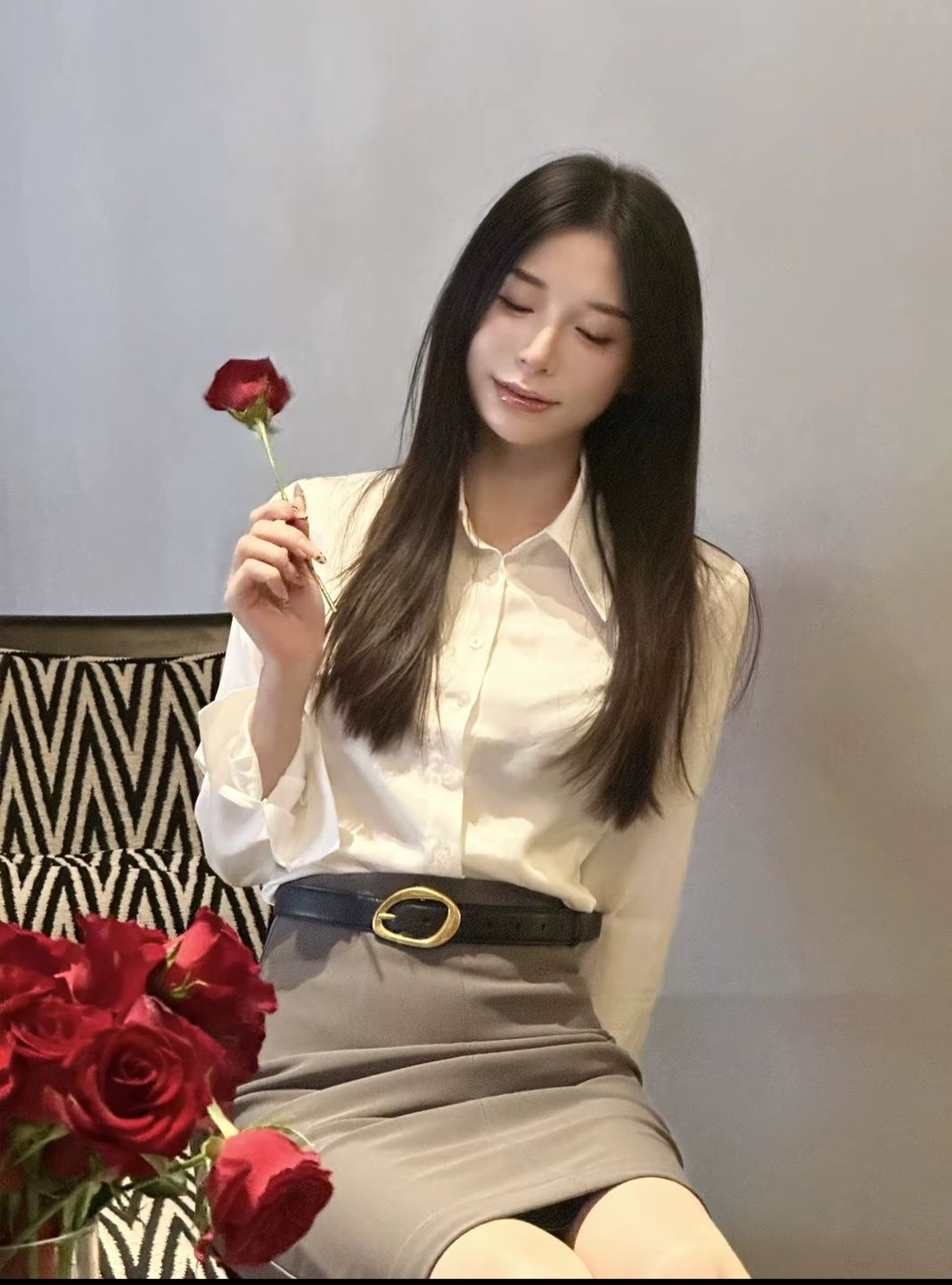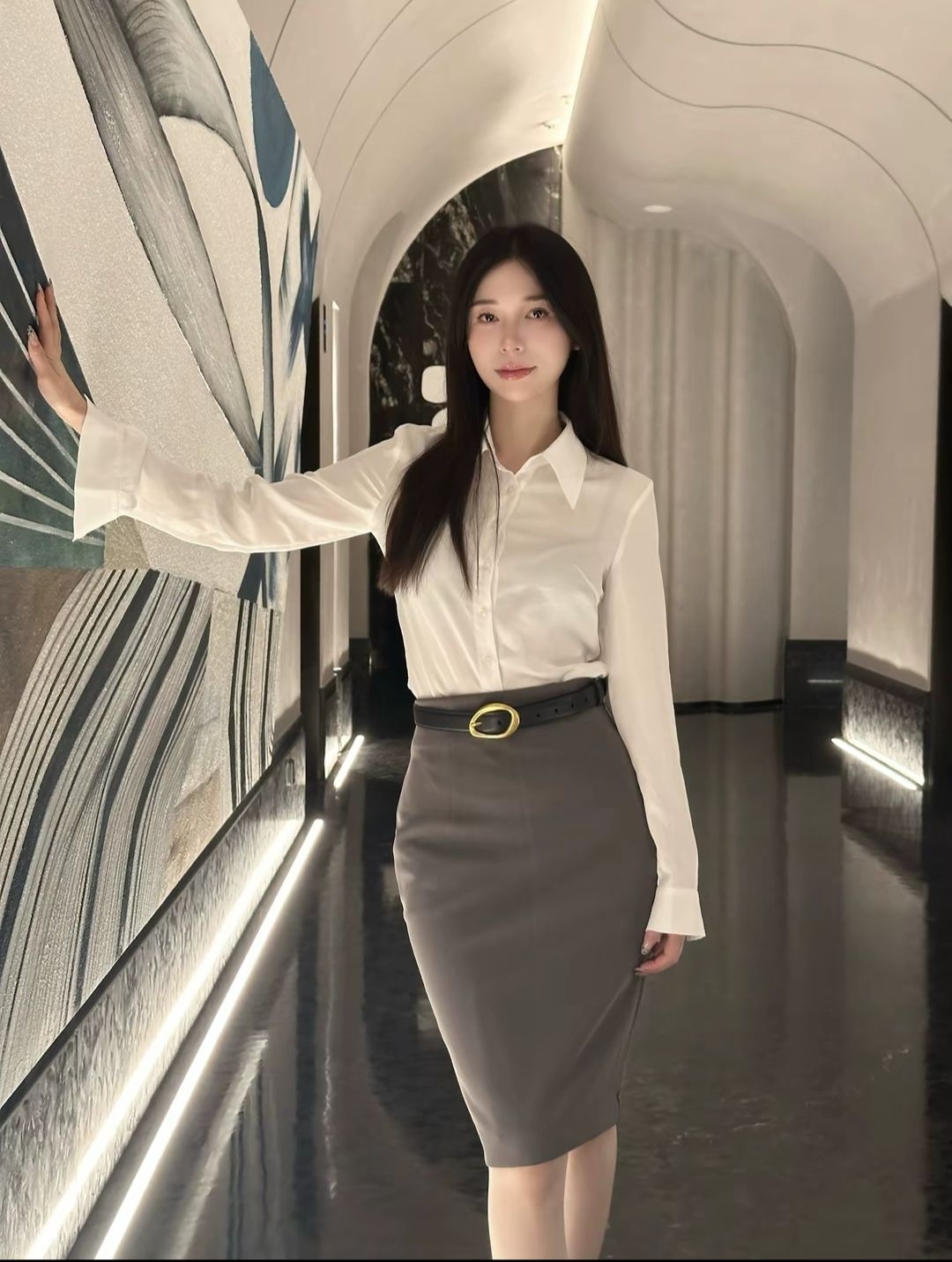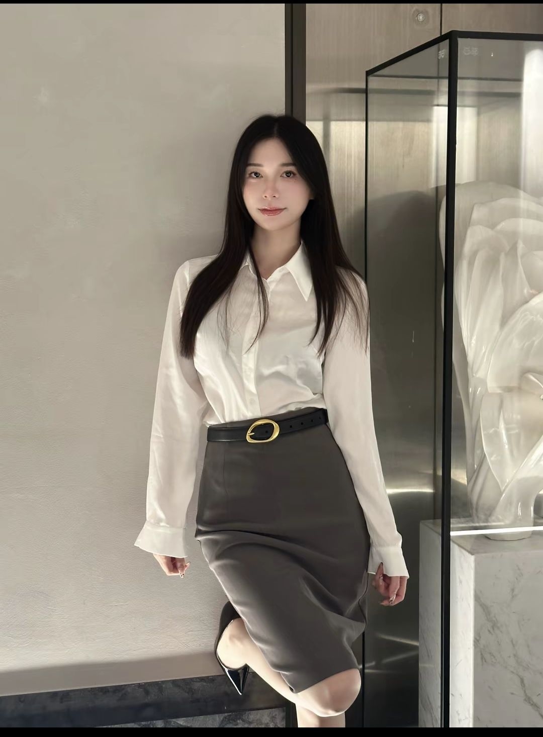今天是一身令人心动的职场穿搭~ 白色衬衣 搭配过膝包臀裙 再搭配一双高跟鞋👠干练又不失优雅 腰身特别搭配了一条腰带 意大利小众品牌 金属扣的设计非常精致 让整体造型搭配更加分也更有亮点 皮质柔软很有弹性 当腰带或者皮带感觉都不错 秋冬送礼🎁送女友都是非常不错的选择