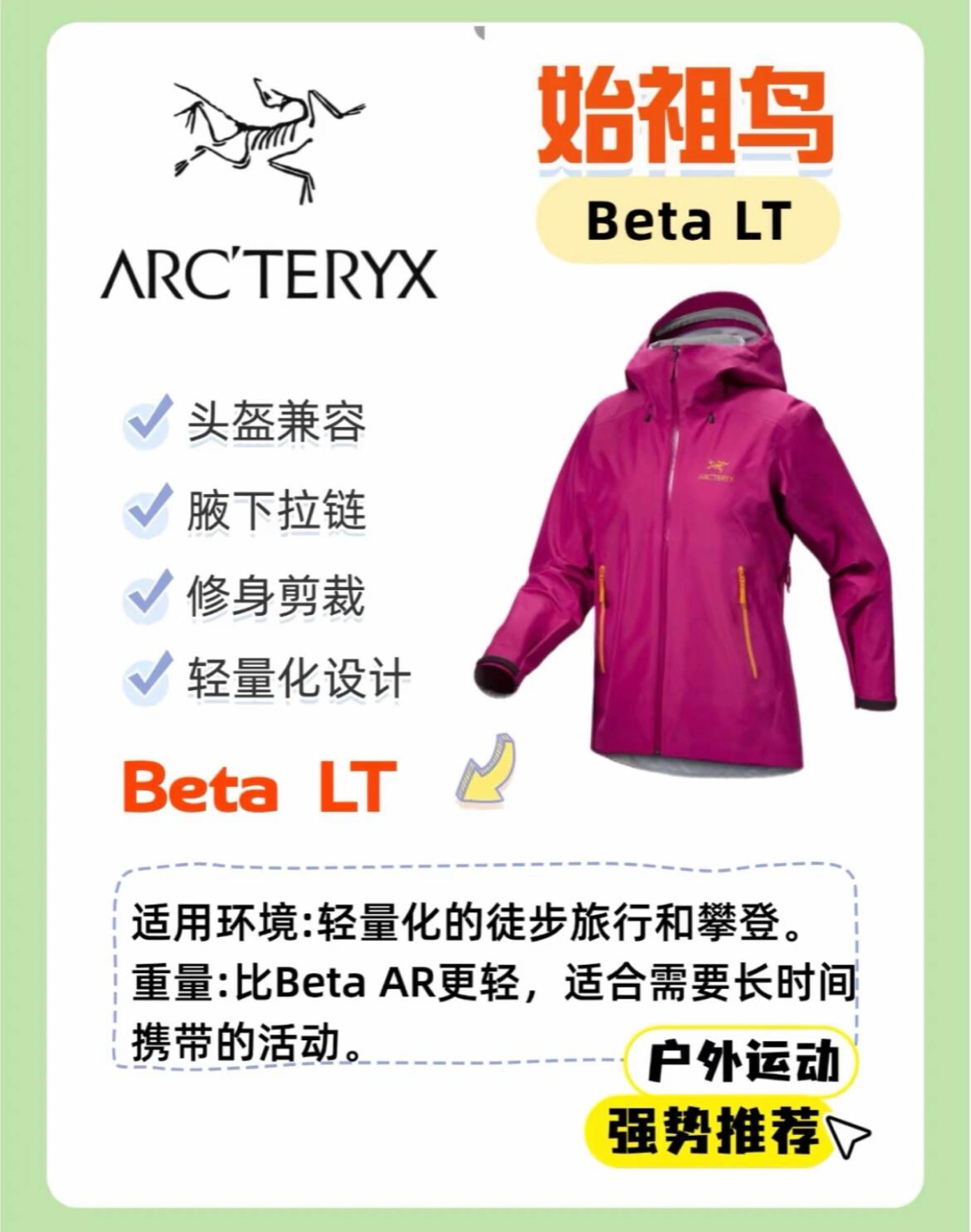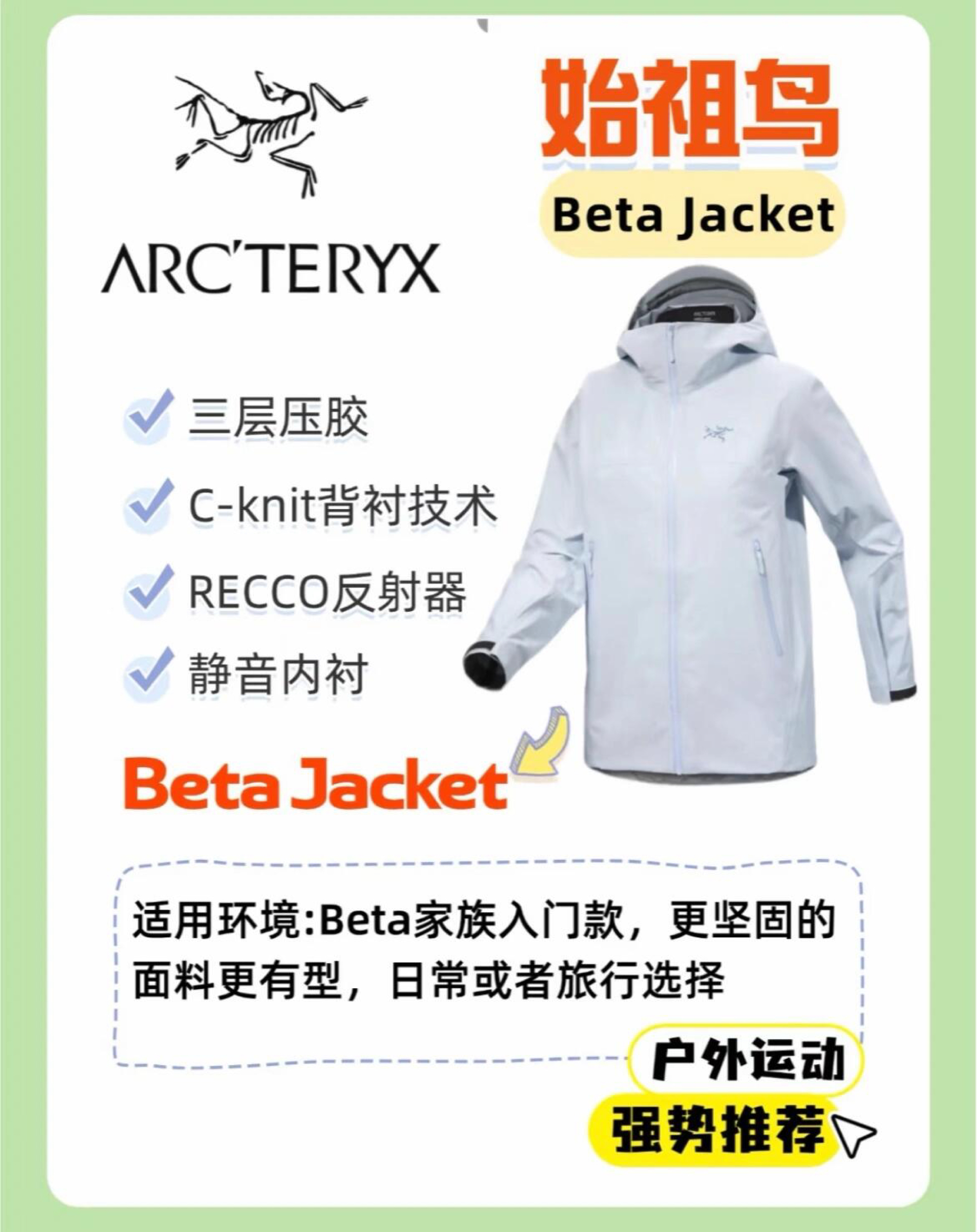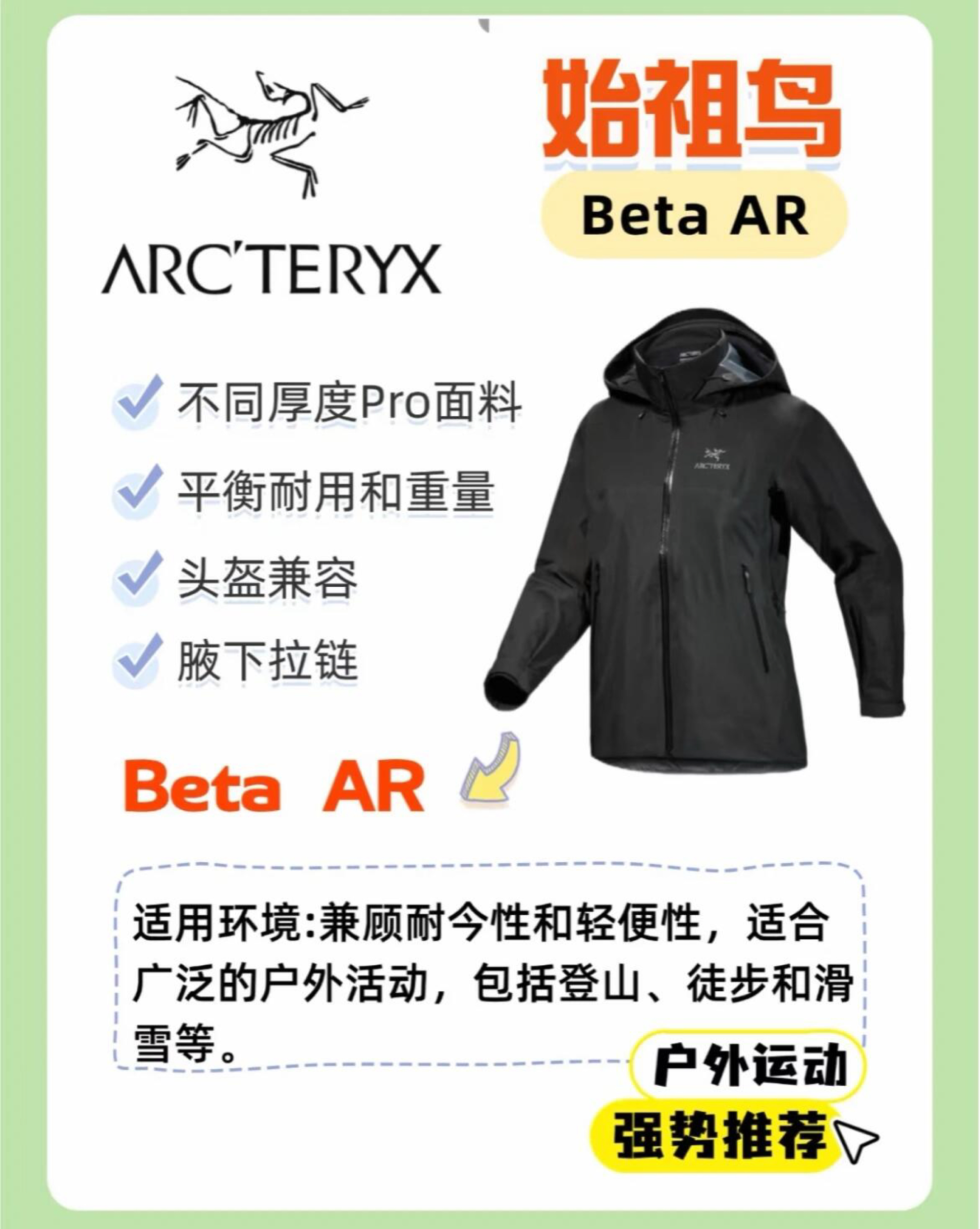 Beta AR:全能王者,一步到位选它! Beta LT:经典户外款 Beta Jacket:日常通勤+轻户外性价比之王! Beta SL:2024升级款,超轻量滑雪/徒步首选! 1⃣ Beta AR|硬核玩家的全能盔甲面料:GORE-TEX Pro 2.0,大身40D+肩肘80D耐磨加固,抗撕裂+抗摩擦满分!设计:连体风帽兼容头盔,腋下拉链透气,RECCO雪崩救援系统适合:登山、滑雪、恶劣天气徒...