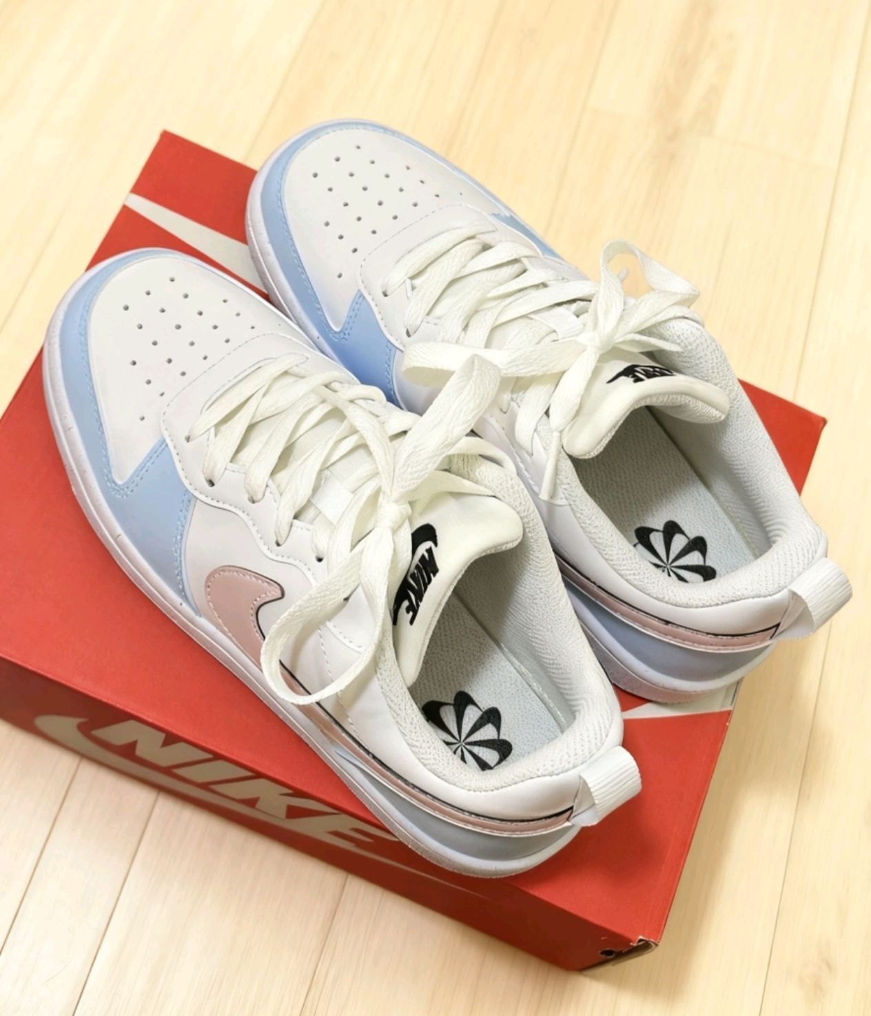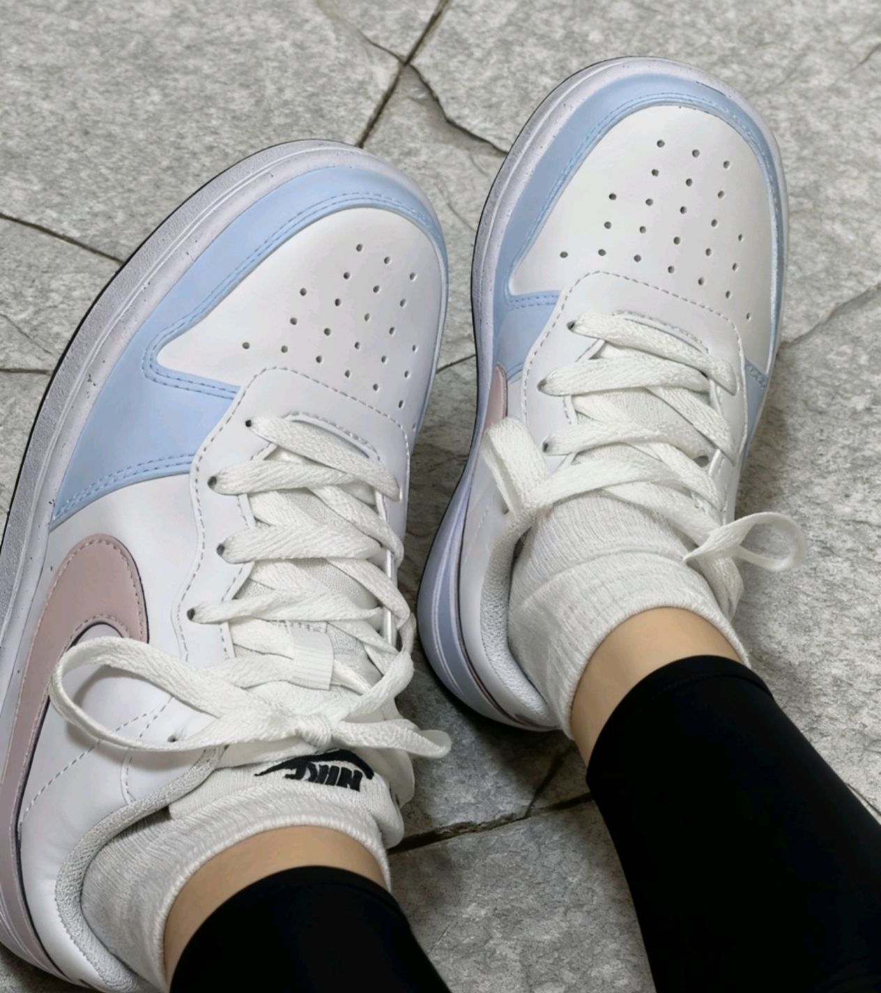 新拆的这双Nike太戳我审美了!淡粉色搭浅蓝拼接,勾子那抹淡粉直接把温柔感拉满,鞋型是那种利落的板鞋款,透气孔也够细节~刚从鞋盒拎出来质感就很在线,软乎乎的鞋舌和内里看着就好穿,准备搭牛仔裤配白袜出街,这清爽感直接焊在春夏穿搭里!