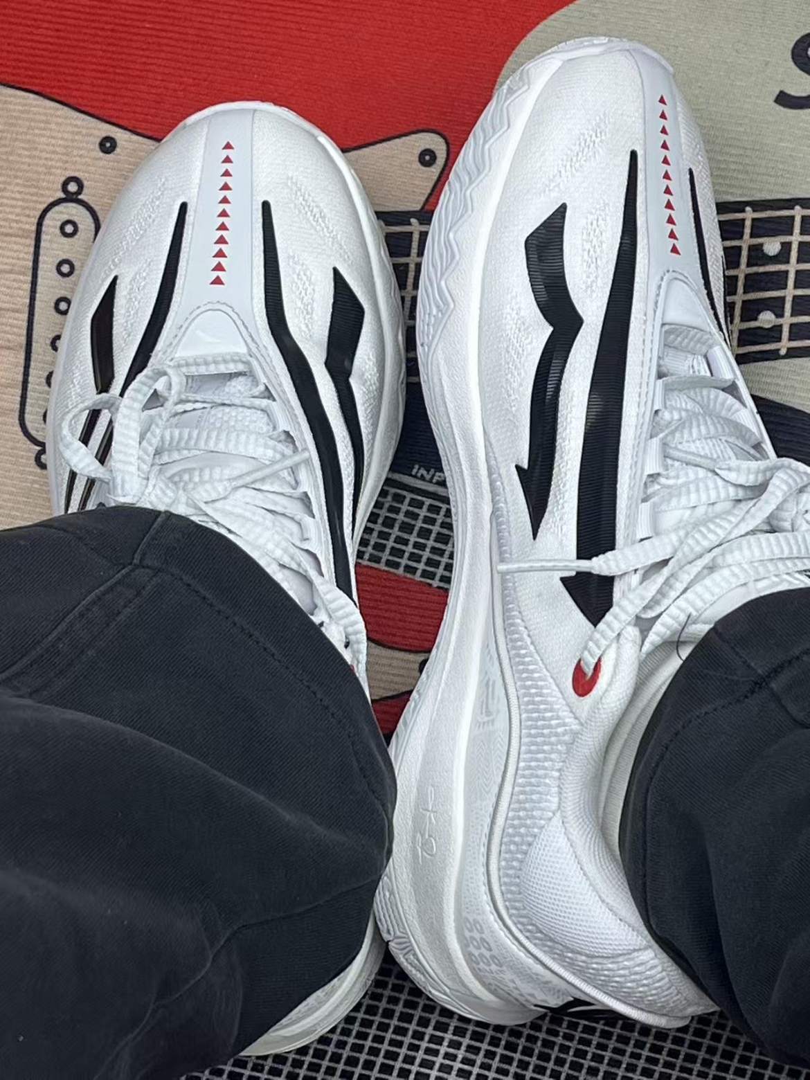 刚上脚是真轻,走久了脚底板也没太沉的感觉,这点还挺舒服的🤔简直是经常运动的人的福星。 但白鞋的通病它没躲掉——才穿三次,鞋头侧面就蹭了点灰印,拿湿巾擦半天没完全掉,有点费打理🧹。 鞋底的纹路看着深,去打球时不小心踩了块湿砖地,差点滑一跤,抓地力没想象中稳。 鞋舌有点软,系紧鞋带后会往一边歪,得时不时调整下,很多鞋子的通病。 不过日常随便穿穿还行,配黑裤子确实显干净,就是得接受它“不...