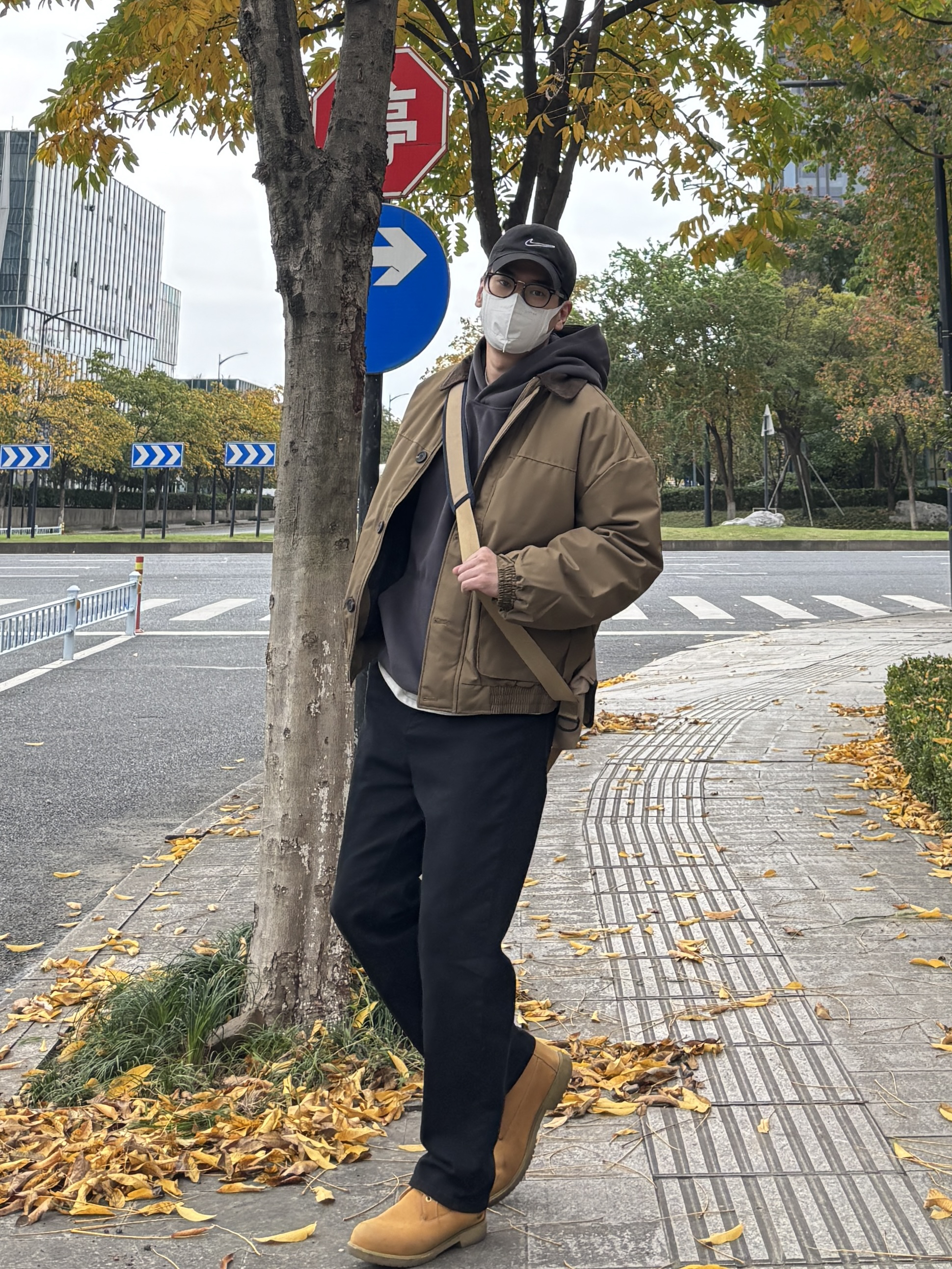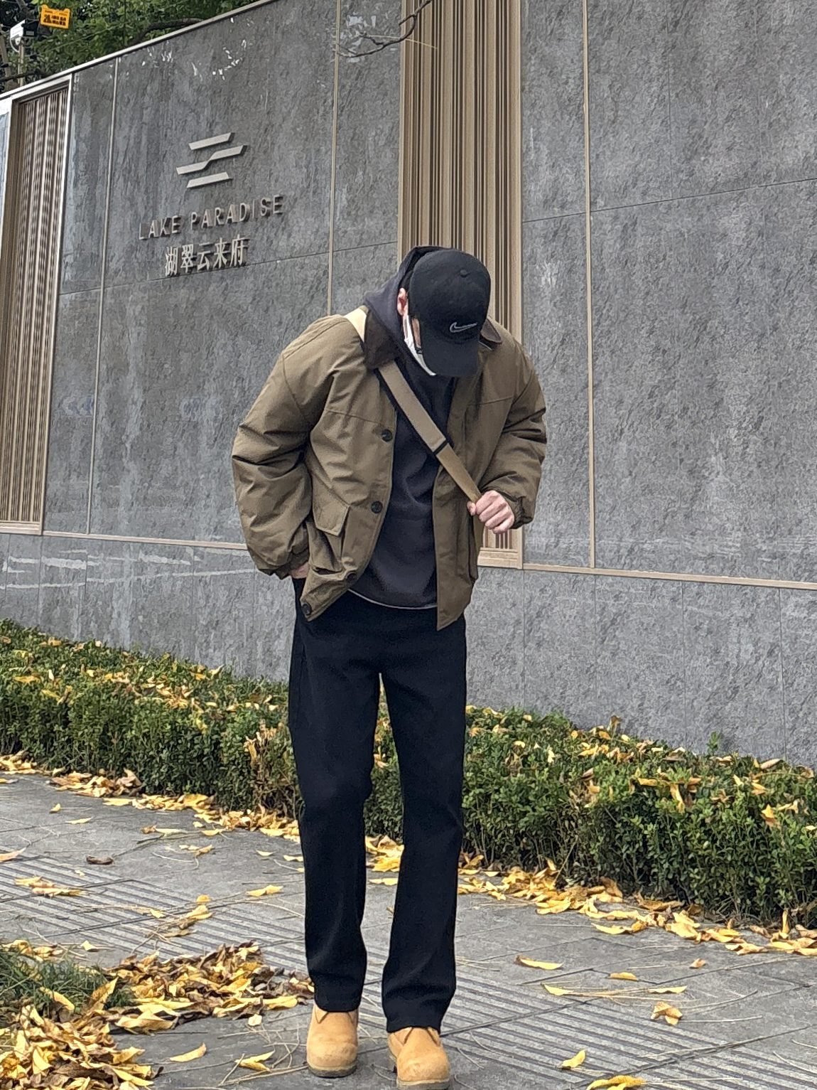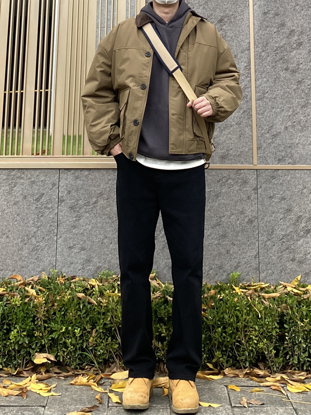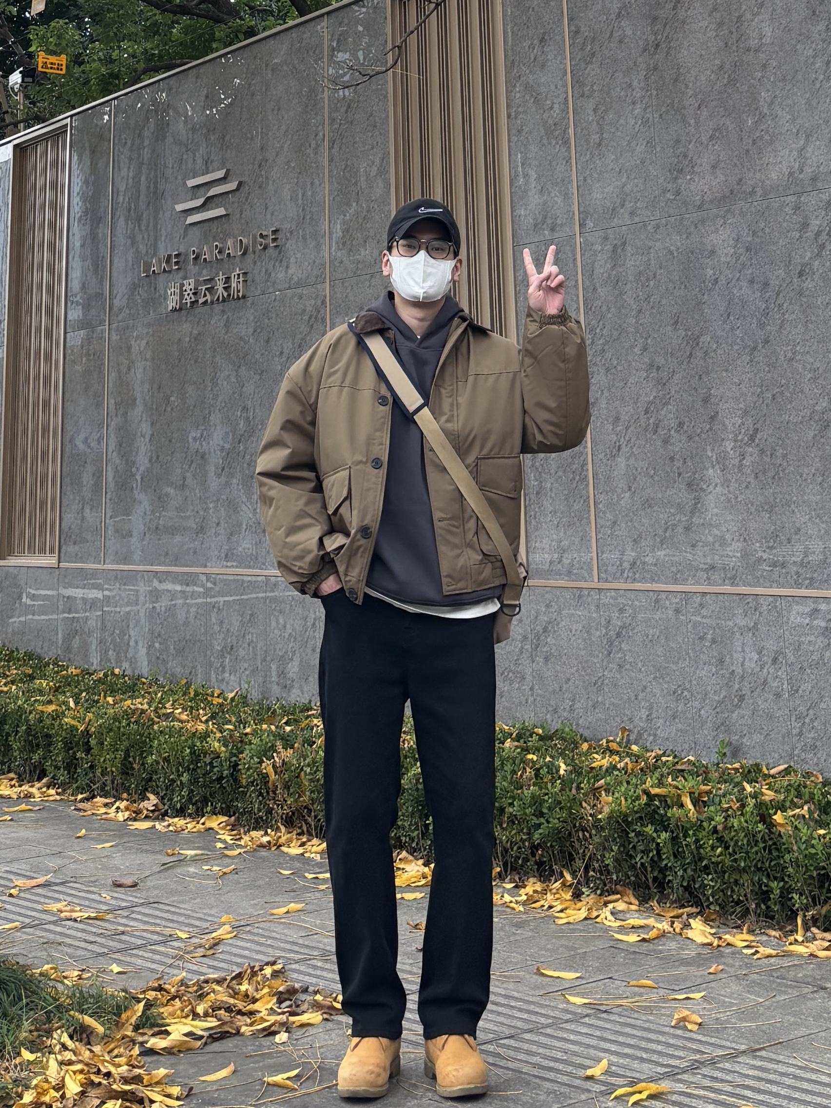 谁说男生不能玩转冬日暖调?卡其色简直是秋冬的“氛围神器”! 深灰色连帽卫衣搭配卡其色工装棉服,打造“暖男酷感”的平衡感,裤子选择黑色的直筒牛仔裤,最后搭上复古工装靴,颜色上更富有层次感,高级感十足🤩 - 衣服裤子:NICE LILI 鞋子:timberland