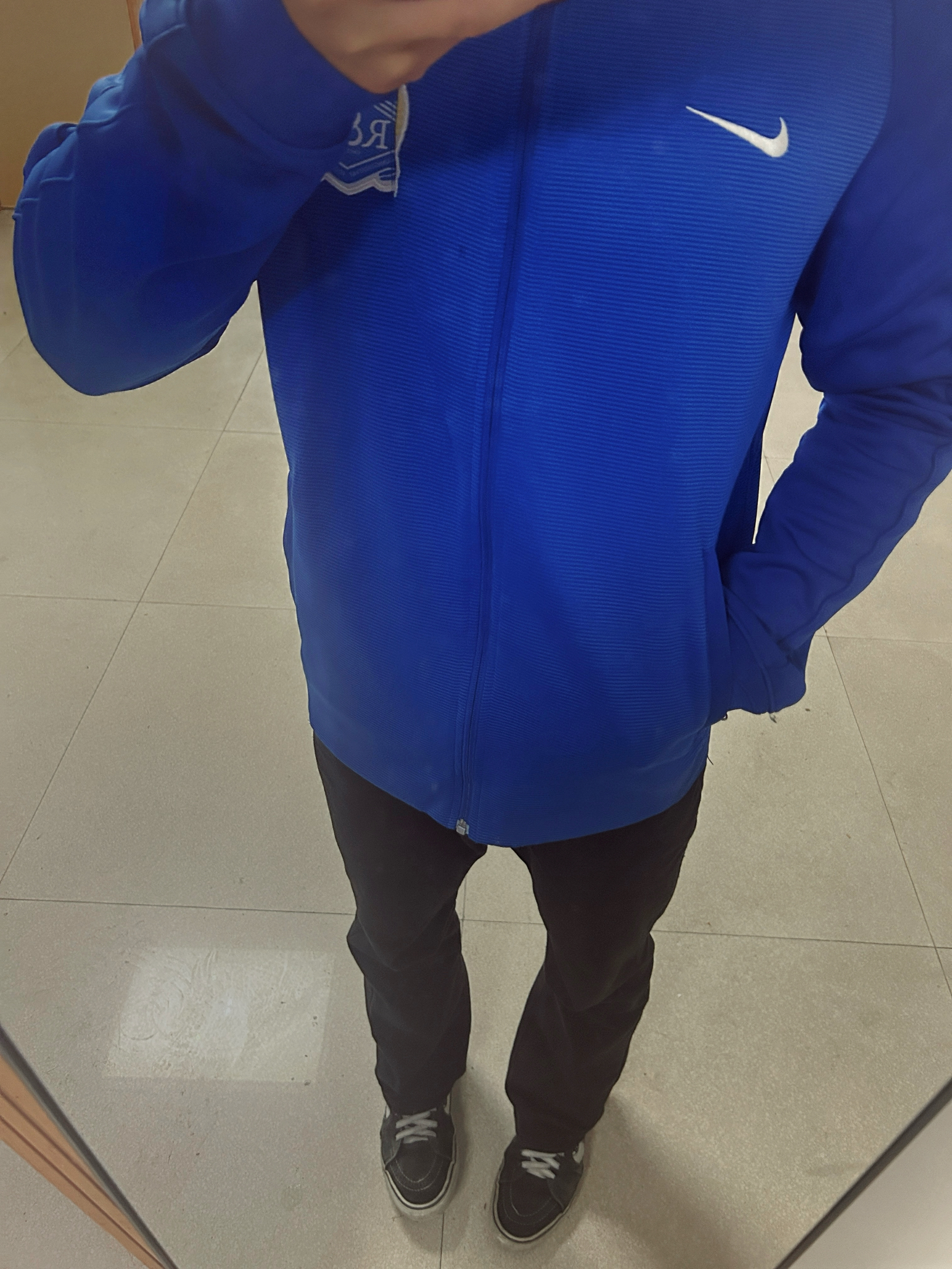 今日上身的是Nike拉链棒球领字母长袖夹克——饱和度刚好的亮蓝色,不扎眼却自带辨识度,棒球领+拉链设计利落又随性,胸口徽章叠加上衣本身的字母细节,低调里藏着质感。搭黑裤出门轻便舒服,是不用费心思也能穿出清爽调调的日常款。