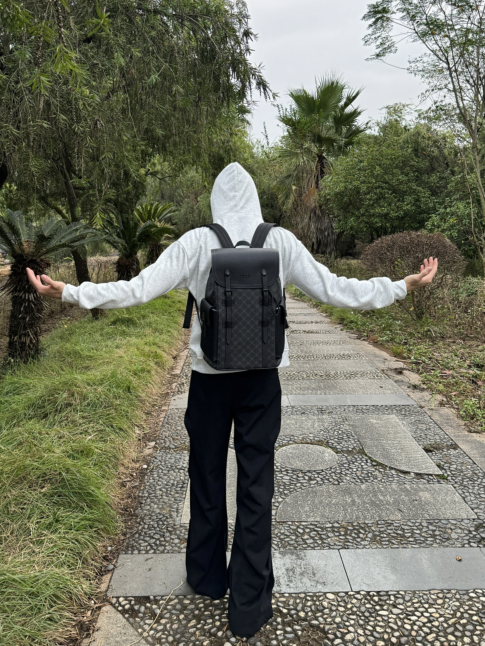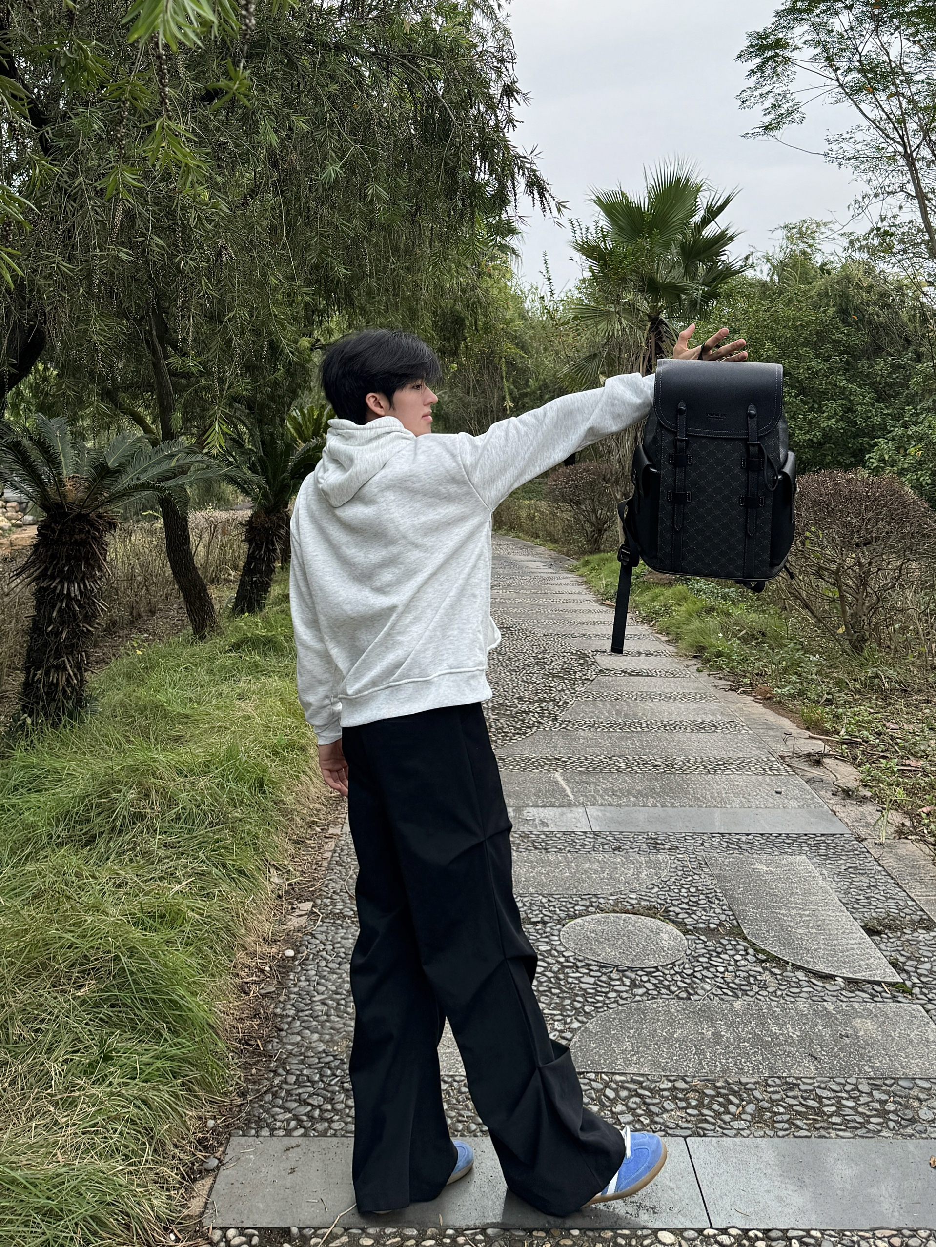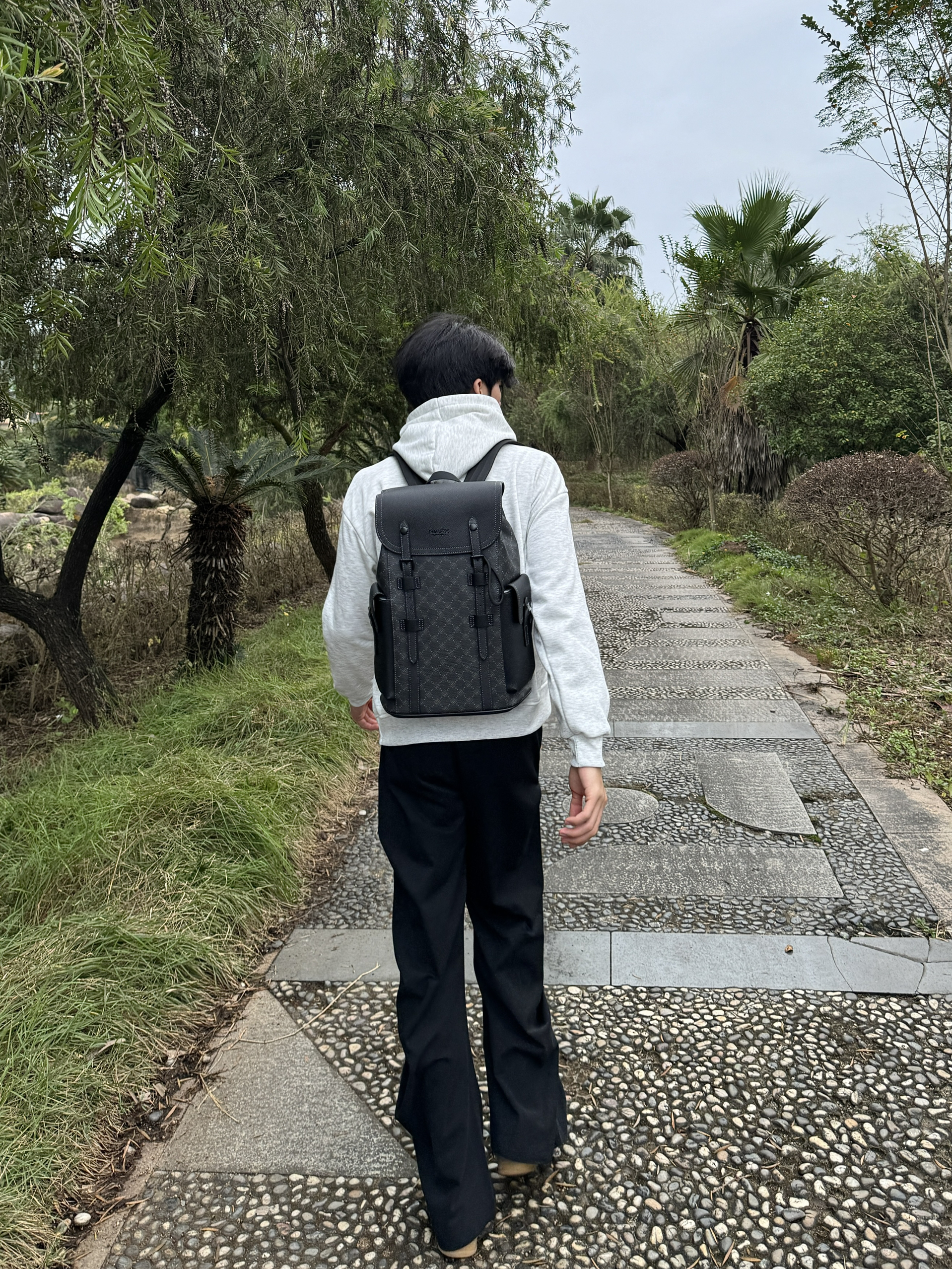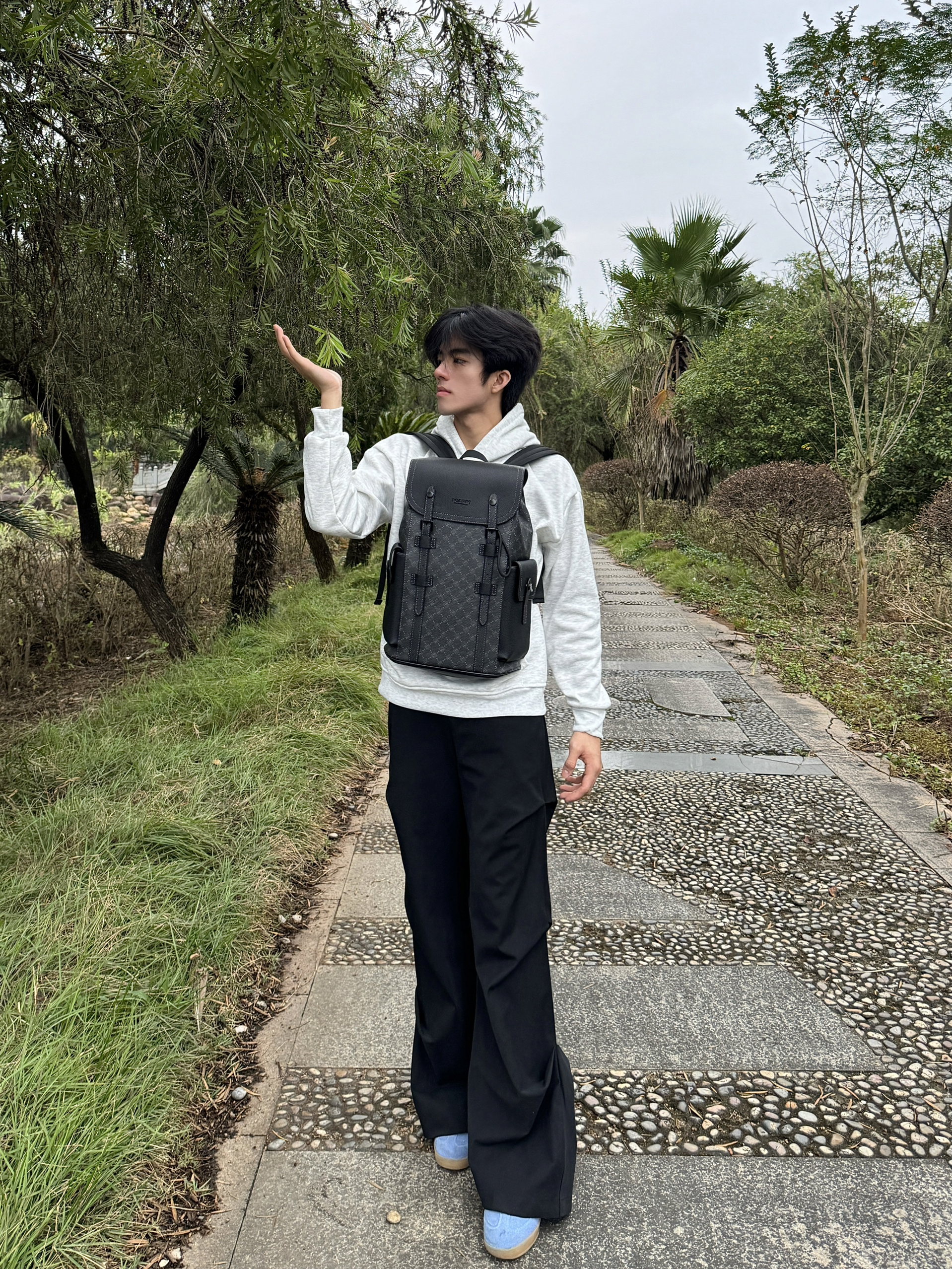 今天逛公园随手拍了几张,身上这件灰卫衣搭这个黑背包还挺和谐的。这个包是前阵子入的,容量比看着大,装笔记本和水杯都没问题,肩带调松点背着也不压肩。材质是那种耐蹭的面料,上周下雨溅了点水,擦一擦就没痕迹了。日常出门不用纠结搭什么,随便套件宽松的衣服都能配,属于最近出门会优先拎的款~