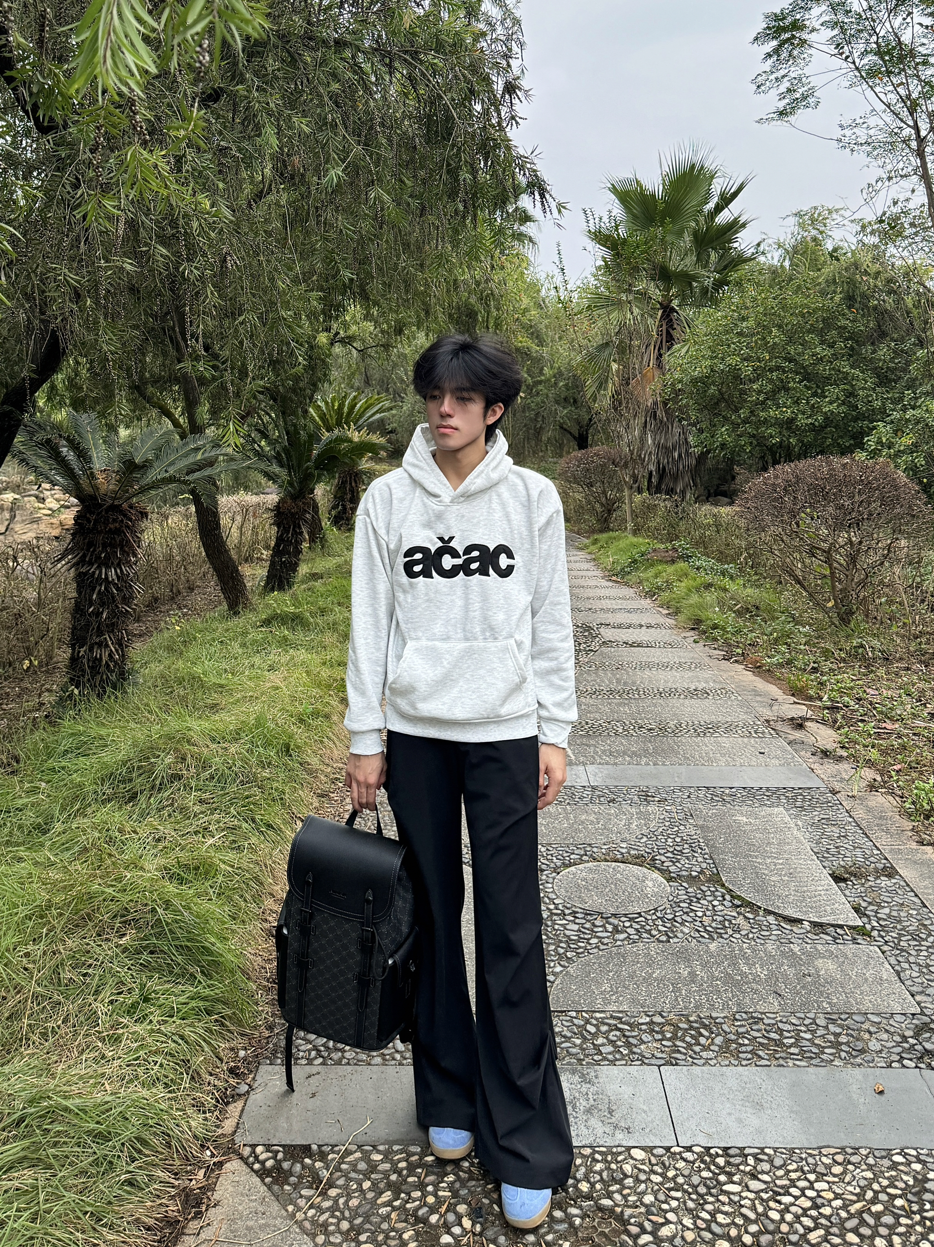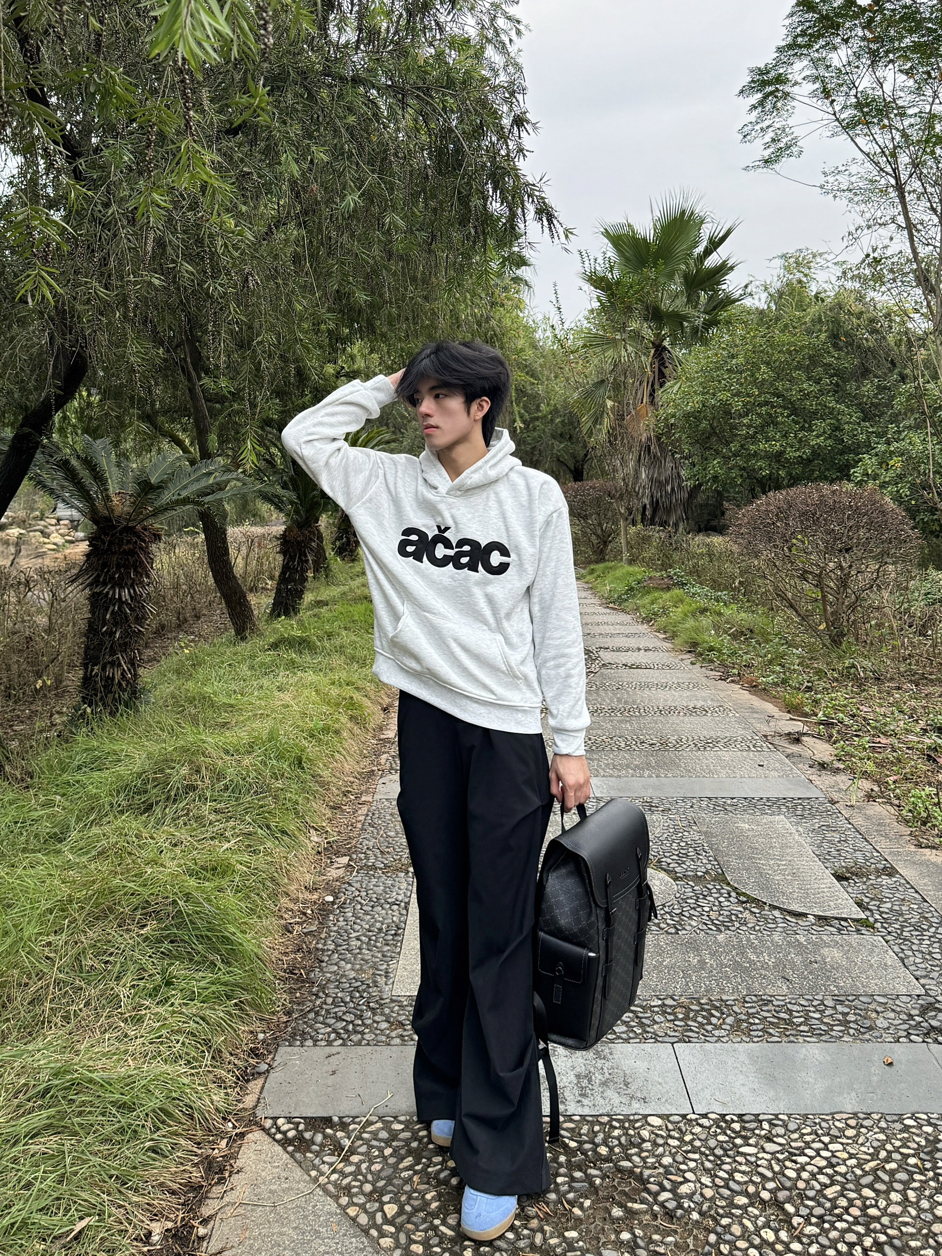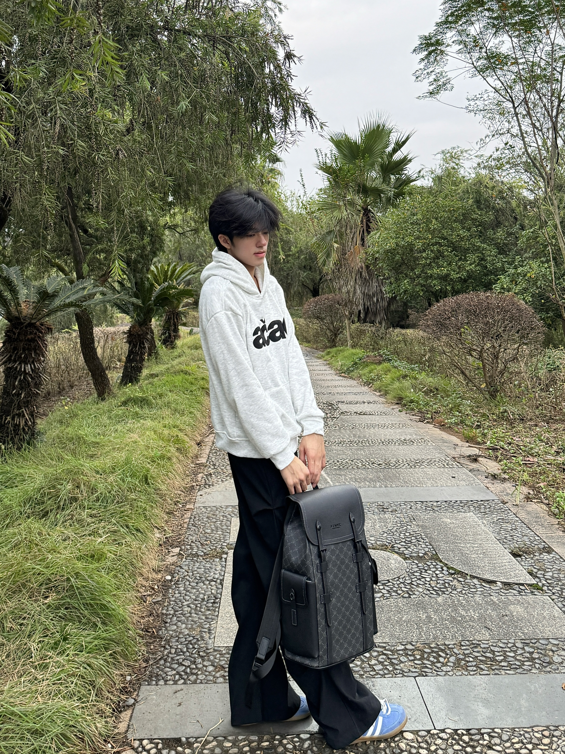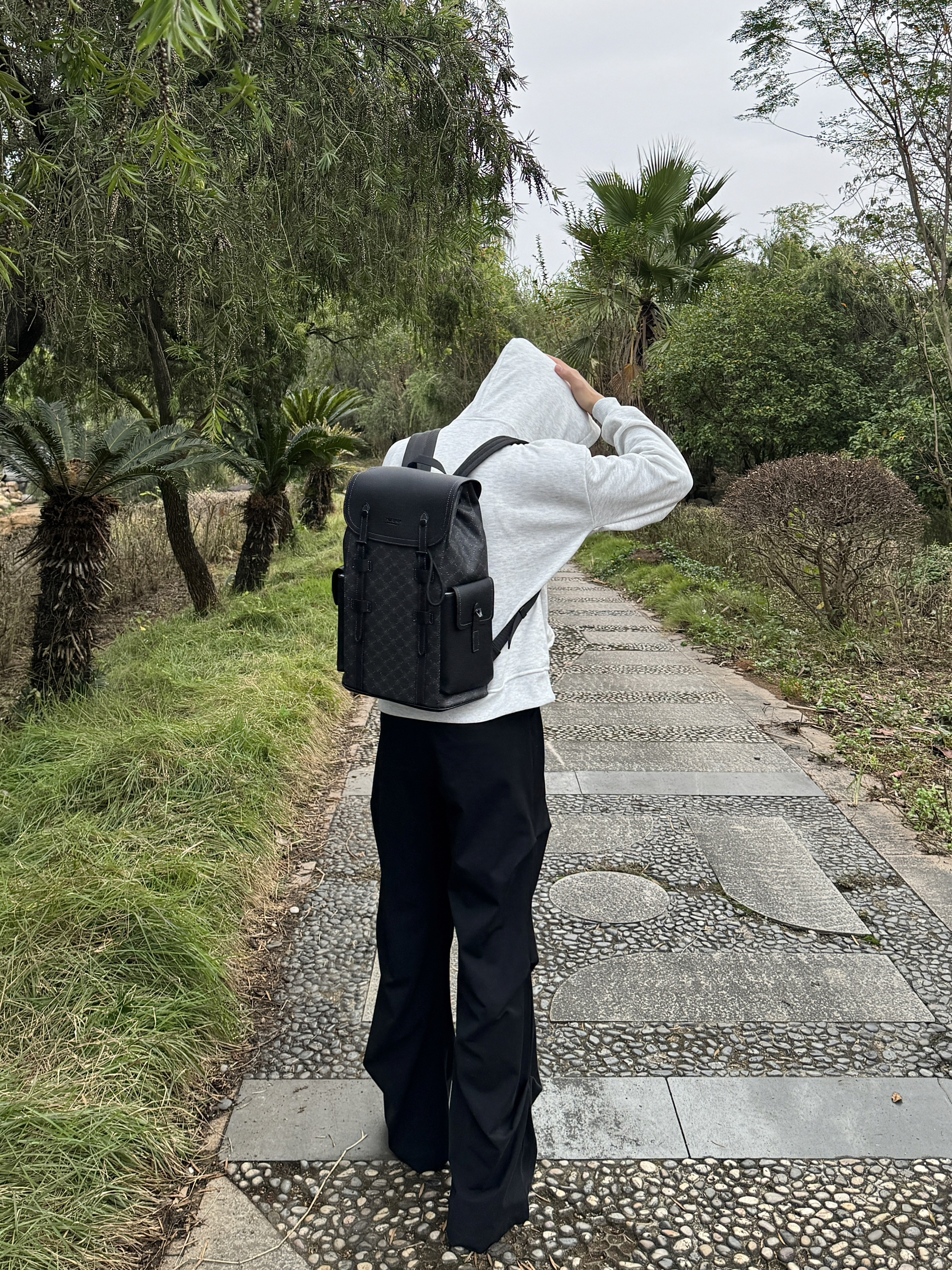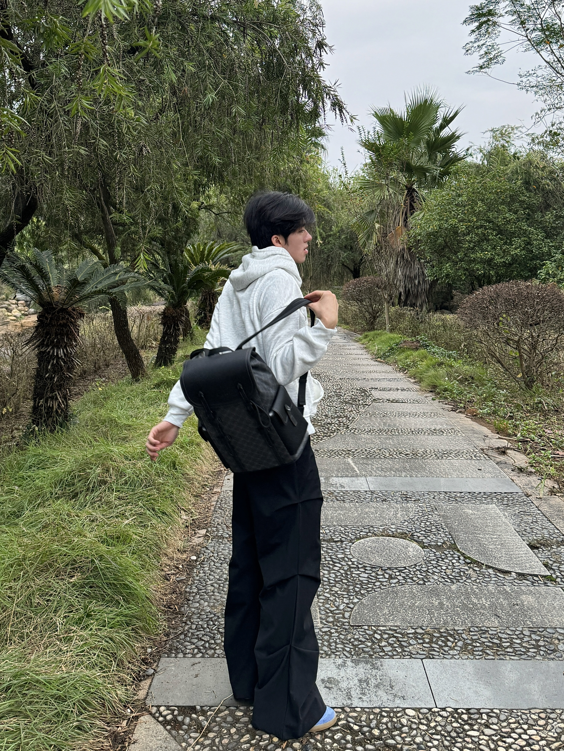今天逛公园随手拍了几张,身上这件灰卫衣搭这个黑背包还挺和谐的。这个包是前阵子入的,容量比看着大,装笔记本和水杯都没问题,肩带调松点背着也不压肩。材质是那种耐蹭的面料,上周下雨溅了点水,擦一擦就没痕迹了。日常出门不用纠结搭什么,随便套件宽松的衣服都能配,属于最近出门会优先拎的款~