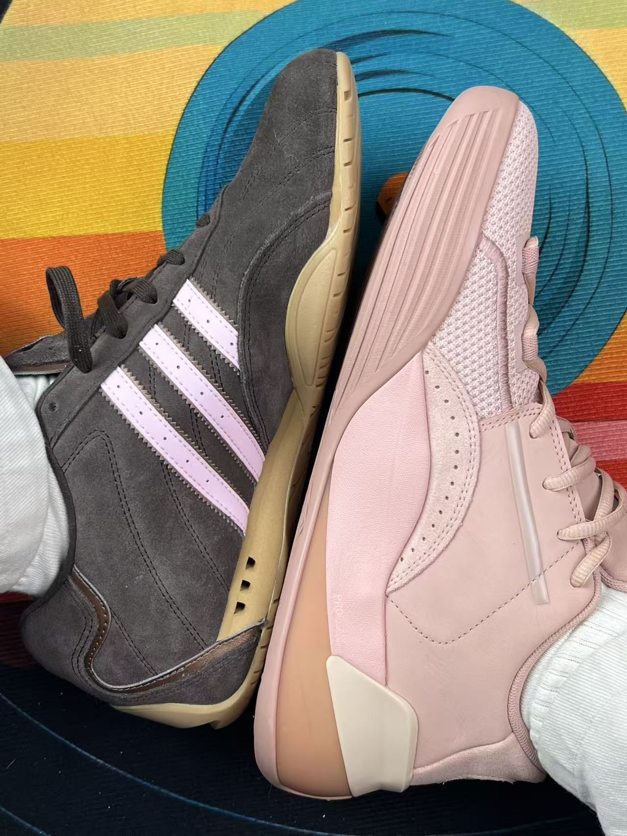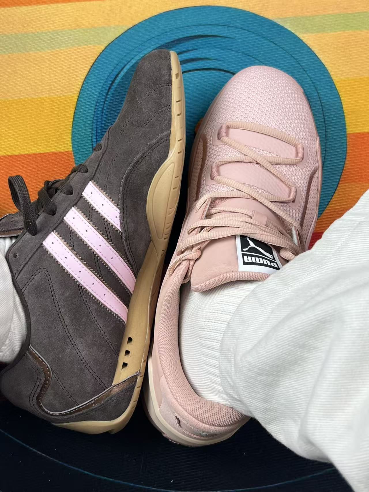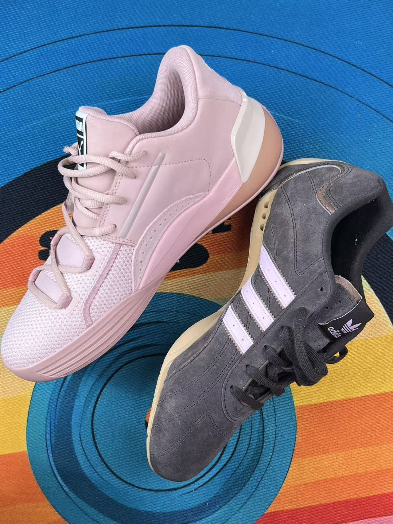 最近凑了双鸳鸯:左边阿迪ADIRACER Lo棕粉,右边彪马Clyde Hardwood裸粉。 先说阿迪这只:麂皮+网面的质感是真耐看,配浅色系裤子很显温柔,但麂皮太容易沾灰,每次出门回来都得拿刷子扫两下;鞋舌有点薄,系紧鞋带时脚背会轻微勒得慌,脚宽的话初期可能挤脚。 再讲彪马这只:裸粉配色软乎乎的,当休闲鞋穿挺舒服,但它本质是篮球鞋,单只重量有点沉,走久了脚踝会轻微发酸;后跟包裹没那么贴,偶尔会...