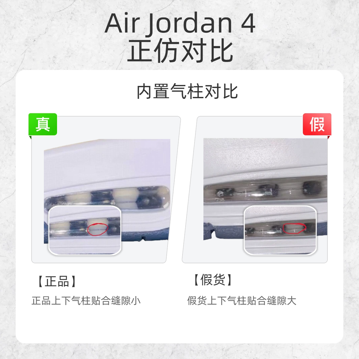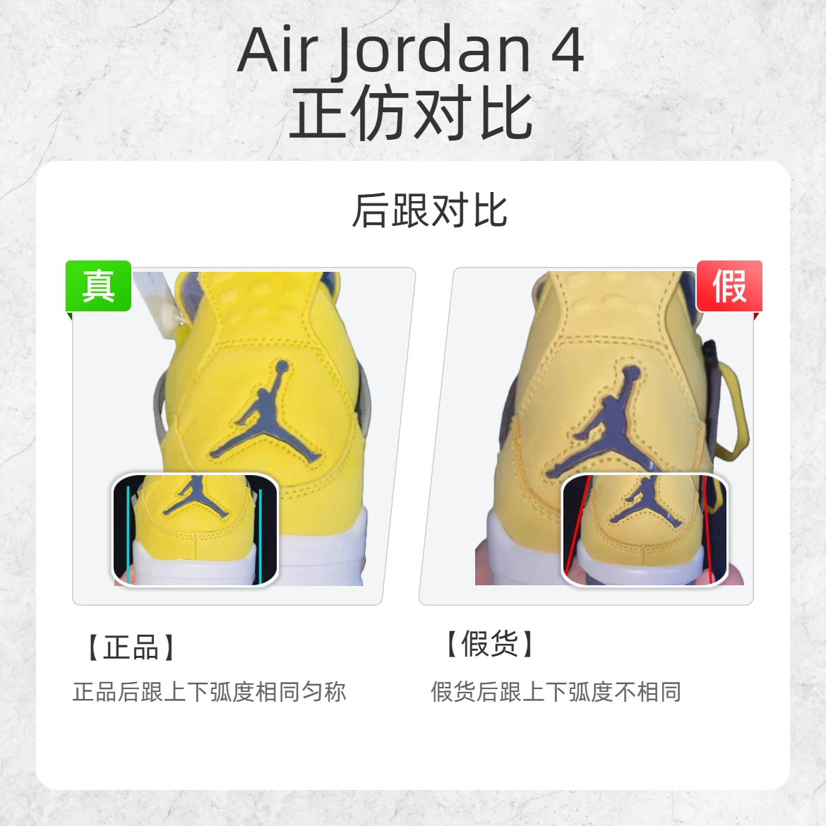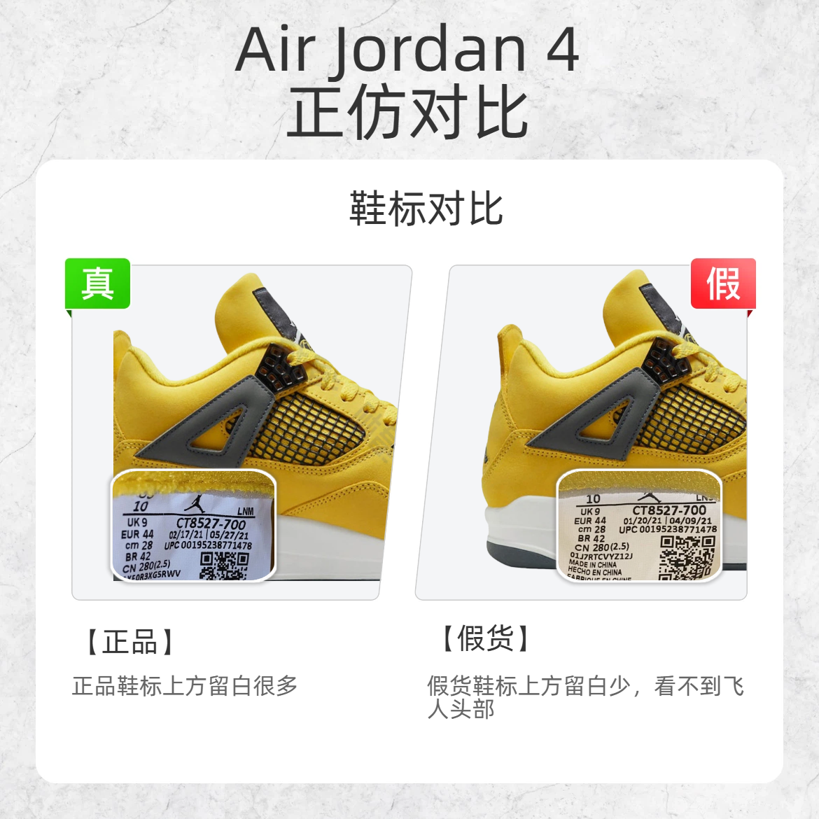 作为球鞋圈的经典款,AJ4 的仿品那叫一个 “猖狂”😤!不少鞋友一不小心就踩坑,今天就给大家上硬货 ——AJ4 真假鉴别三大关键点,看完再也不怕被忽悠! 🔍鉴别点 1:鞋标细节 - 正品:鞋标上方留白多,飞人logo头部清晰可见; - 假货:鞋标上方留白少,看不到飞人头部; 🔍鉴别点 2:后跟弧度 - 正品:后跟上下弧度均匀对称; - 假货:后跟上下弧度不均匀,像“小蛮腰”; 🔍鉴别点 3:...