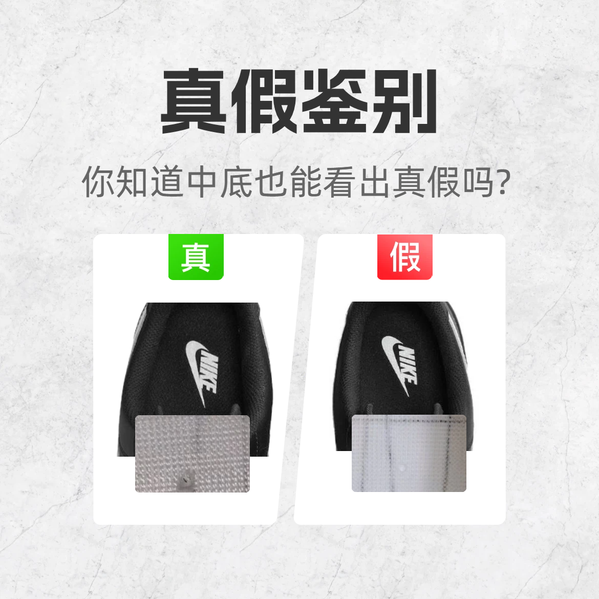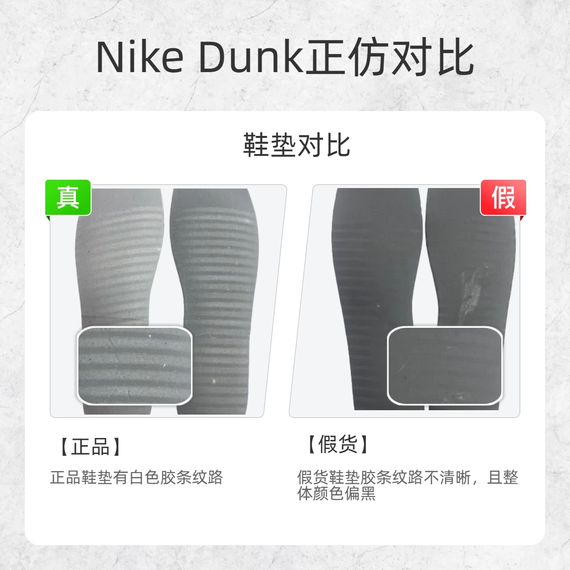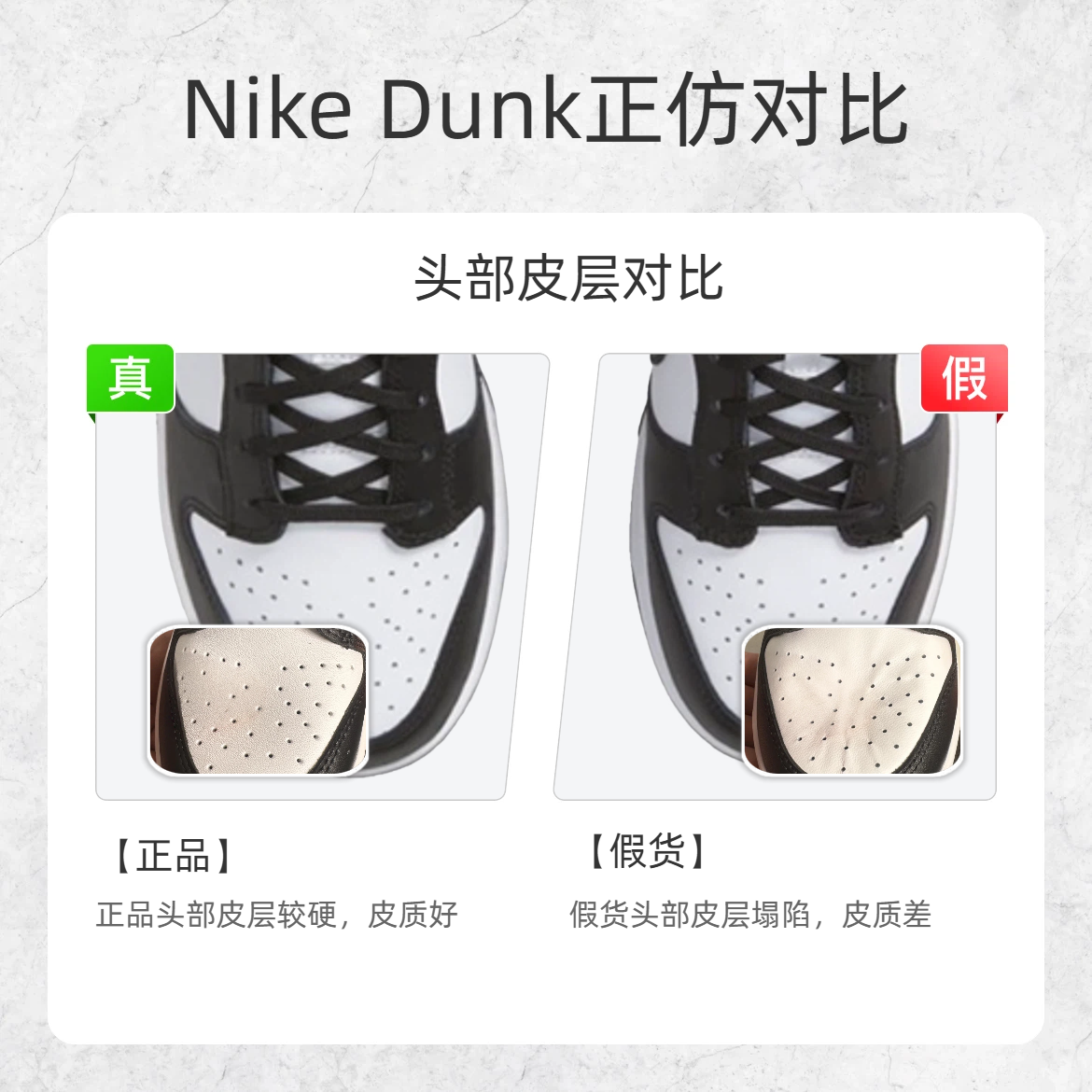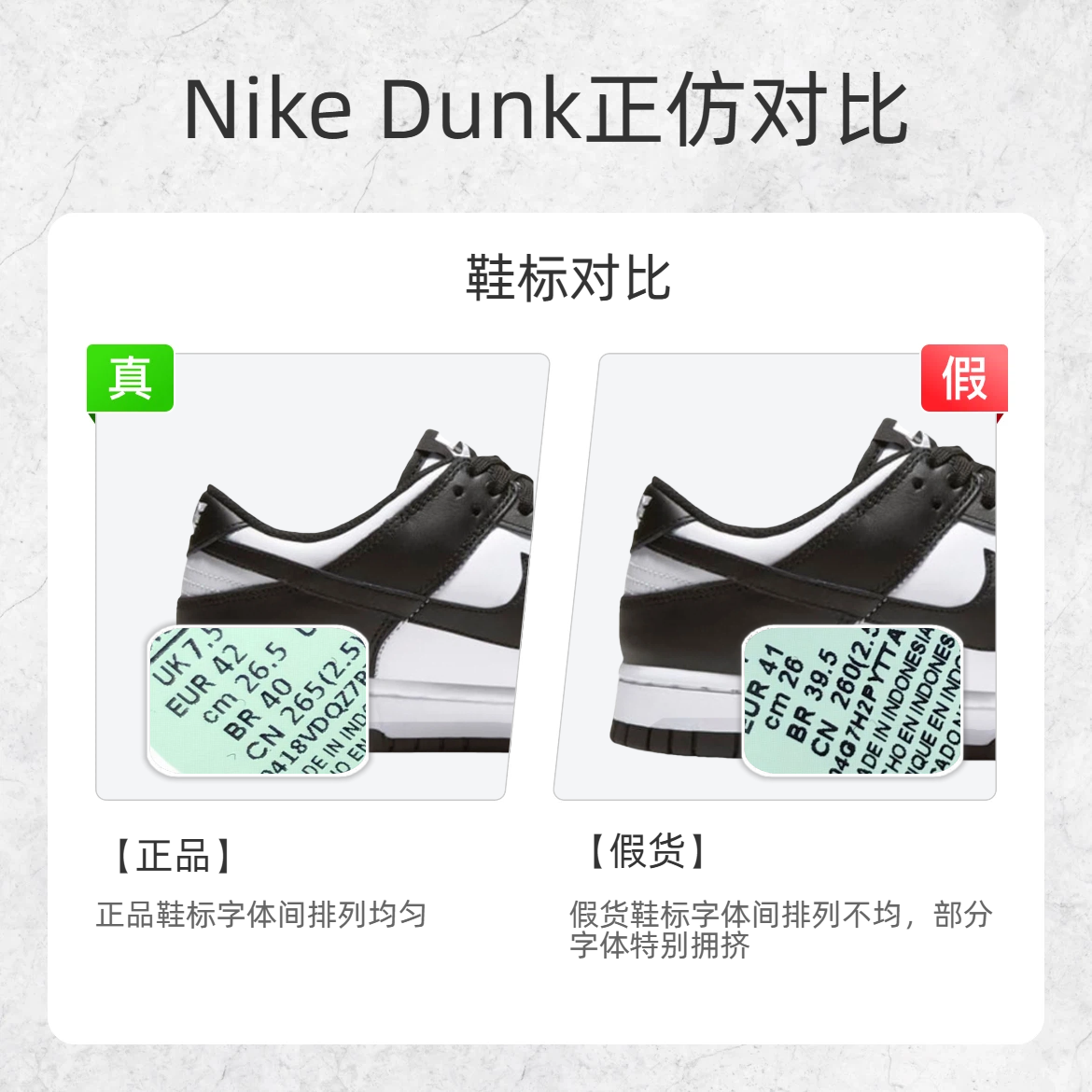 作为潮鞋圈的 “常青树”,Nike Dunk 的仿品那叫一个 “卷”😵💫!不少鞋友踩坑后欲哭无泪,今天小编给大家呈现三个鉴别细节,快快码住告别假鞋! 🔍鉴别点 1:鞋标细节 - 正品:鞋标字体排列均匀,每个字符间距一致; - 假货:鞋标字体挤成一团,部分区域特别拥挤; 🔍鉴别点 2:头部皮层 - 正品:鞋头皮层硬挺有质感,版型饱满立体,皮质细腻高级。 - 假货:鞋头皮层软塌塌陷,版型松垮没型...