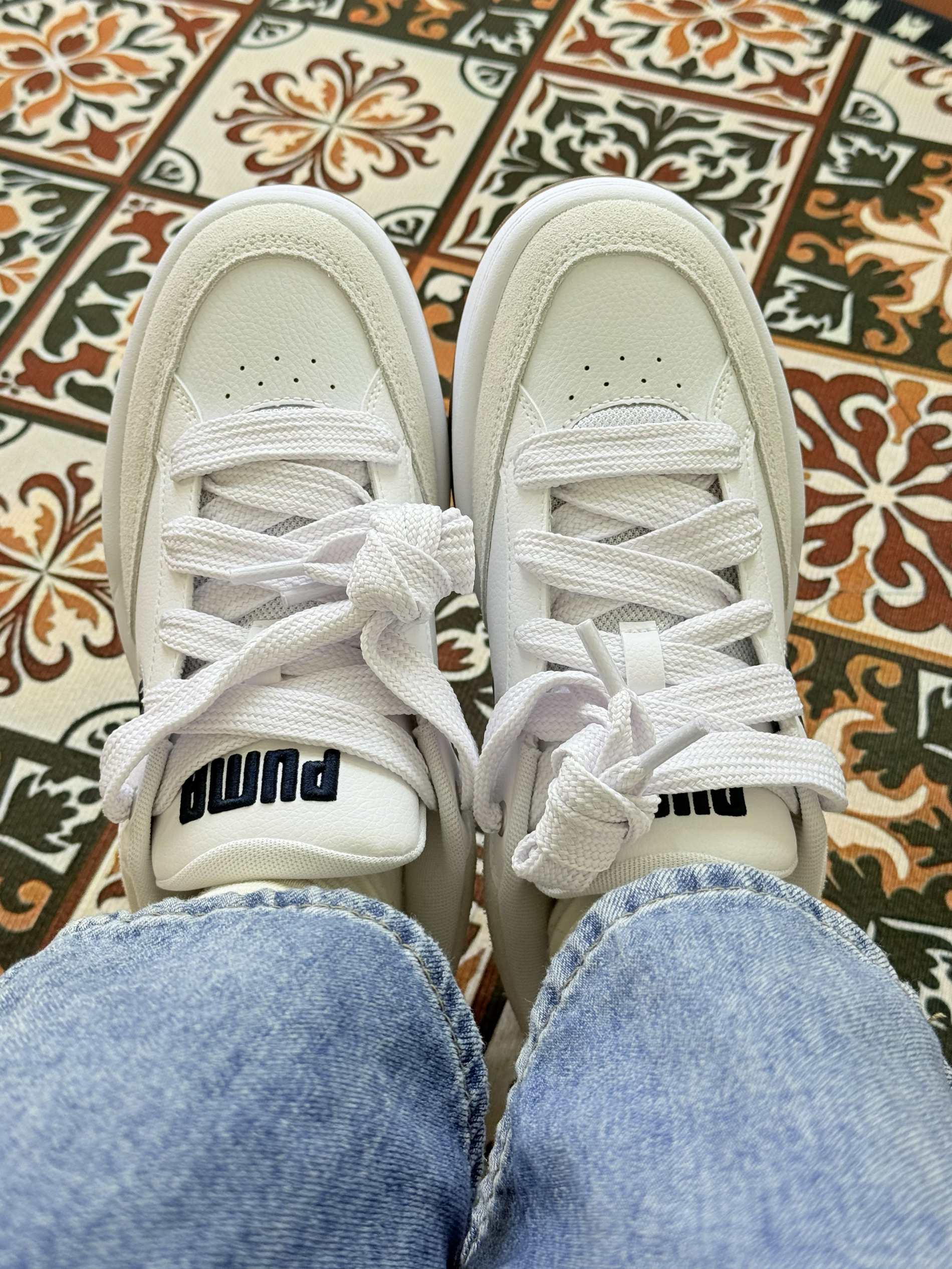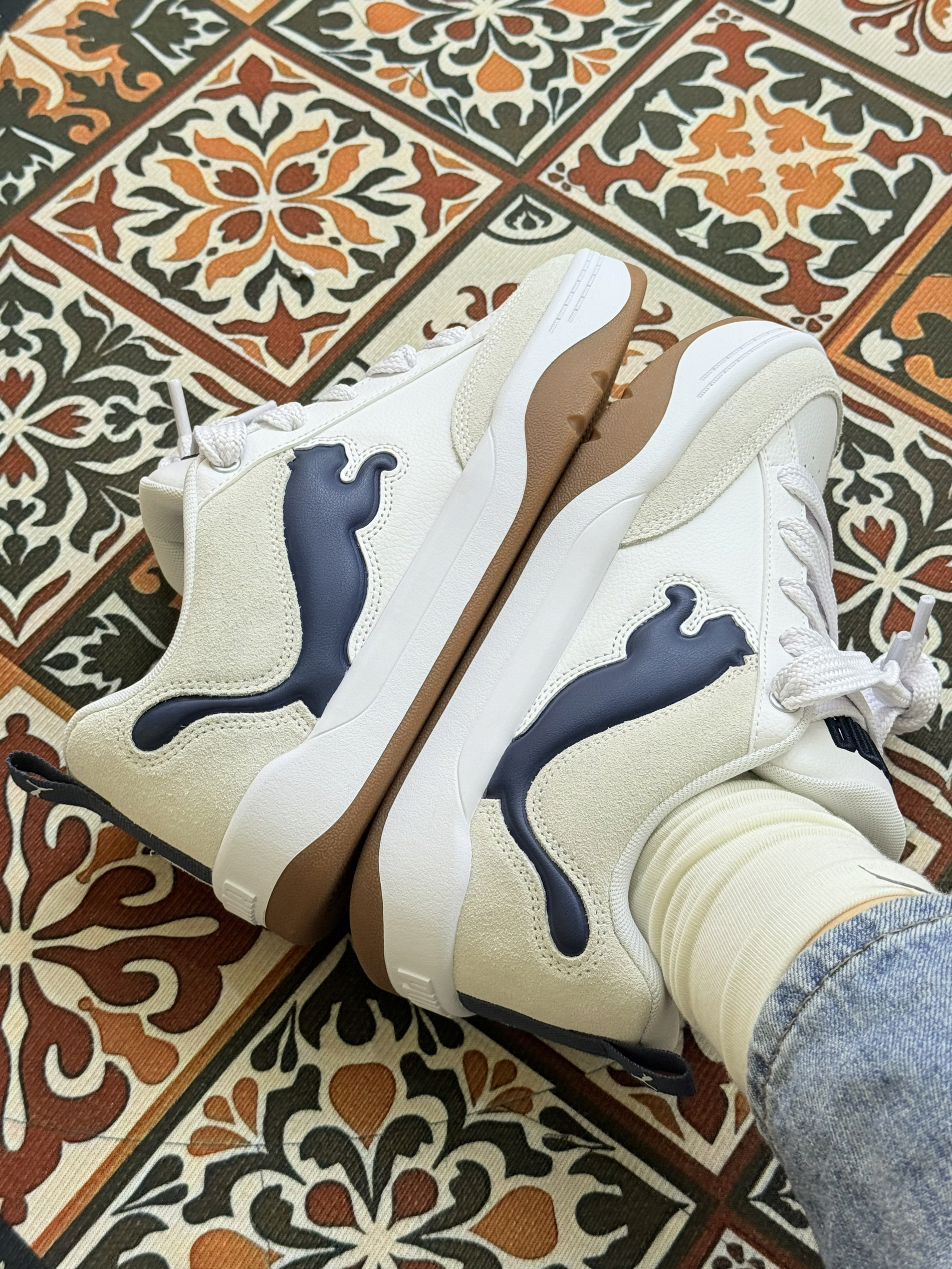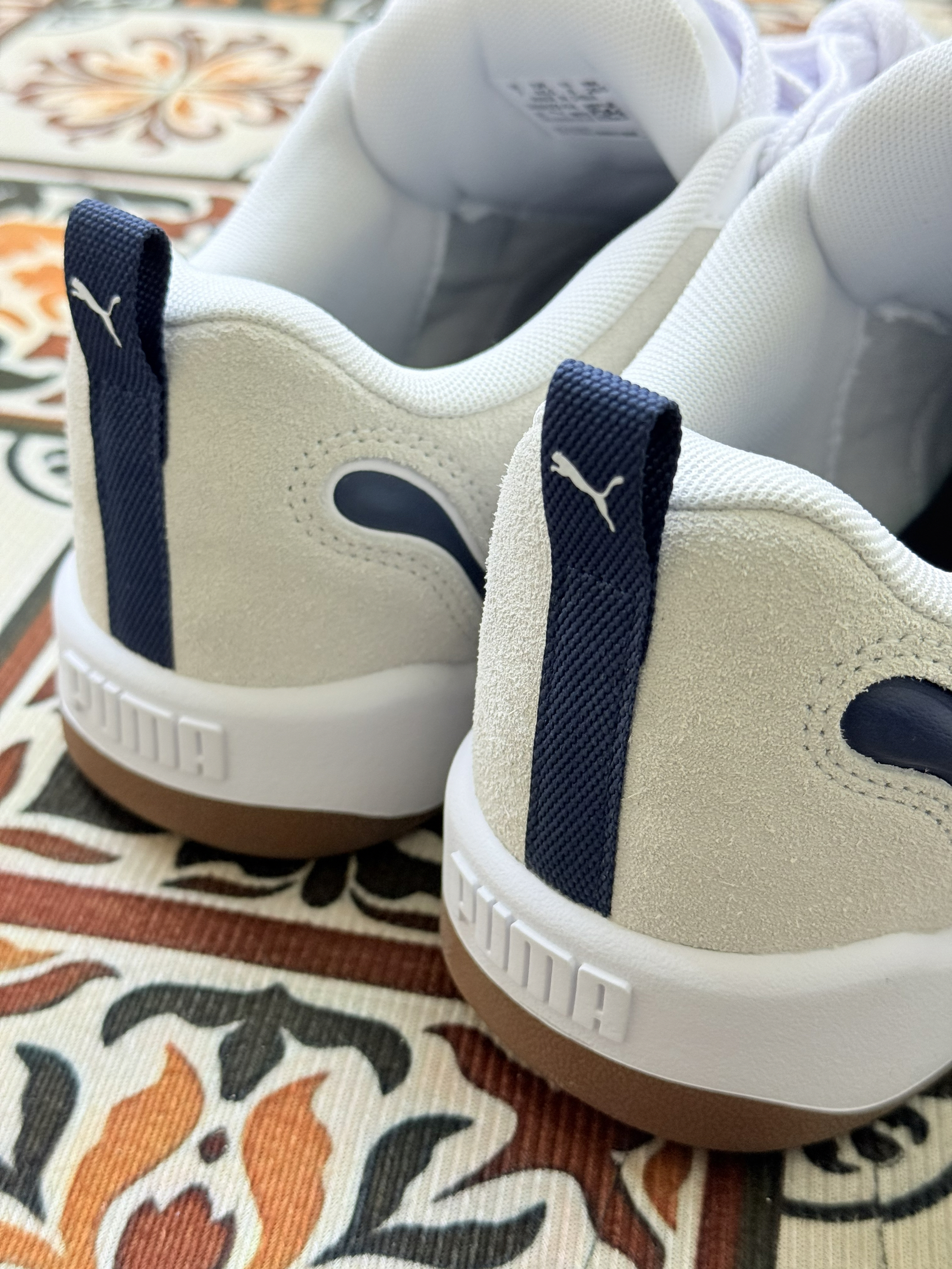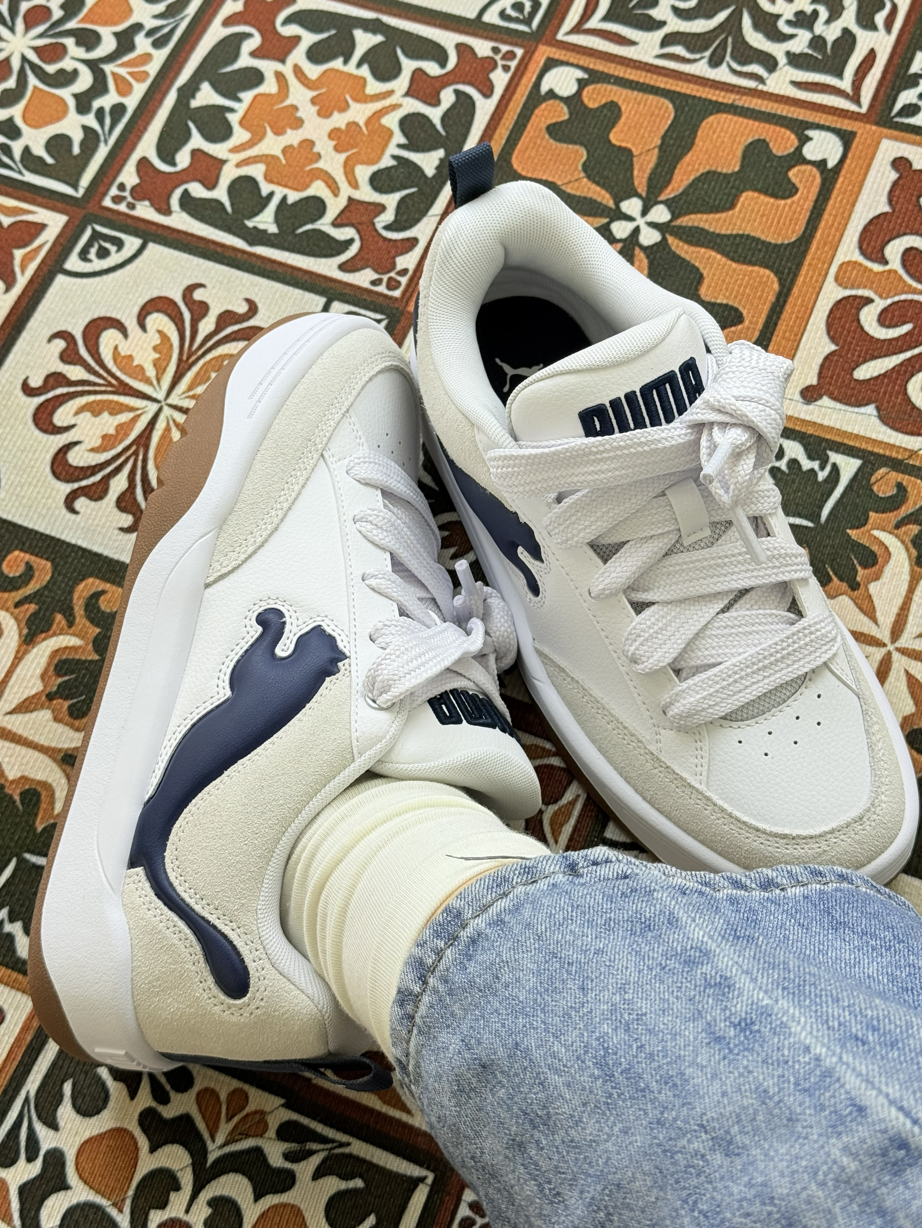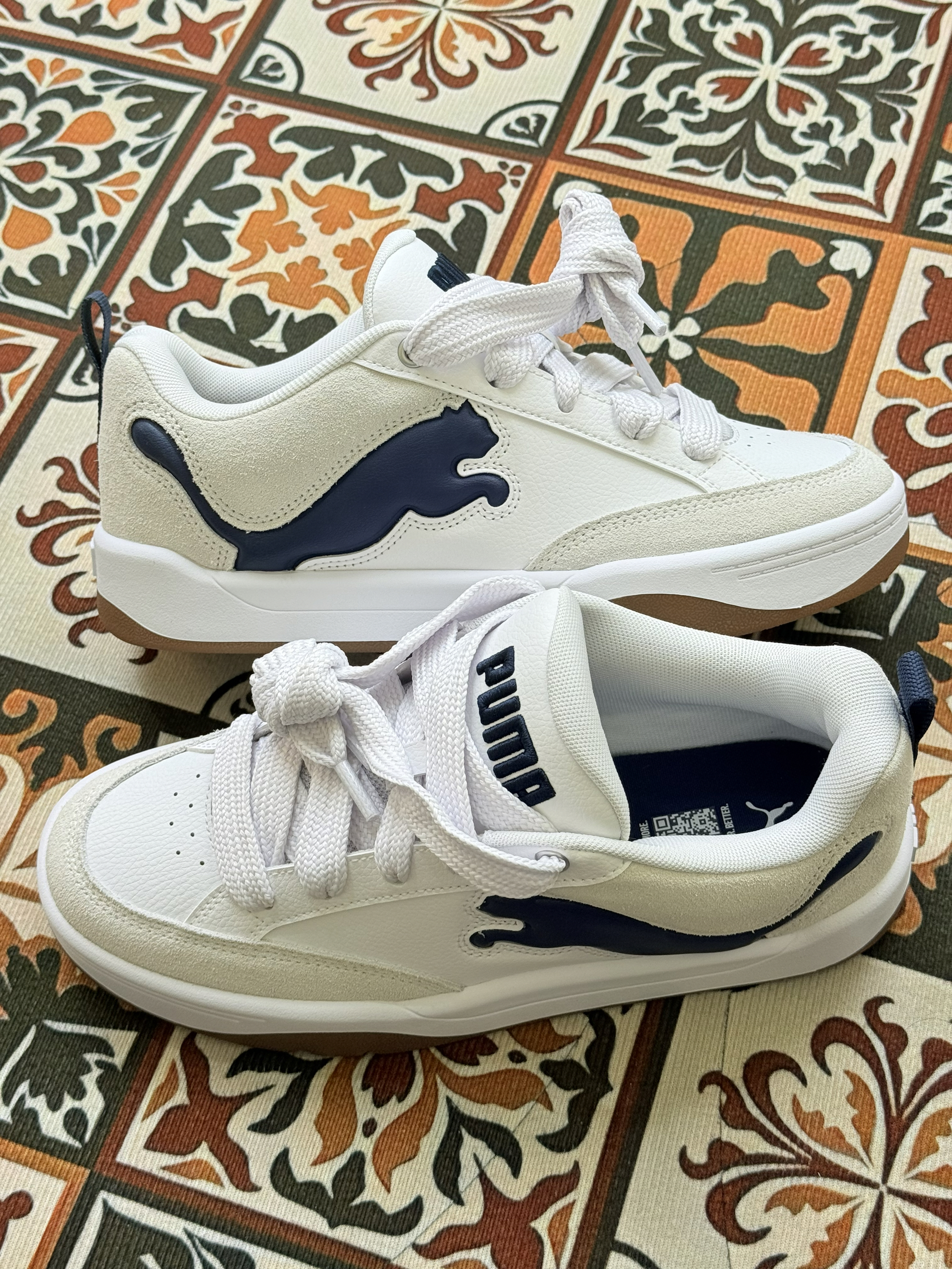 这是PUMA(彪马)旗下的低帮休闲运动鞋,鞋型设计类似“面包鞋”,鞋侧有标志性的深蓝色美洲狮(PUMA Logo)图案,整体风格简约复古。  设计特点: 配色以米白、白色为主,搭配棕色鞋底和深蓝色Logo,撞色和谐且百搭; 鞋面材质疑似皮革与绒面拼接,质感丰富,鞋带为白色,鞋尾有提拉设计; 厚底设计(从鞋底弧度推测),兼具增高与舒适效果。  功能定位:男女同款,主打日常休...