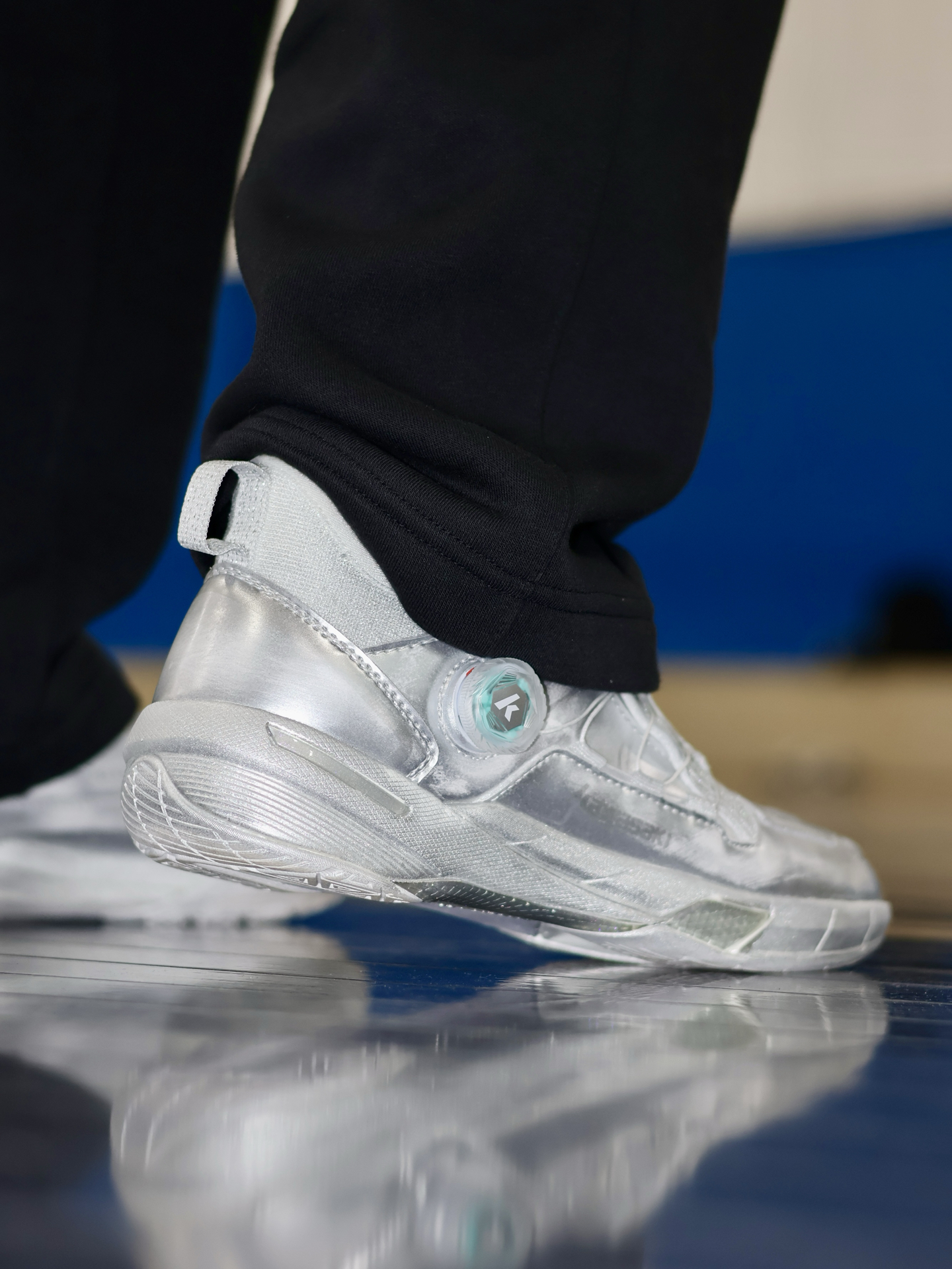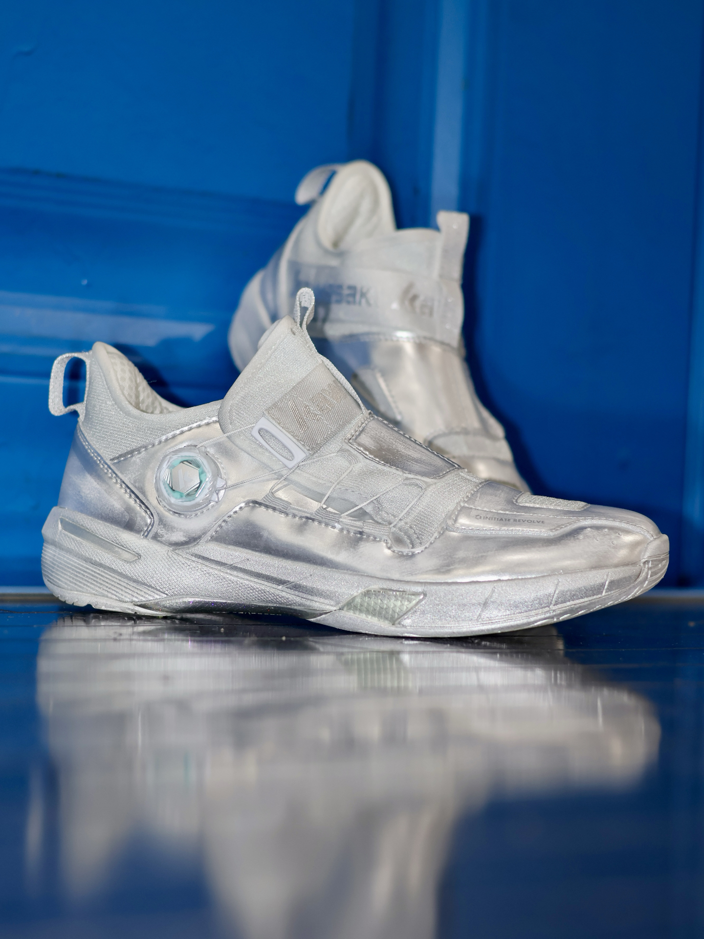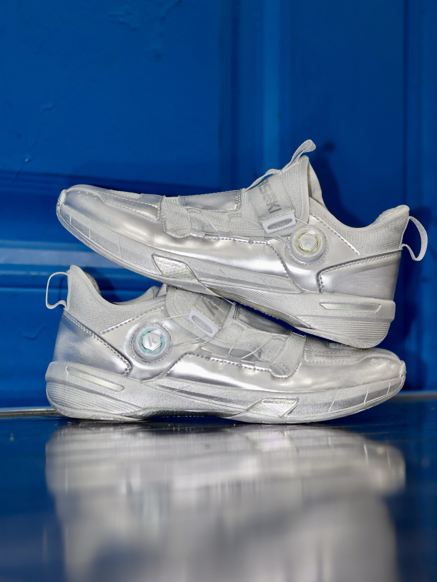 之前就有兄弟问我 羽毛球鞋是不是都是设计老土❓ 其实 很多羽毛球鞋的配置、颜值、脚感 都很前卫 比如穿越2.0 太空银🚀 通体银色的设计 视觉上的观感和立体感没得说 中帮的造型 自动纽扣鞋带 穿脱方便 一体性也强 中底偏硬 但是磨合开比较舒服 内嵌的碳板 也能起到不错的支撑和稳定作用 同时 脚感平顺 重心也比较稳 对于中上体重使用者也比较友好 但要我说 最喜欢的地方 那肯定还是银色系的外观设计...